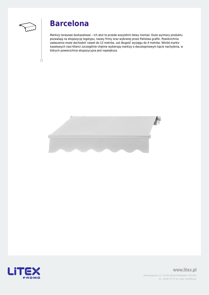Barcelona Markizy tarasowe bezkasetowe – ich atut to przede wszystkim łatwy montaż. Duże wymiary produktu pozwalają na ekspozycję logotypu, nazwy firmy oraz wybranej przez Państwa grafiki. Powierzchnia zadaszenia może dochodzić nawet do 12 metrów, zaś długość wysięgu do 4 metrów. Wśród markiz kasetowych nasi Klienci szczególnie chętnie wybierają markizy o dwustopniowym kącie nachylenia, w których powierzchnia ekspozycyjna jest największa. Barcelona Dane techniczne ........................................................................................................................................................... Poszycie dralon akrylowy Kolor stelaża biały, brązowy, kremowy Kąt nachylenia Klasa wiatrowa 0 - 60 stopni 1 Silnik elektryczny Montaż do elewacji Czujnik słoneczno-wiatrowy tak, dostępny w opcji tak, dostępny w opcji Dowolny kolor stelaża z palety RAL System otwierania korbka tak, dostępny w opcji Czujnik wiatrowy tak, dostępny w opcji Czujnik wstrząsowy tak, dostępny w opcji Daszek nad markizę Pilot do sterowania tak, dostępny w opcji tak, dostępny w opcji Dostępne wymiary ........................................................................................................................................................... Wysięg Szerokość 2.5 3.6 4.2 4.8 5.4 6 7.2 8.4 9.6 10.8 3.0 4.2 4.8 5.4 6 7.2 8.4 9.6 10.8 12 3.5 4.2 4.8 5.4 6 7.2 8.4 9.6 10.8 12 12