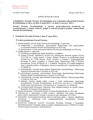 ZARZĄD POWIATU KROŚNIEŃSKIEGO OA.0021.4.2015.KK1 K.rosno, 2015-06-12 SPRAWO ZDANIE z działalności Zarządu Powiatu Krośnieńskiego oraz wykonania uchwał Rady Powiatu Krośnieńskiego za okres od dnia 16 maja 2015 r. do dnia 12 czerwca 2015 r. Zarząd Powiatu Krośnieńskiego w okresie sprawozdawczym obradował na 2 posiedzeniach, w trakcie których podjął 11 uchwał, przyjął 3 projekty uchwał Rady Powiatu Krośnieńskiego I. Posiedzenie Zarządu Powiatu w dniu 27 maja 2015 r. W trakcie posiedzenia 1) 2) 3) 4) 5) Zarząd Powiatu: przyjął projekty uchwał Rady Powiatu K.rośnieńskiego w sprawach: a) rozpatrzenia i zatwierdzenia sprawozdania finansowego oraz sprawozdania z wykonania budżetu Powiatu K.rośnieńskiego za 2014 rok, b) absolutorium z tytułu wykonania budżetu Powiatu K.rośnieńskiego za 2014 rok, podjął uchwały w sprawach: a) określenia szczegółowego planu dochodów i wydatków, b) zmiany Uchwały budżetowej na 2015 rok. Zmniejszono dochody ogółem o kwotę 79.217,00 zł z tytułu dotacji z Gminy Miejsce Piastowe na przebudowę drogi powiatowej Nr l 976R K.rosno - Rogi - Iwonicz w związku z rozstrzygnięciem przetargu. W planie wydatków w ramach planu finansowego PZD w K.rośnie przeniesiono kwotę 40.000,00 zł z wydatków bieżących na wydatki majątkowe oraz w ramach projektu „Podkarpacie stawia na zawodowców" przeniesiono kwotę 47.000,00 zł , c) zatwierdzenia rocznego sprawozdania finansowego Samodzielnego Publicznego Pogotowia Ratunkowego w K.rośnie za 2014 rok, d) zatwierdzenia rocznego sprawozdania finansowego Samodzielnego Publicznego Zakładu Opieki Stomatologicznej w K.rośnie za 2014 rok, e) zatwierdzenia rocznego sprawozdania finansowego Muzeum Historycznego-Pałac w Dukli za 2014 rok, f) ustalenia terminu zapłaty opłaty rocznej z tytułu użytkowania wieczystego nieruchomości Powiatu K.rośnieńskiego za 2015 rok I dot. Sp. z o. o. KROSBUS, użytkowanie nieruchomości w K.rośnie przy ul. Tysiąclecia i ul. Naftowej/, g) wyrażenia opinii dotyczącej zaliczenia dróg zlokalizowanych na terenie Gminy Rymanów do kategorii dróg gminnych, przyjął informację z wykonania budżetu Powiatu K.rośnieńskiego za 2014 rok. zapoznał się z informacją o liczbie uczniów, oddziałów oraz stanie zatrudnienia pracowników administracji i obsługi w projekcie roku szkolnego 2015/2016, zatwierdził rozstrzygnięcie konkursu ofert na realizację zadań z zakresu rehabilitacji zawodowej i społecznej osób niepełnosprawnych mieszkańców Powiatu K.rośnieńskiego , 6) pozytywnie rozpatrzył Naczelnika Wydziału Geodezji i Gospodarki zgodę na zapłatę uzgodnionej kwoty 2.500,00 zł z tytułu wniosek Nieruchomościami wyrażając bezumownego korzystania z nieruchomości , 2 wniosek Naczelnika Wydziału Oświaty i Spraw Społecznych wyrażając zgodę na przesunięcie dotacji na prace remontowo konserwatorskie zabytku I z zadania wykonanie prac konserwatorskich i restauratorskich przy XVIII wiecznych ołtarzach bocznych i nawy głównej i chrzcielnicy - etap II na zadanie „Jaśliska, Katarzyny Aleksandryjskiej , ołtarz, główny , konserwacja kościół p. w. św. i restauracja, II etap prac"/, 8) zapoznał się z wnioskiem Dyrektora Zespołu Szkół Gastronomiczno-Hotelarskich w Iwoniczu-Zdroju dot. przyznania środków finansowych na remont pomieszczeń w internacie, 9) pozytywnie rozpatrzył wniosek Dyrektora Zespołu Szkół GastronomicznoHotelarskich w Iwoniczu-Zdroju dot. ufundowania nagród dla zwycięzców III Rajdu im. dr Józefa Aleksiewicza, 10) pozytywnie rozpatrzył wniosek Dyrektora Zespołu Szkół w Iwoniczu dot. ufundowania nagród dla uczestników zlotu pojazdów zabytkowych i motocykli, 11) pozytywnie rozpatrzył wniosek Dyrektora Muzeum Podkarpackiego w Krośnie dot. ufundowania nagród rzeczowych dla uczestników konkursu „Krosno i powiat krośnieński - historia i współczesność", 12) pozytywnie rozpatrzył wniosek Przewodniczącego Rady Towarzystwa na Rzecz Rozwoju Muzeum Kultury Łemkowskiej w Zyndranowej dot. wsparcia organizacji święta kultury i tradycji łemkowskiej „Od Rusal do Jana 2015", 13) pozytywnie rozpatrzył wniosek Dyrektora Domu Dziecka im. J. Korczaka w Długiem dot. objęcia patronatem VI Wojewódzkich Mistrzostw Podkarpacia Placówek Opiekuńczo-Wychowawczych w siatkówce o Puchar Posła na Sejm RP Piotra Babinetza oraz ufundowania nagrody dla zwycięskiej drużyny, 14) pozytywnie rozpatrzył wniosek Józefa Sołtysika w sprawie rozwiązania urnowy najmu boksu garażowego na Bazie Transportowej przy ul. Sikorskiego, 15) przyjął wniosek Firmy Orto-Res Sp. z o. o. w sprawie wypowiedzenia urnowy najmu pomieszczenia w budynku Starostwa, 16) zapoznał się z wnioskiem Przewodniczącej Zarządu Osiedla Jedlicze - Borek dot. budowy chodnika przy ul. Sikorskiego, 17) zapoznał się z pismem Starosty Sanockiego dot. podjęcia działań zmierzających do zwiększenia dofinansowania publicznej służby zdrowia. 7) pozytywnie rozpatrzył II. Posiedzenie Zarządu Powiatu w dniu 10 czerwca 2015 r. W trakcie posiedzenia Zarząd Powiatu: 1) przyjął projekt uchwały Rady Powiatu Krośnieńskiego w sprawie zatwierdzenia realizacji projektu pozakonkursowego „Aktywizacja osób powyżej 29 roku życia pozostających bez pracy w powiecie krośnieńskim (I), 2) podjął uchwały w sprawach: a) zmiany Uchwały budżetowej na 2015 rok. Zwiększono plan dochodów ogółem o kwotę 280.000,00 zł w tym: dotacja z Gminy Dukla w kwocie 60.000,00 zł oraz dotacja na usuwanie skutków klęsk żywiołowych w kwocie 220.000,00 zł. W planie wydatków zmniejszono wydatki na przebudowę drogi powiatowej Nr 1994R lwla - Teodorówka - Dukla w związku z rozstrzygnięciem przetargu oraz w ramach planu finansowego w Dziale Kultura fizyczna przeniesiono kwotę 4.000,00 zł, b) umorzenia zaległości z tytułu najmu nieruchomości Skarbu Państwa wraz z odsetkami /dot. najmu lokalu w Barwinku/, 3 powołania komisji konkur