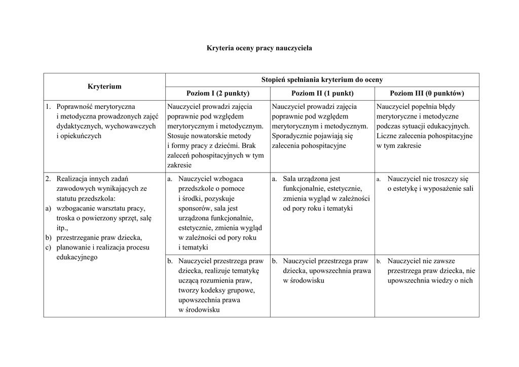 Kryteria oceny pracy nauczyciela Stopień spełniania kryterium do oceny Kryterium Poziom I (2 punkty) Poziom II (1 punkt) Poziom III (0 punktów) 1. Poprawność merytoryczna i metodyczna prowadzonych zajęć dydaktycznych, wychowawczych i opiekuńczych Nauczyciel prowadzi zajęcia poprawnie pod względem merytorycznym i metodycznym. Stosuje nowatorskie metody i formy pracy z dziećmi. Brak zaleceń pohospitacyjnych w tym zakresie Nauczyciel prowadzi zajęcia poprawnie pod względem merytorycznym i metodycznym. Sporadycznie pojawiają się zalecenia pohospitacyjne Nauczyciel popełnia błędy merytoryczne i metodyczne podczas sytuacji edukacyjnych. Liczne zalecenia pohospitacyjne w tym zakresie 2. Realizacja innych zadań zawodowych wynikających ze statutu przedszkola: a) wzbogacanie warsztatu pracy, troska o powierzony sprzęt, salę itp., b) przestrzeganie praw dziecka, c) planowanie i realizacja procesu edukacyjnego a. Nauczyciel wzbogaca przedszkole o pomoce i środki, pozyskuje sponsorów, sala jest urządzona funkcjonalnie, estetycznie, zmienia wygląd w zależności od pory roku i tematyki a. Sala urządzona jest a. Nauczyciel nie troszczy się funkcjonalnie, estetycznie, o estetykę i wyposażenie sali zmienia wygląd w zależności od pory roku i tematyki b. Nauczyciel przestrzega praw dziecka, realizuje tematykę uczącą rozumienia praw, tworzy kodeksy grupowe, upowszechnia prawa w środowisku b. Nauczyciel przestrzega praw b. Nauczyciel nie zawsze dziecka, upowszechnia prawa przestrzega praw dziecka, nie w środowisku upowszechnia wiedzy o nich c. Nauczyciel planuje pracę zgodnie z ustaleniami w przedszkolu, integruje treści wychowawcze oraz kształcenia, osiąga sukcesy w pracy dydaktycznej i wychowawczej c. Nauczyciel planuje pracę zgodnie z ustaleniami w przedszkolu, integruje treści wychowawcze oraz kształcenia c. 3. Kultura i poprawność języka własnego, troska o kulturę języka dzieci Nauczyciel jest wzorem poprawności języka. Systematycznie prowadzi z dziećmi ćwiczenia: wzbogacające słownictwo, ortofoniczne, gramatyczne Nauczyciel poprawnie stosuje język polski. Prowadzi ćwiczenia wzbogacające słownictwo oraz ortofoniczne Język nauczyciela jest niedbały, nauczyciel rzadko stosuje ćwiczenia wzbogacające słownictwo, nie prowadzi z dziećmi ćwiczeń ortofonicznych ani gramatycznych 4. Pobudzanie inicjatywy dzieci Nauczyciel systematycznie wykorzystuje nowoczesne metody aktywizujące, korzysta w pracy z metody projektu Nauczyciel czasami korzysta z metod aktywizujących, poprawnie wykorzystuje tradycyjne metody Nauczyciel stosuje metody podające, mała aktywność dzieci na zajęciach 5. Zachowanie odpowiedniej dyscypliny dzieci na zajęciach, troska o bezpieczeństwo Nauczyciel ma wypracowane Nauczyciel ma wypracowane sposoby dyscyplinowania dzieci, sposoby dyscyplinowania dzieci w grupie istnieją kodeksy dobrego przedszkolaka, Nauczyciel nie zawsze planuje pracę zgodnie z ustaleniami w przedszkolu, w planach brak systematycznej integracji treści kształcenia i wychowania, dzieci przejawiają liczne trudności wychowawcze i dydaktyczne, których nauczyciel nie potrafi rozwiązać Nauczyciel ma problemy z zachowaniem dyscypliny na zajęciach, dopuszcza do sytuacji będących zagrożeniem dla zawierające normy postępowania bezpieczeństwa dzieci 6. Uczestnictwo w działalności przedszkola na rzecz środowiska Nauczyciel inicjuje akcje na rzecz Nauczyciel uczestniczy środowiska w akcjach zainicjowanych przez dyrektora lub innych nauczycieli Nauczyciel nie podejmuje działań na rzecz środowiska 7. Udział w pracach zespołów nauczycielskich Nauczyciel wychodzi z inicjatywą w zakresie różnych zadań statutowych przedszkola, a nawet wykraczających poza te działania, zgłasza pomysły, aktywnie wykonuje zadania w zespołach Nauczyciel rzetelnie wykonuje zadania wyznaczone przez dyrektora Nauczyciel uchyla się od podejmowania zadań w zespołach problemowych 8. Innowacyjne działania w zakresie nauczania, wychowania i opieki Nauczyciel jest autorem programów lub/i projektów, systematycznie stosuje nowatorskie metody pracy Nauczyciel stosuje nowatorskie metody pracy Nauczyciel nie ma orientacji w aktualnych trendach w pedagogice przedszkolnej, nie stosuje elementów atrakcyjnych, nowatorskich rozwiązań 9. Zainteresowanie dzieckiem i jego środowiskiem, współpraca z rodzicami Nauczyciel wzorowo prowadzi teczki obserwacji rozwoju dziecka, samodzielnie opracowuje narzędzia Nauczyciel wzorowo prowadzi teczki obserwacji rozwoju dziecka Nauczyciel nie prowadzi wymaganej w przedszkolu dokumentacji diagnozy rozwoju dziecka 10. Aktywność nauczyciela w doskonaleniu zawodowym Nauczyciel podnosi kwalifikacje, Nauczyciel uczestniczy zdobywa dodatkowe specjalności, w formach doskonalenia uczestniczy w licznych formach zawodowego doskonalenia Nauczyciel nie uczestniczy w jakichkolwiek formach doskonalenia 11. Działania nauczyciela w zakresie Nauczyciel prowadzi zajęcia Nauczyciel nie różnicuje podczas Nauczyciel indywidualizuje wspomagania wszechstronnego z dzieckiem uzdolnionym oraz rozwoju dziecka, z uwzględnieniem przejawiającym różnorodne jego możliwości i potrzeb trudności. Indywidualizuje podczas zajęć stopień wymagań w zależności od wyników diagnozy 12. Przestrzeganie porządku pracy: a) punktualność, b) przygotowanie do zajęć, wykorzystanie czasu pracy na aktywność z dziećmi, c) prowadzenie dokumentacji podczas zajęć stopień wymagań w zależności od wyników diagnozy zajęć stopnia wymagań w zależności od wyników diagnozy a. Nauczyciel terminowo, a. Nauczyciel terminowo a. Nauczyciel najczęściej a czasem przed terminem wykonuje wszystkie zadania. nieterminowo wykonuje wykonuje wszystkie zadania, Nie spóźnia się do pracy zadania i obowiązki. Zdarzają się spóźnienia do pracy jest punktualny b. Nauczyciel jest zawsze b. Nauczyciel jest zawsze dobrze przygotowany do dobrze przygotowany do pracy