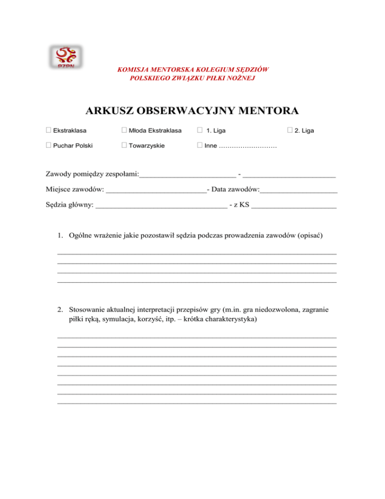 KOMISJA MENTORSKA KOLEGIUM SĘDZIÓW POLSKIEGO ZWIĄZKU PIŁKI NOŻNEJ ARKUSZ OBSERWACYJNY MENTORA Ekstraklasa Młoda Ekstraklasa Puchar Polski Towarzyskie Inne ……………………… 1. Liga 2. Liga Zawody pomiędzy zespołami:_________________________ - ________________________ Miejsce zawodów: __________________________- Data zawodów:____________________ Sędzia główny: __________________________________ - z KS ______________________ 1. Ogólne wrażenie jakie pozostawił sędzia podczas prowadzenia zawodów (opisać) ________________________________________________________________________ ________________________________________________________________________ ________________________________________________________________________ ________________________________________________________________________ 2. Stosowanie aktualnej interpretacji przepisów gry (m.in. gra niedozwolona, zagranie piłki ręką, symulacja, korzyść, itp. – krótka charakterystyka) ________________________________________________________________________ ________________________________________________________________________ ________________________________________________________________________ ________________________________________________________________________ ________________________________________________________________________ ________________________________________________________________________ ________________________________________________________________________ ________________________________________________________________________ 3. Sprawowanie kontroli dyscyplinarnej i zarządzanie w czasie zawodów (opisać) ________________________________________________________________________ ________________________________________________________________________ ________________________________________________________________________ ________________________________________________________________________ 4. Osobowość sędziego (ogólny wizerunek, posiadanie autorytetu - opisać) ________________________________________________________________________ ________________________________________________________________________ ________________________________________________________________________ ________________________________________________________________________ 5. Kondycja fizyczna( ustawianie się na boisku, styl biegu, przygotowanie fizyczne, sposób poruszania się i ustawiania – opisać) ________________________________________________________________________ ________________________________________________________________________ ________________________________________________________________________ ________________________________________________________________________ 6. Współpraca z sędziami asystentami i sędzią technicznym (jeżeli taki jest – ogólna charakterystyka) ________________________________________________________________________ ________________________________________________________________________ ________________________________________________________________________ ________________________________________________________________________ 7. Jak zachowywał się w podejmowaniu trudnych i odpowiedzialnych decyzji ________________________________________________________________________ ________________________________________________________________________ ________________________________________________________________________ ________________________________________________________________________ 8. Mankamenty podczas pracy sędziego na boisku ( wymienić i krótko opisać) ________________________________________________________________________ ________________________________________________________________________ ________________________________________________________________________ ________________________________________________________________________ 9. Porównanie pracy sędziego z poprzednimi zawodami, czy sędzia czyni postępy w jakim elemencie i w jakim stopniu, elementy pozytywne i elementy do poprawy (wskazać i opisać) ________________________________________________________________________ ________________________________________________________________________ ________________________________________________________________________ ________________________________________________________________________ 10. Wnioski i zalecenia oraz inne opinie związane z programem mentorskim ________________________________________________________________________ ________________________________________________________________________ ________________________________________________________________________ ________________________________________________________________________ Imię i nazwisko mentora…………………………………….. z KS ……………….………. ............................................. Miejscowość, data ............................... podpis mentora
