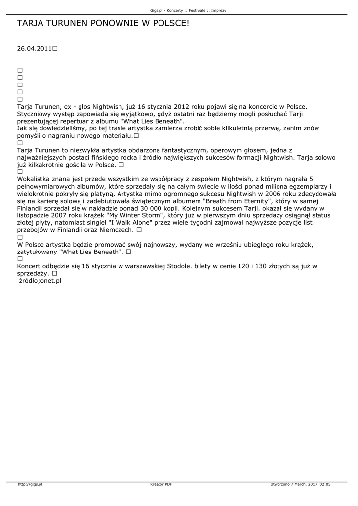 Gigs.pl - Koncerty :: Festiwale :: Imprezy TARJA TURUNEN PONOWNIE W POLSCE! 26.04.2011 Tarja Turunen, ex - głos Nightwish, już 16 stycznia 2012 roku pojawi się na koncercie w Polsce. Styczniowy występ zapowiada się wyjątkowo, gdyż ostatni raz będziemy mogli posłuchać Tarji prezentującej repertuar z albumu "What Lies Beneath". Jak się dowiedzieliśmy, po tej trasie artystka zamierza zrobić sobie kilkuletnią przerwę, zanim znów pomyśli o nagraniu nowego materiału. Tarja Turunen to niezwykła artystka obdarzona fantastycznym, operowym głosem, jedna z najważniejszych postaci fińskiego rocka i źródło największych sukcesów formacji Nightwish. Tarja solowo już kilkakrotnie gościła w Polsce. Wokalistka znana jest przede wszystkim ze współpracy z zespołem Nightwish, z którym nagrała 5 pełnowymiarowych albumów, które sprzedały się na całym świecie w ilości ponad miliona egzemplarzy i wielokrotnie pokryły się platyną. Artystka mimo ogromnego sukcesu Nightwish w 2006 roku zdecydowała się na karierę solową i zadebiutowała świątecznym albumem "Breath from Eternity", który w samej Finlandii sprzedał się w nakładzie ponad 30 000 kopii. Kolejnym sukcesem Tarji, okazał się wydany w listopadzie 2007 roku krążek "My Winter Storm", który już w pierwszym dniu sprzedaży osiągnął status złotej płyty, natomiast singiel "I Walk Alone" przez wiele tygodni zajmował najwyższe pozycje list przebojów w Finlandii oraz Niemczech. W Polsce artystka będzie promować swój najnowszy, wydany we wrześniu ubiegłego roku krążek, zatytułowany "What Lies Beneath". Koncert odbędzie się 16 stycznia w warszawskiej Stodole. bilety w cenie 120 i 130 złotych są już w sprzedaży. źródło;onet.pl http://gigs.pl Kreator PDF Utworzono 7 March, 2017, 02:05