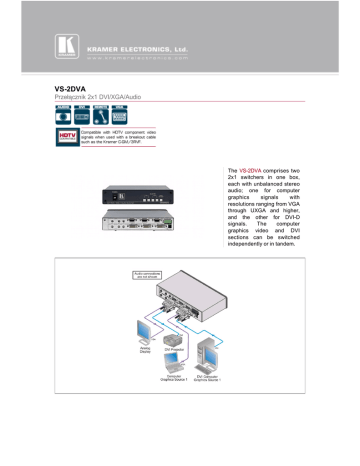 VS-2DVA Przełącznik 2x1 DVI/XGA/Audio The VS-2DVA comprises two 2x1 switchers in one box, each with unbalanced stereo audio; one for computer graphics signals with resolutions ranging from VGA through UXGA and higher, and the other for DVI-D signals. The computer graphics video and DVI sections can be switched independently or in tandem. VS-2DVA FEATURES High Bandwidth - 340MHz (3dB) ComputerGraphics & 1.65Gb/sec DVI. HDTV Compatible. DVI Input/Output - DVI-D signal (on a DVIIconnector) Reclocking & Equalization - DVI section. Switching - Separate or ganged (selectable). Control - Front panel or contact closure. Desktop Size - Compact size. Two units can berack mounted side-by-side in a 1U rack spacewith the optional RK-80 adapter. TECHNICAL SPECIFICATIONS WEJŚCIA: 2XGA/UXGA na złączach HD15F ; z odpowiadajacymi 2 niesymetrycznymi wejściami stereo audio + 4dBm/50k na złacach 3.5mm typu mini jack. 2DVI, 1.2Vpp na złączu DVI Molex 24pin -żeńskie; sygnał DDC 5Vpp (TTL); z odpowiadającymi 2 niesymetrucznymi wejściami stereo audio + 4dBm/50k na 3.5mm konektorze typu mini jack. WYJŚCIA: 1 XGA/UXGA na złączu HD15F; z odpowiadającym niesymetrycznym sygnałem stereo audio + 4dBm/50k na złączu typu 3.5mm mini jack. 1 DVI, 1.2Vpp na DVI Molex 24pin złącze żeńskie; sygnał DDC 5Vpp (TTL); z odpowiadającym niesymetrycznym sygnałem stereo audio + 4dBm/50k na złączu typu 3.5mm mini jack. MAX.POZIOM Video: 1.6Vpp. Audio: SYGNAŁU 14.2dBm. WYJŚCIOWEGO: PASMO (- 3dB): Video: 340MHz, w pełni obciążalne audio: > 100kHz. WZM. ROZNICOWE: RÓŻNICA FAZ: 0.03%. 0.02 stopnia WSPÓŁCZYNNIK < 0.05%. K: STOSUNEK Video: 74.2dB. Audio: 87.3dB. SYGNAŁ/SZUM: PRZESŁUCH: Video: – 55.9dB. Audio: – 59dB. SPRZĘŻENIE WE/WY: POZIOM THD + SZUM AUDIO: 2-GA HARMONICZNA AUDIO: ZASILACZ: Video: DC. Audio: DC. WYMIARY: 22cm x 18cm x 4.5cm (8.7" x 7" x 1.7") SZ, G, W. MASA: 1.3kg (2.9lbs) ACCESSORIES: Power supply (12V, 500mA). 0.019%. 0.003%. 12 VDC 280mA.