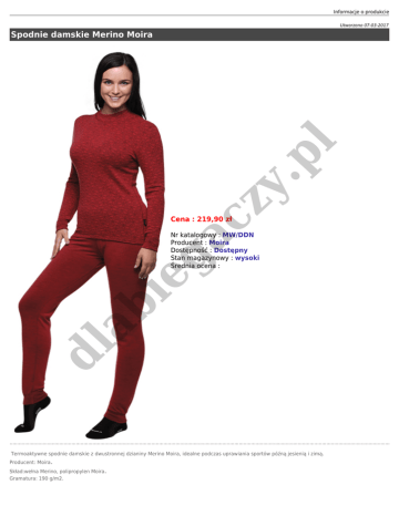 Informacje o produkcie Utworzono 07-03-2017 ga cz y. pl Spodnie damskie Merino Moira Cena : 219,90 zł dl ab ie Nr katalogowy : MW/DDN Producent : Moira Dostępność : Dostępny Stan magazynowy : wysoki Średnia ocena : Termoaktywne spodnie damskie z dwustronnej dzianiny Merino Moira, idealne podczas uprawiania sportów późną jesienią i zimą. Producent: Moira. Skład:wełna Merino, polipropylen Moira. Gramatura: 190 g/m2. ga cz y. pl wełna merino Wprowadzając nowe dzianiny z wełny Merino, Moira nawiązuje do kolekcji, którą zaczęto tworzyć już przed sześciu laty. Nowe dzianiny wykorzystują doskonałe właściwości najwyższej jakości wełny owczej Merino i wyjątkowych włókien MOIRA. Kolekcja obejmuje fasony z dzianiny pokrytej od wewnątrz włóknem MOIRA, fasony ze specjalnie zaprojektowanymi strefami funkcyjnymi i wentylacyjnymi oraz swetry o większej gramaturze dzianiny. Sprawdzona kombinacja wełny Merino oraz włókna MOIRA spełnia wymogi stawiane przed materiałami funkcyjnymi szybkie odprowadzanie potu przy zachowaniu optymalnych parametrów termicznych. Poprzez połączenie naturalnego włókna z wełny MERINO oraz włókna MOIRA powstała linia nowych dzianin tworzących kolekcję MERINO MOIRA. W celu stworzenia linii bardzo ciepłej bielizny została opracowana dwustronna dzianina, która za pośrednictwem włókien MOIRA po stronie wewnętrznej jest w stanie transportować wilgoć na stronę zewnętrzną tworzoną przez najdelikatniejsze włókna MERINO SUPER FINE o grubości 16 mikronów. Dzięki takiej konstrukcji dzianina jest w stanie przyjąć dużą ilość wilgoci, nie dając odczucia zimna, strona wewnętrzna oprócz funkcji transportowej i izolacyjnej zapewnia maksymalny komfort noszenia także osobom o bardzo wrażliwej skórze. Kolejnym fasonem w linii MERINO MOIRA są pulowery ze specjalnie zaprojektowanymi strefami funkcyjnymi i wentylacyjnymi oraz swetry o zwiększonej gramaturze dzianiny. Wykorzystano w tym przypadku przędzę z mieszanki włókien MOIRA TG900 i MERINO. Taka kombinacja daje doskonały efekt termoregulacyjny, szybsze wysychanie w stosunku do produktów ze 100% wełny a także większą odporność na zużycie. Wykorzystywana przez nas wełna została zabezpieczona przed filcowaniem technologią SUPERWASH. MERINO MOIRA sprawdza się idealnie podczas form aktywności o typie ekspedycyjnym, kilkudniowych wycieczek, uprawiania dyscyplin sportowych, w których występują znaczne różnice w temperaturze ciała lub podczas codziennego noszenia. Właściwości włókna wełnianego są wykorzystane w nowych modelach linii Plusz. Panele na ramionach, lamowanie kołnierzy i rękawów wykonane są z nowej dzianiny wełnianej, w której wykorzystane zostały zupełnie nowe technologie umożliwiające tworzenie dowolnych struktur i motywów. Dzianina wełniana poprawia komfort termiczny ramion i uzupełnia doskonałe właściwości pluszu. dl ab kolor: czarny, czerwony, fuksja. rozmiar: S, M, L, XL, XXL. ie Dostępne opcje Spodnie damskie Merino Moira