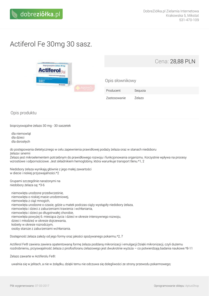 DobreZiółka.pl Zielarnia Internetowa Krakowska 5, Mikstat 531-470-109 Actiferol Fe 30mg 30 sasz. Cena: 28,88 PLN Opis słownikowy Producent Sequoia Zastosowanie Żelazo Opis produktu bioprzyswajalne żelazo 30 mg - 30 saszetek dla niemowląt dla dzieci dla dorosłych do postępowania dietetycznego w celu zapewnienia prawidłowej podaży żelaza oraz w stanach niedoboru żelaza i anemii Żelazo jest mikroelementem potrzebnym do prawidłowego rozwoju i funkcjonowania organizmu. Korzystnie wpływa na procesy wzrostowe i odpornościowe. Jest składnikiem hemoglobiny, która warunkuje transport tlenu.*1, 2 Niedobory żelaza wynikają głównie z jego małej zawartości w diecie i niskiej przyswajalności.*2 Grupami szczególnie narażonymi na niedobory żelaza są: *3-6 niemowlęta urodzone przedwcześnie, niemowlęta o niskiej masie urodzeniowej, niemowlęta z ciąż mnogich, niemowlęta urodzone o czasie, gdzie u matek podczas ciąży wystąpiły niedobory żelaza, niemowlęta i dzieci z zaburzeniami trawienia i wchłaniania, niemowlęta i dzieci po długotrwałej chorobie, niemowlęta powyżej 6. miesiąca życia i dzieci w okresie intensywnego rozwoju, dzieci i młodzież w okresie dojrzewania, kobiety w okresie rozrodczym, osoby starsze z zaburzeniami wchłaniania. Dostępność żelaza zależy od jego formy oraz jakości spożywanego pokarmu.*2, 7 Actiferol Fe® zawiera zawiera opatentowaną formę żelaza poddaną mikronizacji i emulgacji.Dzięki mikronizacji, czyli dużemu rozdrobnieniu, przyswajalność żelaza z pirofosforanu żelazowego jest dwukrotnie wyższa – co potwierdzają badania naukowe.*8-11 Żelazo zawarte w Actiferolu Fe®: uwalnia się w jelitach, a nie w żołądku, dzięki temu nie odczuwa się dolegliwości ze strony przewodu pokarmowego; Plik wygenerowano: 07-03-2017 Oprogramowanie sklepu: AptusShop DobreZiółka.pl Zielarnia Internetowa Krakowska 5, Mikstat 531-470-109 nie barwi zębów i nie daje metalicznego posmaku; posiada certyfikat bezpieczeństwa GRAS (Generally Recognised As Safe). Zastosowanie: Do postępowania dietetycznego w celu zapewnienia prawidłowej podaży żelaza oraz w stanach niedoboru żelaza i anemii. Zalecana porcja do spożycia: W celu zapewnienia prawidłowej podaży żelaza: Niemowlęta od 1. doby życia i dzieci: dawkowanie pod nadzorem lekarza, uzależnione od indywidualnego zapotrzebowania. Dzieci powyżej 12. roku życia i dorośli: 1 saszetka dziennie. W stanach niedoboru żelaza i/lub anemii: Niemowlęta od 1. doby życia i dzieci: dawkowanie pod nadzorem lekarza uzależnione od indywidualnego zapotrzebowania. Dorośli: 2 saszetki dziennie i/lub pod nadzorem lekarza. Sposób użycia: Zawartość saszetki należy rozpuścić w niewielkiej ilości ciepłego płynu (ok. ¼ szklanki wody lub ściągniętego pokarmu matki) lub dodać do pożywienia (łyżka stołowa kaszki lub zupki). Spożyć bezpośrednio po przygotowaniu. Actiferol Fe ® nie zmienia smaku spożywanych pokarmów i nie barwi zębów. Plik wygenerowano: 07-03-2017 Powered by TCPDF (www.tcpdf.org) Oprogramowanie sklepu: AptusShop