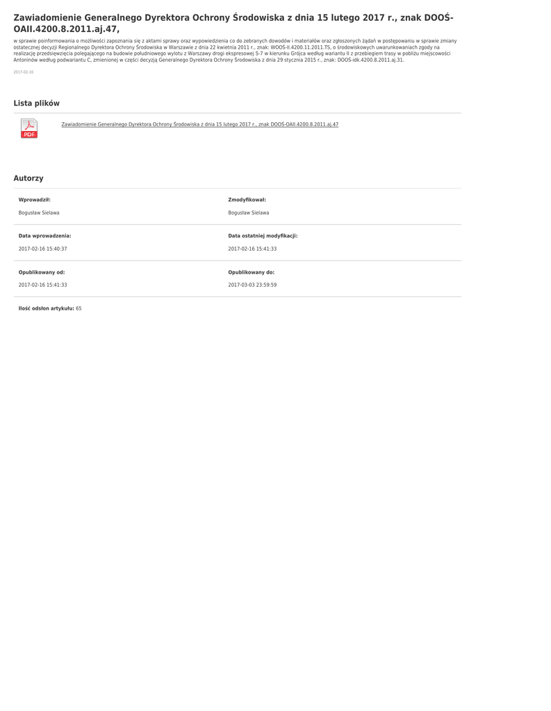 Zawiadomienie Generalnego Dyrektora Ochrony Środowiska z dnia 15 lutego 2017 r., znak DOOŚOAII.4200.8.2011.aj.47, w sprawie poinformowania o możliwości zapoznania się z aktami sprawy oraz wypowiedzienia co do zebranych dowodów i materiałów oraz zgłoszonych żądań w postępowaniu w sprawie zmiany ostatecznej decyzji Regionalnego Dyrektora Ochrony Środowiska w Warszawie z dnia 22 kwietnia 2011 r., znak: WOOŚ-II.4200.11.2011.TS, o środowiskowych uwarunkowaniach zgody na realizację przedsięwzięcia polegającego na budowie południowego wylotu z Warszawy drogi ekspresowej S-7 w kierunku Grójca według wariantu II z przebiegiem trasy w pobliżu miejscowości Antoninów według podwariantu C, zmienionej w części decyzją Generalnego Dyrektora Ochrony Środowiska z dnia 29 stycznia 2015 r., znak: DOOŚ-idk.4200.8.2011.aj.31. 2017-02-16 Lista plików Zawiadomienie Generalnego Dyrektora Ochrony Środowiska z dnia 15 lutego 2017 r., znak DOOŚ-OAII.4200.8.2011.aj.47 Autorzy Wprowadził: Zmodyfikował: Bogusław Sielawa Bogusław Sielawa Data wprowadzenia: Data ostatniej modyfikacji: 2017-02-16 15:40:37 2017-02-16 15:41:33 Opublikowany od: Opublikowany do: 2017-02-16 15:41:33 2017-03-03 23:59:59 Ilość odsłon artykułu: 65