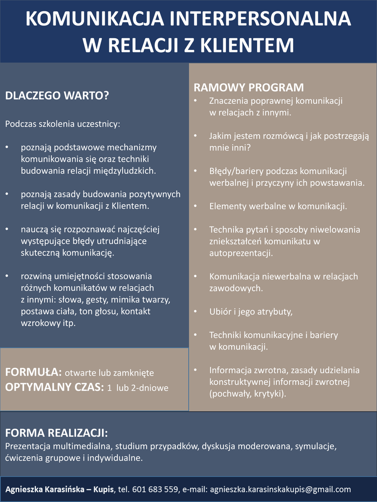 KOMUNIKACJA INTERPERSONALNA W RELACJI Z KLIENTEM DLACZEGO WARTO? RAMOWY PROGRAM • Znaczenia poprawnej komunikacji w relacjach z innymi. • poznają podstawowe mechanizmy komunikowania się oraz techniki budowania relacji międzyludzkich. Jakim jestem rozmówcą i jak postrzegają mnie inni? • Błędy/bariery podczas komunikacji werbalnej i przyczyny ich powstawania. poznają zasady budowania pozytywnych relacji w komunikacji z Klientem. • Elementy werbalne w komunikacji. Podczas szkolenia uczestnicy: • • • nauczą się rozpoznawać najczęściej występujące błędy utrudniające skuteczną komunikację. • Technika pytań i sposoby niwelowania zniekształceń komunikatu w autoprezentacji. • rozwiną umiejętności stosowania różnych komunikatów w relacjach z innymi: słowa, gesty, mimika twarzy, postawa ciała, ton głosu, kontakt wzrokowy itp. • Komunikacja niewerbalna w relacjach zawodowych. • Ubiór i jego atrybuty, • Techniki komunikacyjne i bariery w komunikacji. • Informacja zwrotna, zasady udzielania konstruktywnej informacji zwrotnej (pochwały, krytyki). FORMUŁA: otwarte lub zamknięte OPTYMALNY CZAS: 1 lub 2-dniowe FORMA REALIZACJI: Prezentacja multimedialna, studium przypadków, dyskusja moderowana, symulacje, ćwiczenia grupowe i indywidualne.
