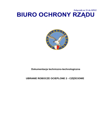 Załącznik nr 21 do SIWZ BIURO OCHRONY RZĄDU Dokumentacja techniczno-technologiczna UBRANIE ROBOCZE OCIEPLONE 2 - CZĘŚCIOWE SPIS TREŚCI. 1. Rysunek modelowy. 3 2. Opis ogólny wyrobu. 4 3. Wymagania techniczne. 4 3.1. Wykaz materiałów zasadniczych i dodatków. 4 3.2. Rodzaje szwów i ściegów maszynowych. 5 3.3. Tabela klasyfikacji wielkości. 5 4. Zestawienie elementów składowych. 6-7 5. Rysunki techniczne. 8-9 6. Tabela wymiarów wyrobu gotowego. 10-14 7. Cechowanie i pakowanie. 15 8. Gwarancje. 15 9. Arkusz ewidencji wprowadzonych zmian. 16 2 1. RYSUNEK MODELOWY. Rysunek nr 1 – rysunek modelowy. 3 2. OPIS OGÓLNY WYROBU. Ubranie robocze ocieplone składa się z kurtki i spodni. Kurtka ubrania roboczego ocieplonego z kołnierzem, zapinana na pięć guzików. Kieszenie boczne nastębnowane na przodzie kurtki. Kieszeń wewnętrzna nastębnowana na lewej części podszewki. Tył kurtki dwuczęściowy, na linii talii ściągnięty taśmą gumową. Kurtka ocieplona podszewka pikowana z pianką ocieplającą. Spodnie ubrania ocieplonego – dlugie z doszytym paskiem zapinanym na dwa guziki. Na nogawkach spodni naszyte kieszenie boczne. Na nogawce lewego tyłu naszyta kieszeń „calówka”. Na pasku spodni naszyte siedem podtrzymywaczy. Obwód pasa regulowany ściągaczem naszytym na tyle paska. Rozporek zapinany na trzy guziki. Spodnie ocieplone podszewka pikowana z pianka ocieplającą. 3. WYMAGANIA TECHNICZNE. 3.1. WYKAZ MATERIAŁÓW ZASADNICZYCH I DODATKÓW. Tabela nr 1 L.p. Wyszczególnienie Charakterystyka 1 2 3 1 Tkanina zasadnicza. Tkanina drelichowa koloru granatowego o składzie : bawełna 50%, poliester 50%; gramatura min. 240 g/m². 2 Podszewka pikowana. Dzianina poliestrowa koloru czarnego + pianka ocieplająca min. 200 g/m². 3 Podszewka pikowana. Dzianina poliestrowa koloru czarnego + pianka ocieplająca min. 120 g/m². 4 Nici odzieŜowe. Poliestrowe 150 tex x 3 w kolorze tkaniny. 5 Guziki 4 – otworowe. Czarne ‘’32’’. 6 Guziki 4 - otworowe. Czarne ‘’28’’. 7 Taśma bawełniana Biała szerokości 3 cm. 8 Taśma gumowa. Szerokości 3 cm. 4 3.2. RODZAJE SZWÓW I ŚCIEGÓW MASZYNOWYCH. Szwy : a) szwy łączące – 1 cm; b) szwy obrębiające – 1 + 2 cm – podwinięcie kieszeni, dołów rękawów, kurtki, spodni; c) stębnówki 2 – igłowe – naszycie kieszeni kurtki i spodni, szew zeszycia tyłu kurtki i spodni, szew boczny spodni; d) stębnówka 1 – igłowa – na 0,7 cm – krawędzie przodów i kołnierza. Gęstość ściegów : a) stębnowe – 40-50 na 1 dm; b) podtrzymywacze paska przymocowane ryglem maszynowym. 3.3. TABELA KLASYFIKACJI WYROBU GOTOWEGO. Tabela nr 2 Wielkości typowe. Wzrost 160 Obwód klatki piersiowej 86 92 100 X X 166 X X 171 X X X 174 176 X X 179 X X X 182 184 187 116 X 163 168 108 X X X X X 190 X 5 4. ZESTAWIENIE ELEMENTÓW SKŁADOWYCH. Tabela nr 3 Kurtka ubrania roboczego ocieplonego. L.p. Wyszczególnienie Nazwa elementu Ilość składowego 1 1 2 3 Tkanina zasadnicza Tył. 2 Przód. 2 Rękaw wierzchni. 2 Rękaw spodni. 2 Kieszeń dolna. 2 Kieszeń wewnętrzna. 1 Kołnierz wierzchni. 1 Kołnierz spodni. 1 ObłoŜenie spodu. 2 Odszycie szyi tyłu. 1 Wieszak. 1 Razem elementów 2 17 Podszewka pikowana min. 200 g/m². Przód. 2 Tył. 1 Razem elementów 3 4 3 Podszewka pikowana min. 120 g/m². Kołnierz wierzchni. 1 Rękaw wierzchni. 2 Rękaw spodni. 2 Razem elementów 5 Ogółem elementów 25 6 Tabela nr 4 Spodnie robocze ubrania ocieplonego. L.p. Wyszczególnienie Nazwa elementu Ilość składowego 1 1 2 3 Tkanina zasadnicza Nogawka przodu. 2 Nogawka tyłu. 2 Listewka lewa. 1 Listewka prawa. 1 Kieszenie boczne. 2 Kieszeń „calówka”. 1 Pasek. 1 Ściągacz paska. 1 Ściągacze dołu nogawek. 2 Razem elementów 2 4 13 Podszewka pikowana min. 120 g/m². Nogawka przodu. 2 Nogawka tyłu. 2 Razem elementów 4 Ogółem elementów 17 7 5. RYSUNKI TECHNICZNE. Rysunek nr 2 – elementy kurtki ubrania roboczego ocieplonego. 8 Rysunek nr 3 – elementy spodni ubrania roboczego ocieplonego. 9 6. TABELE WYMIARÓW WYROBU GOTOWEGO. Tabela nr 5 Wzrost L.p. 160 168 176 Obwód klatki piersiowej 86 Obwód pasa 84 184 Dopuszczalne odchylenie ± Kurtka ubrania roboczego ocieplonego. 1 Długość tyłu od wszycia 72,0 75,5 79,0 82,5 1,0 kołnierza do dołu. 2 Długość rękawa. 61,0 63,5 66,0 68,5 1,0 3 Obwód pod pachą od krawędzi 63,0 64,0 65,0 66,0 1,0 przodu do środka tyłu. 4 Szerokość kieszeni. 17,5 17,5 17,5 17,5 0,5 5 Długość kieszeni. 17,5 17,5 17,5 17,5 0,5 6 Odległość kieszeni od krawędzi 13,0 13,0 13,0 13,0 0,5 94,0 99,0 104,0 109,0 1,0 przodu. Spodnie ubrania roboczego ocieplonego. 7 Długość spodni po boku od wszycia paska do dołu. 8 Długość szwu wewnętrznego. 72,0 76,0 80,0 84,0 1,0 9 Szerokość nogawki w Połowie 34,0 34,0 34,0 34,0 1,0 w udzie. 10 Szerokość nogawek u dołu. 20,0 21,0 22,0 23,0 0,5 11 Obwód w pasie w Polowie po 43,0 43,0 43,0 43,0 1,0 zapięciu. 12 Długość kieszeni. 32,0 32,0 32,0 32,0 0,5 13 Szerokość kieszeni. 19,0 19,0 19,0 19,0 0,5 10 Tabela nr 6 Wzrost L.p. 163 171 179 Obwód klatki piersiowej 92 Obwód pasa 88 187 Dopuszczalne odchylenie ± Kurtka ubrania roboczego ocieplonego. 1 Długość tyłu od wszycia 73,5 77,0 80,5 84,0 1,0 kołnierza do dołu. 2 Długość rękawa. 62,0 64,5 67,0 69,5 1,0 3 Obwód pod pachą od krawędzi 67,0 68,0 69,0 70,0 1,0 przodu do środka tyłu. 4 Szerokość kieszeni. 17,5 17,5 17,5 17,5 0,5 5 Długość kieszeni. 17,5 17,5 17,5 17,5 0,5 6 Odległość kieszeni od krawędzi 14,0 14,0 14,0 14,0 0,5 95,0 100,0 105,0 110,0 1,0 przodu. Spodnie ubrania roboczego ocieplonego. 7 Długość spodni po boku od wszycia paska do dołu. 8 Długość szwu wewnętrznego. 72,5 76,5 80,5 84,5 1,0 9 Szerokość nogawki w Połowie 36,0 36,0 36,0 36,0 1,0 w udzie. 10 Szerokość nogawek u dołu. 21,0 22,0 23,0 24,0 0,5 11 Obwód w pasie w Polowie po 46,0 46,0 46,0 46,0 1,0 zapięciu. 12 Długość kieszeni. 32,0 32,0 32,0 32,0 0,5 13 Szerokość kieszeni. 