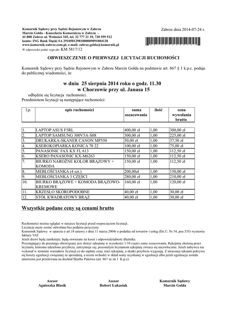 Komornik Sądowy przy Sądzie Rejonowym w Zabrzu Marcin Gołda - Kancelaria Komornicza w Zabrzu 41-800 Zabrze ul. Wolności 345, tel. 32 777 21 39, 728 559 512 konto: ING Bank Śląski SA 29105012981000009091004128 www.komornik-zabrze.com.pl, e-mail: [email protected] W odpowiedzi podać sygn.akt: KM Zabrze dnia 2014-07-24 r. *6014072400331* 5817/12 OBWIESZCZENIE O PIERWSZEJ LICYTACJI RUCHOMOŚCI Komornik Sądowy przy Sądzie Rejonowym w Zabrzu Marcin Gołda na podstawie art. 867 § 1 k.p.c. podaje do publicznej wiadomości, że w dniu 25 sierpnia 2014 roku o godz. 11.30 w Chorzowie przy ul. Janasa 15 odbędzie się licytacja ruchomości. Przedmiotem licytacji są następujące ruchomości: l.p. 1. 2. 3. 4. 5. 6. 7. 8. 9. 10. 11. 12. opis ruchomości suma oszacowania LAPTOP ASUS F5RL LAPTOP SAMSUNG 300V5A-S08 DRUKARKA-SKANER CANON MP550 KSEROKOPIARKA KONICA 70 22 PANASONIC FAX KX FL 613 KSERO PANASONIC KX-M6263 BIURKO NAROŻNE KOLOR BRĄZOWY + KOMODA MEBLOŚCIANKA (4 szt.) MEBLOŚCIANKA 3 CZĘŚCI BIURKO BRĄZOWE + KOMODA BRĄZOWOKREMOWE KRZESŁO SKÓROPODOBNE STÓŁ KWADRATOWY BRĄZ ilość cena wywołania brutto 400,00 zł 300,00 zł 50,00 zł 100,00 zł 150,00 zł 150,00 zł 150,00 zł 1,00 1,00 1,00 1,00 1,00 1,00 1,00 300,00 zł 225,00 zł 37,50 zł 75,00 zł 112,50 zł 112,50 zł 112,50 zł 200,00zł 280,00 zł 160,00 zł 1,00 1,00 1,00 150,00 zł 210,00 zł 120,00 zł 40,00 zł 40,00 zł 1,00 1,00 30,00 zł 30,00 zł Wszystkie podane ceny są cenami brutto Ruchomości można oglądać w miejscu licytacji przed rozpoczęciem licytacji. Licytacja może zostać odwołana bez podania przyczyny. Komornik Sądowy w oparciu o art.18 ustawy z dnia 11 marca 2004r o podatku od towarów i usług (Dz.U. Nr 54, poz.535) wystawia faktury VAT. Jeżeli drzwi będą zamknięte, będą otwierane na koszt i odpowiedzialność dłużnika. Przystępujący do przetargu obowiązany jest złożyć rękojmię w wysokości 1/10 części sumy oszacowania. Rękojmię złożoną przez licytanta, któremu udzielono przybicia, zatrzymuje się; pozostałym licytantom rękojmię zwraca się niezwłocznie. Jeżeli nabywca nie wykonał w terminie warunków licytacji co do zapłaty ceny, traci rękojmię, a skutki przybicia wygasają. Z utraconej rękojmi pokrywa się koszty egzekucji związanej ze sprzedażą, a reszta wchodzi w skład sumy uzyskanej w egzekucji albo jeżeli egzekucja została umorzona jest przelewana na dochód Skarbu Państwa (art. 867 ze zn 1 K.p.c). Asesor Agnieszka Błasik Asesor Robert Łukasiak Komornik Sądowy Marcin Gołda