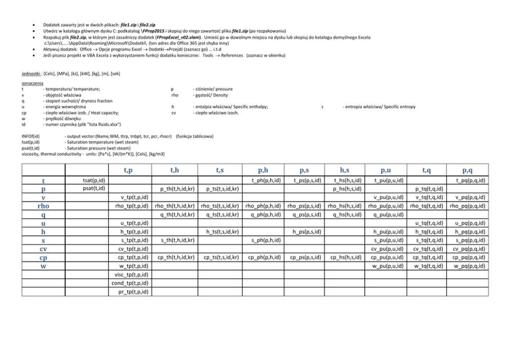 Dodatek zawarty jest w dwóch plikach: file1.zip i file2.zip Utwórz w katalogu głównym dysku C: podkatalog \FProp2015 i skopiuj do niego zawartość pliku file1.zip (po rozpakowaniu) Rozpakuj plik file2.zip, w którym jest zasadniczy dodatek (FPropExcel_v02.xlam) . Umieść go w dowolnym miejscu na dysku lub skopiuj do katalogu domyślnego Excela c:\Users\.....\AppData\Roaming\Microsoft\Dodatki\ (ten adres dla Office 365 jest chyba inny) Aktywuj dodatek: Office Opcje programu Excel DodatkiPrzejdź (zaznacz go) ... i.t.d Jeśli piszesz projekt w VBA Excela z wykorzystaniem funkcji dodatku koniecznie: Tools References (zaznacz w okienku) Jednostki : [Cels], [MPa], [kJ], [kW], [kg], [m], [sek] oznaczenia t - temperatura/ temperature; v - objętość właściwa q - stopień suchości/ dryness fraction u - energia wewnętrzna cp - ciepło właściwe izob. / Heat capacity; w - prędkość dźwięku id - numer czynnika (plik "lista fluids.xlsx") p rho - ciśnienie/ pressure - gęstość/ Density h cv - entalpia właściwa/ Specific enthalpy; - ciepło właściwe izoch. s - entropia właściwa/ Specific entropy INFOf(id) - output vector:(Name,WM, ttrp, tnbpt, tcr, pcr, rhocr) (funkcja tablicowa) tsat(p,id) - Saturation temperature (wet steam) psat(t,id) - Saturation pressure (wet steam) viscosity, thermal conductivity - units: [Pa*s], [W/(m*K)], [Cels], [kg/m3] t,p t p v rho q u h s cv cp w tsat(p,id) psat(t,id) t,h t,s p,h t_ph(p,h,id) v_tp(t,p,id) rho_tp(t,p,id) u_tp(t,p,id) h_tp(t,p,id) s_tp(t,p,id) cv_tp(t,p,id) cp_tp(t,p,id) w_tp(t,p,id) visc_tp(t,p,id) cond_tp(t,p,id) pr_tp(t,p,id) p_th(t,h,id,kr) p_ts(t,s,id,kr) rho_th(t,h,id,kr) q_th(t,h,id,kr) rho_ts(t,s,id,kr) q_ts(t,s,id,kr) rho_ph(p,h,id) q_ph(p,h,id) h_ts(t,s,id,kr) s_th(t,h,id,kr) cp_th(t,h,id,kr) p,s t_ps(p,s,id) rho_ps(p,s,id) q_ps(p,s,id) h,s t_hs(h,s,id) p_hs(h,s,id) rho_hs(h,s,id) q_hs(h,s,id) h_ps(p,s,id) s_ph(p,h,id) cp_ts(t,s,id,kr) cp_ph(p,h,id) cp_ps(p,s,id) cp_hs(h,s,id) p,u t,q t_pu(p,u,id) v_pu(p,u,id) rho_pu(p,u,id) q_pu(p,u,id) h_pu(p,u,id) s_pu(p,u,id) cv_pu(p,u,id) cp_pu(p,u,id) w_pu(p,u,id) p,q t_pq(p,q,id) p_tq(t,q,id) v_tq(t,q,id) rho_tq(t,q,id) v_pq(p,q,id) rho_pq(p,q,id) u_tq(t,q,id) h_tq(t,q,id) s_tq(t,q,id) cv_tq(t,q,id) cp_tq(t,q,id) w_tq(t,q,id) u_pq(p,q,id) h_pq(p,q,id) s_pq(p,q,id) cv_pq(p,q,id) cp_pq(p,q,id) w_pq(p,q,id)