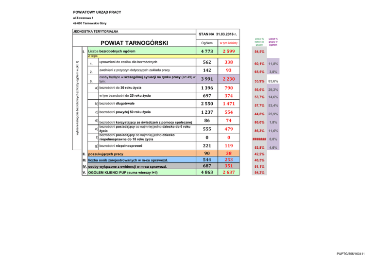 POWIATOWY URZĄD PRACY ul.Towarowa 1 42-600 Tarnowskie Góry JEDNOSTKA TERYTORIALNA POWIAT TARNOGÓRSKI I. STAN NA 31.03.2016 r. udział % kobiet w grupie udział % grupy w ogółem Ogółem w tym kobiety 4 773 2 599 54,5% uprawnieni do zasiłku dla bezrobotnych 562 338 60,1% 11,8% zwolnieni z przyczyn dotyczących zakładu pracy 142 93 65,5% 3,0% 3 991 2 230 55,9% 83,6% 1 396 790 56,6% 29,2% 697 374 53,7% 14,6% b) bezrobotni długotrwale 2 550 1 471 57,7% 53,4% c) bezrobotni powyżej 50 roku życia 1 237 554 44,8% 25,9% 86 74 86,0% 1,8% 555 479 86,3% 11,6% 0 0 221 119 90 544 687 4 863 38 253 351 2 637 Liczba bezrobotnych ogółem wybrane kategorie bezrobotnych (z liczby ogółem w pkt. I) z tego: 1. 2. osoby będące w szczególnej sytuacji na rynku pracy (art.49) w tym: 6. a) bezrobotni do 30 roku życia w tym bezrobotni do 25 roku życia d) bezrobotni korzystający ze świadczeń z pomocy społecznej bezrobotni posiadający co najmniej jedno dziecko do 6 roku e) życia bezrobotni posiadający co najmniej jedno dziecko f) niepełnosprawne do 18 roku życia g) bezrobotni niepełnosprawni II. poszukujących pracy III. liczba osób zarejestrowanych w m-cu sprawozd. IV. osoby wyłączone z ewidencji w m-cu sprawozd. V. OGÓŁEM KLIENCI PUP (suma wierszy I+II) ####### 0,0% 53,8% 4,6% 42,2% 46,5% 51,1% 54,2% PUPTG/555/160411 POWIATOWY URZĄD PRACY MIASTO TARNOWSKIE GÓRY W TARNOWSKICH GÓRACH STAN NA DZIEŃ 31.03.2016 I. r. Liczba bezrobotnych ogółem MIASTO KALETY MIASTO MIASTECZKO ŚL. MIASTO RADZIONKÓW Ogółem w tym kobiety Ogółem w tym kobiety Ogółem w tym kobiety Ogółem w tym kobiety 2184 1175 370 210 312 168 564 308 246 148 43 26 35 21 65 37 wybrane kategorie bezrobotnych (z liczby ogółem w pkt. I) z tego: 1. uprawnieni do zasiłku dla bezrobotnych 2. zwolnieni z przyczyn dotyczących zakładu pracy 67 40 11 8 4 3 20 13 6. osoby będące w szczególnej sytuacji na rynku pracy (art.49) w tym: 1825 1014 311 181 265 144 474 261 a) bezrobotni do 30 roku życia 587 328 129 68 92 55 170 95 bezrobotni do 25 roku życia 279 149 70 36 29 19 101 59 1194 686 191 124 179 98 291 168 588 267 91 50 67 26 158 74 42 36 9 8 5 3 7 6 251 214 48 40 39 34 63 53 0 0 0 0 0 0 0 0 119 58 8 4 8 3 32 21 53 23 7 3 6 2 10 3 256 124 50 25 26 10 71 31 285 144 50 26 39 20 84 43 2237 1198 377 213 318 170 574 311 b) bezrobotni długotrwale c) bezrobotni powyżej 50 roku życia bezrobotni korzystajacy ze świadczeń z d) pomocy społecznej bezrobotni posiadający co najmniej jedno e) dziecko do 6 roku życia bezrobotni posiadający co najmniej jedno dziecko niepełnosprawne do 18 roku f) życia g) bezrobotni niepełnosprawni II. poszukujących pracy liczba osób zarejestrowanych w m-cu III. sprawozdawczym osoby wyłączone z ewidencji w m-cu IV. sprawozdawczym V. OGÓŁEM KLIENCI PUP (suma wierszy I+II) udział % miasta w ogółem udział % kobiet w ogółem 45,8% 7,8% 53,8% 6,5% 56,8% 11,8% 53,8% 54,6% PUPTG/555/160411 POWIATOWY URZĄD PRACY W TARNOWSKICH GÓRACH STAN NA DZIEŃ 31.03.2016 I. GMINA OŻAROWICE r. Liczba bezrobotnych ogółem GMINA KRUPSKI MŁYN GMINA ŚWIERKLANIEC GMINA TWORÓG GMINA ZBROSŁAWICE Ogółem w tym kobiety Ogółem w tym kobiety Ogółem w tym kobiety Ogółem w tym kobiety Ogółem w tym kobiety 185 99 87 51 360 185 232 141 479 262 17 13 8 5 65 38 25 17 58 33 6 5 3 2 16 10 7 6 8 6 145 82 77 44 290 152 202 127 402 225 60 36 35 20 110 57 72 44 141 87 30 12 18 10 51 25 39 20 80 44 93 55 44 24 172 84 126 86 260 146 36 16 16 6 90 37 63 31 128 47 2 2 3 3 11 11 1 1 6 4 17 16 14 13 37 31 31 27 55 51 0 0 0 0 0 0 0 0 0 0 5 1 3 2 20 14 5 1 21 15 1 0 1 0 1 0 5 3 6 4 20 11 7 3 37 11 30 15 47 23 19 14 18 11 52 19 50 32 90 42 186 99 88 51 361 185 237 144 485 266 wybrane kategorie bezrobotnych (z liczby ogółem w pkt. I) z tego: 1. uprawnieni do zasiłku dla bezrobotnych 2. zwolnieni z przyczyn dotyczących zakładu pracy 6. osoby będące w szczególnej sytuacji na rynku pracy (art.49) w tym: a) bezrobotni do 30 roku życia bezrobotni do 25 roku życia b) bezrobotni długotrwale c) bezrobotni powyżej 50 roku życia bezrobotni korzystajacy ze świadczeń z d) pomocy społecznej bezrobotni posiadający co najmniej jedno e) dziecko do 6 roku życia bezrobotni posiadający co najmniej jedno dziecko niepełnosprawne do 18 roku f) życia g) bezrobotni niepełnosprawni II. poszukujących pracy liczba osób zarejestrowanych w m-cu III. sprawozdawczym osoby wyłączone z ewidencji w m-cu IV. sprawozdawczym V. OGÓŁEM KLIENCI PUP (suma wierszy I+II) udział % miasta w ogółem udział % kobiet w ogółem 3,9% 1,8% 53,5% 7,5% 58,6% 4,9% 51,4% 10,0% 60,8% 54,7% PUPTG/555/160411 POWIATOWY URZĄD PRACY ul.Towarowa 1, 42-600 Tarnowskie Góry Stopa bezrobocia wyraża stosunek liczby bezrobotnych do liczby aktywnych zawodowo STOPA BEZROBOCIA I LICZBA OSÓB ATYWNYCH ZAWODOWO STAN NA DZIEŃ 31.03.2016 r. OBSZAR Liczba osób bezrob. (w tys. os.) Liczba osób aktywnych zawodowo (w tys. os.) Stopa bezrobocia (w %) Powiat Tarnogórski 4,8 51,06 9,4 Województwo Śląskie 151,2 1 843,90 8,2 Kraj 1 600,5 16 005,00 10,0 IV/2016 V/2016 stopa bezrobocia XII/2013 XII/2014 XII/2015 I/2016 II/2016 III/2016 powiat tarnogórski 11,8 10,4 9,3 10,7 9,7 9,4 woj. śląskie 11,2 9,6 8,2 10,0 8,5 8,2 Polska 13,4 11,5 9,8 12,0 10,3 10,0 Ludność aktywna zawodowo to wszyscy pracujący zawodowo (pracodawcy, pracownicy najemni, pracujący na własny rachunek, nieodpłatnie pomagający członkowie rodzin) oraz zarejestrowani bezrobotni. Do ludności aktywnej zawodowo nie zalicza się uczniów odbywających naukę zawodu, gospodyń domowych i osób żyjących wyłącznie z kapitału VI/2016 VII/2016 VIII/2016 IX/2016 X/2016 XI/2016 XII/2016 , PUPTG/555/160411