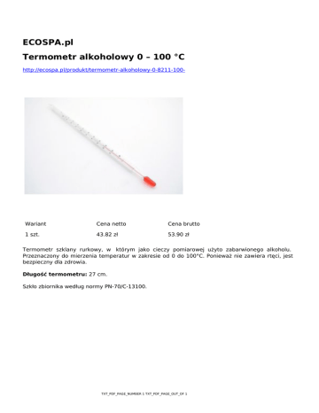 ECOSPA.pl Termometr alkoholowy 0 – 100 °C http://ecospa.pl/produkt/termometr-alkoholowy-0-8211-100- Wariant Cena netto Cena brutto 1 szt. 43.82 zł 53.90 zł Termometr szklany rurkowy, w którym jako cieczy pomiarowej użyto zabarwionego alkoholu. Przeznaczony do mierzenia temperatur w zakresie od 0 do 100°C. Ponieważ nie zawiera rtęci, jest bezpieczny dla zdrowia. Długość termometru: 27 cm. Szkło zbiornika według normy PN-70/C-13100. TXT_PDF_PAGE_NUMBER 1 TXT_PDF_PAGE_OUT_OF 1