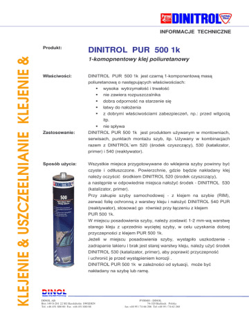 INFORMACJE TECHNICZNE KLEJENIE & USZCZEELNIANIE KLEJENIE & USZC Produkt: Zastosowanie: DINITROL PUR 500 1k 1-komopnentowy klej poliuretanowy ! " #$ $ ! ! ! # $& # $& nie zawiera rozpuszczalnika dobra ' $& # !' #( ' )! #$ $ ) itp. "% *+ ,% ' - # ! ' "+ " ( !)+ . / 0$ ' primer) i 540 (reaktywator). 3 ! !, ! ! (! ! , (! ! ) ! !1+ 2 0 "+ ach + ' !)! ! )!& " + -' )' #' ! / 0$ ' ! !1+ # (!& $ ' - DINITROL 530 '# (! !$ & $ ' ' ' (katalizator, primer). Przy zakupie szyby samochodowej - z klejem na szybie (RIM), &4 " ! # (!& 540 PUR 0 ! 1+ &- 5 ( !# PUR 500 1k. 3 ' !)!+ (! & -2 mm' ! !)!+ ! ') ! 6( ' $ , !)!+ ! # ' ) ! + (! (!& $ ' 2 0 + 1+ )! & ! $& " & ' ! , DINITROL PUR 500 1k w zal ( $ ' ! + ( )!& #' ! !) ) , DINOL AB Box 149 S-281 22 SE Hassleholm SWEDEN Tel. +46 451 880 00 Fax +46 451 880 88 ' PYRMO - DINOL 74-320 Barlinek Polska fax +48 95 / 74 66 206 Tel +48 95 / 74 62 260 Parametry techniczne produktu DINITROL 501 FC Spoiwo: poliuretanowe Kolor: czarny # ! 07 9 $&% : " 40-55 g/ mim 87) 1% ok. 1,2 g/ cm3 " ' $&%0<" 3! ! # $& 3 !'# ( % 3! ! # $& 3! ! # $& - % 3! ! # $& 25-35 min (23o:+ ; -% - ' - ok. 54 =1% - ok. 10 MPa % ok. 600% ! 0 2 - $ ! ie 10% 1% ; ok. 11 N/ mm ok. 2.1 Mpa ok. 1,1 Mpa deformowanie: 3! ! 0/2oC, 50% # $& # - ' - 3 h – 0,7 Mpa 24 h – 3.9 MPa $&1% 168 h – 7,6 Mpa Magazynowanie: 9 / $& ' ) 0 (23 :+ ; - ' '! - $&1% !– nie otwarte kartusze pojedyncza poduszka powietrzna - 2 h podwójna poduszka powietrzna - 6 h $&1