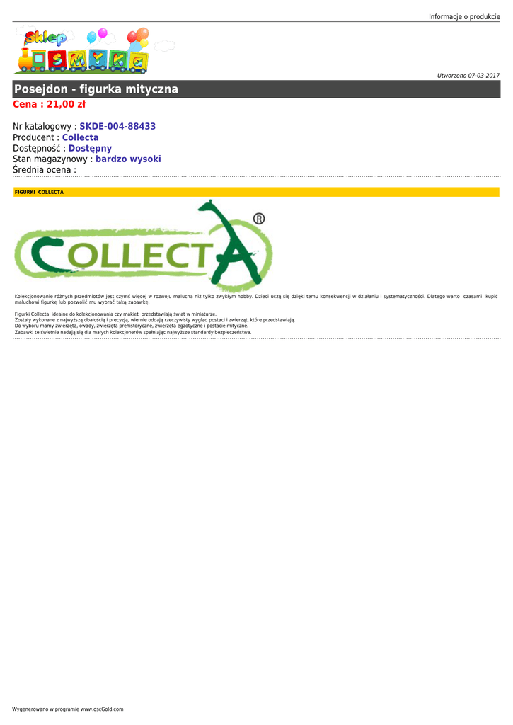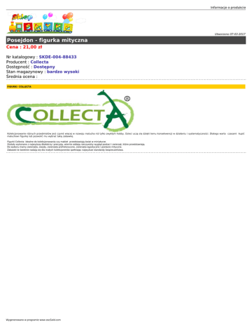 Informacje o produkcie Utworzono 07-03-2017 Posejdon - figurka mityczna Cena : 21,00 zł Nr katalogowy : SKDE-004-88433 Producent : Collecta Dostępność : Dostępny Stan magazynowy : bardzo wysoki Średnia ocena : FIGURKI COLLECTA Kolekcjonowanie różnych przedmiotów jest czymś więcej w rozwoju malucha niż tylko zwykłym hobby. Dzieci uczą się dzięki temu konsekwencji w działaniu i systematyczności. Dlatego warto czasami kupić maluchowi figurkę lub pozwolić mu wybrać taką zabawkę. Figurki Collecta idealne do kolekcjonowania czy makiet przedstawiają świat w miniaturze. Zostały wykonane z najwyższą dbałością i precyzją, wiernie oddają rzeczywisty wygląd postaci i zwierząt, które przedstawiają. Do wyboru mamy zwierzęta, owady, zwierzęta prehistoryczne, zwierzęta egzotyczne i postacie mityczne. Zabawki te świetnie nadają się dla małych kolekcjonerów spełniając najwyższe standardy bezpieczeństwa. Wygenerowano w programie www.oscGold.com
