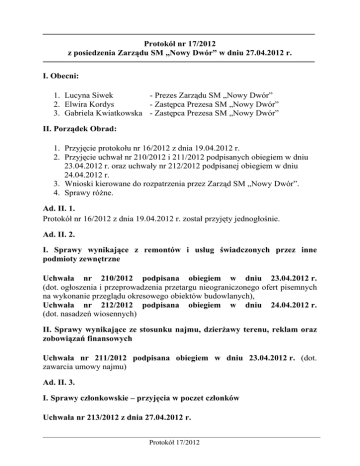 Protokół nr 17/2012 z posiedzenia Zarządu SM „Nowy Dwór” w dniu