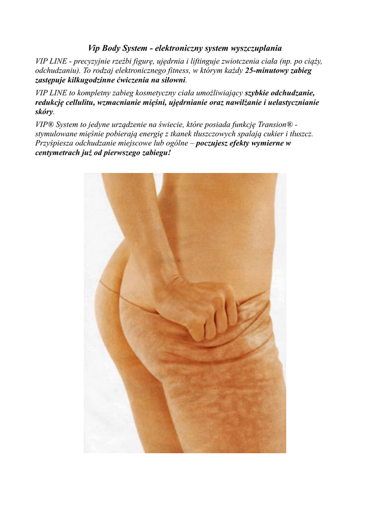 Vip Body System - elektroniczny system wyszczuplania VIP LINE - precyzyjnie rzeźbi figurę, ujędrnia i liftinguje zwiotczenia ciała (np. po ciąży, odchudzaniu). To rodzaj elektronicznego fitness, w którym każdy 25-minutowy zabieg zastępuje kilkugodzinne ćwiczenia na siłowni. VIP LINE to kompletny zabieg kosmetyczny ciała umożliwiający szybkie odchudzanie, redukcję cellulitu, wzmacnianie mięśni, ujędrnianie oraz nawilżanie i uelastycznianie skóry. VIP® System to jedyne urządzenie na świecie, które posiada funkcję Transion® stymulowane mięśnie pobierają energię z tkanek tłuszczowych spalają cukier i tłuszcz. Przyśpiesza odchudzanie miejscowe lub ogólne – poczujesz efekty wymierne w centymetrach już od pierwszego zabiegu! Zabieg VIP LINE na ciało umożliwia: • • • • • • zwalczanie celulitu oraz obrzęków precyzyjne rzeźbienie figury ujędrnianie i lifting zwiotczeń ciała drenaż ciała - limfatyczny oraz żylny (safeny), obrzęki wodne. wzmacnianie mięśni całego ciała poprawę kształtu i lifting biustu, brzucha i pośladków Proces jest automatyczny, sterowany komputerowo. Skuteczność potwierdzona badaniami klinicznymi VIP LINE pomaga usuwać: • • • • • nadwagę z tłuszczem skupionym bądź rozproszonym, przedwczesne bądź funkcjonalne zwiotczenia, zmarszczki – zwiotczenie twarzy, obrzęki twarzy, problemy kosmetyczne skóry, problemy kosmetyczne krążenia. Programy VIP LINE w zabiegach na ciało: • Isogei - gimanstyka izometryczna mięśni, to zabieg, który pomaga w uzyskaniu fantastycznych rezultatów w przypadku zwiotczenia skóry i mięśni. Różni się od zwykłych elektrostymulatorów tym, że rozgrzewa mięśnie indywidualnie oraz wykonuje rozgrzewkę i trening mięśni jednocześnie. • Linfogei - drenaż limfatyczny - kompletne zabiegi na twarz i ciało. Fizjologiczne usuwanie • obrzęków, celulitu, zapobieganie opuchliznom i problemom kosmetycznym wywołanym przez złe krążenie limfy i krwi w żyłach nóg. Zabiegi VIP LINE dodatnio wpływają na: • • • • • • • • • • podskórną tkankę łączną, procesy odżywcze i przemianę materii w tkankach, pobudzanie układu limfatycznego, oczyszczanie organizmu i wydalanie toksyn, wchłanianie obrzęków, zmęczenie i obolałe stopy, zwiotczenie i przykurcze mięśni, bardzo szybkie odchudzanie, wymierne w centymetrach już od pierwszego zabiegu, redukcja nadwagi ogólnej lub miejscowej.