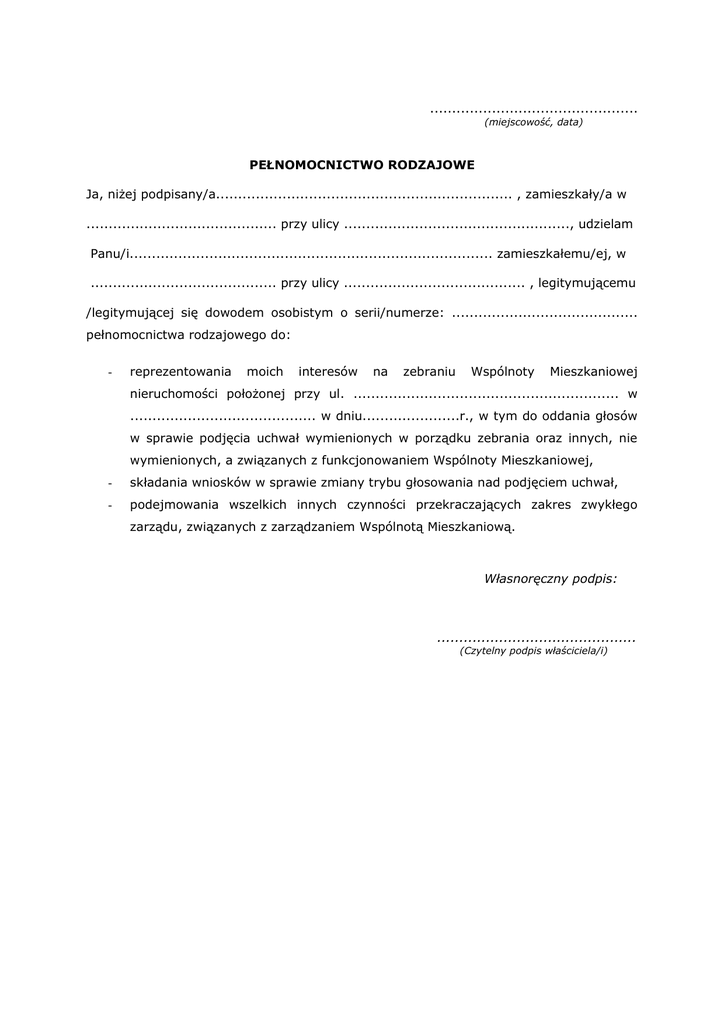 ............................................... (miejscowość, data) PEŁNOMOCNICTWO RODZAJOWE Ja, niżej podpisany/a................................................................... , zamieszkały/a w ........................................... przy ulicy ..................................................., udzielam Panu/i.................................................................................. zamieszkałemu/ej, w .......................................... przy ulicy ......................................... , legitymującemu /legitymującej się dowodem osobistym o serii/numerze: .......................................... pełnomocnictwa rodzajowego do: - reprezentowania moich interesów na zebraniu Wspólnoty Mieszkaniowej nieruchomości położonej przy ul. ............................................................ w .......................................... w dniu......................r., w tym do oddania głosów w sprawie podjęcia uchwał wymienionych w porządku zebrania oraz innych, nie wymienionych, a związanych z funkcjonowaniem Wspólnoty Mieszkaniowej, - składania wniosków w sprawie zmiany trybu głosowania nad podjęciem uchwał, - podejmowania wszelkich innych czynności przekraczających zakres zwykłego zarządu, związanych z zarządzaniem Wspólnotą Mieszkaniową. Własnoręczny podpis: ............................................. (Czytelny podpis właściciela/i)