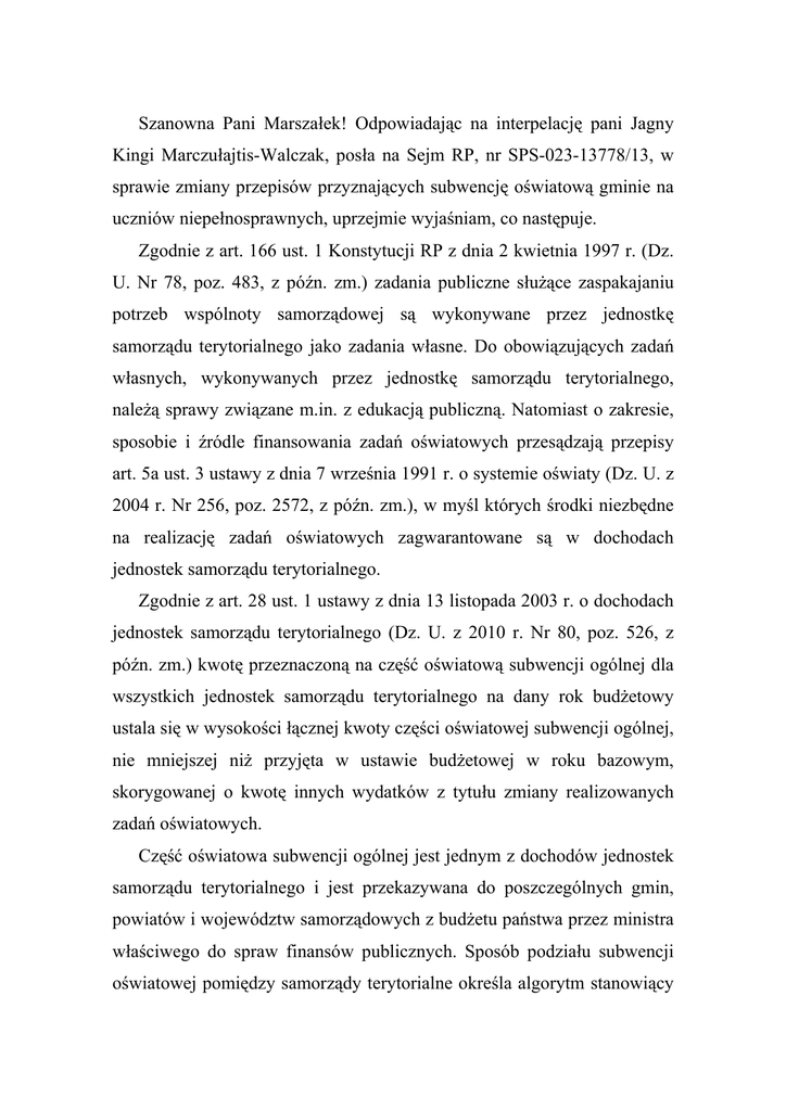 Szanowna Pani Marszałek! Odpowiadając na interpelację pani Jagny Kingi Marczułajtis-Walczak, posła na Sejm RP, nr SPS-023-13778/13, w sprawie zmiany przepisów przyznających subwencję oświatową gminie na uczniów niepełnosprawnych, uprzejmie wyjaśniam, co następuje. Zgodnie z art. 166 ust. 1 Konstytucji RP z dnia 2 kwietnia 1997 r. (Dz. U. Nr 78, poz. 483, z późn. zm.) zadania publiczne służące zaspakajaniu potrzeb wspólnoty samorządowej są wykonywane przez jednostkę samorządu terytorialnego jako zadania własne. Do obowiązujących zadań własnych, wykonywanych przez jednostkę samorządu terytorialnego, należą sprawy związane m.in. z edukacją publiczną. Natomiast o zakresie, sposobie i źródle finansowania zadań oświatowych przesądzają przepisy art. 5a ust. 3 ustawy z dnia 7 września 1991 r. o systemie oświaty (Dz. U. z 2004 r. Nr 256, poz. 2572, z późn. zm.), w myśl których środki niezbędne na realizację zadań oświatowych zagwarantowane są w dochodach jednostek samorządu terytorialnego. Zgodnie z art. 28 ust. 1 ustawy z dnia 13 listopada 2003 r. o dochodach jednostek samorządu terytorialnego (Dz. U. z 2010 r. Nr 80, poz. 526, z późn. zm.) kwotę przeznaczoną na część oświatową subwencji ogólnej dla wszystkich jednostek samorządu terytorialnego na dany rok budżetowy ustala się w wysokości łącznej kwoty części oświatowej subwencji ogólnej, nie mniejszej niż przyjęta w ustawie budżetowej w roku bazowym, skorygowanej o kwotę innych wydatków z tytułu zmiany realizowanych zadań oświatowych. Część oświatowa subwencji ogólnej jest jednym z dochodów jednostek samorządu terytorialnego i jest przekazywana do poszczególnych gmin, powiatów i województw samorządowych z budżetu państwa przez ministra właściwego do spraw finansów publicznych. Sposób podziału subwencji oświatowej pomiędzy samorządy terytorialne określa algorytm stanowiący załącznik do rozporządzenia ministra właściwego do spraw oświaty i wychowania w sprawie sposobu podziału części oświatowej subwencji ogólnej dla jednostek samorządu terytorialnego w danym roku. Ze względu realizowanych na przez rozbudowaną jednostki strukturę samorządu zadań edukacyjnych terytorialnego formuła algorytmicznego podziału subwencji oświatowej uwzględnia szereg czynników i parametrów obrazujących specyfikę kształtowania składowych elementów subwencji w odniesieniu zarówno do zadań szkolnych, jak i do zadań pozaszkolnych. Algorytm podziału subwencji oświatowej uzależnia wysokość przyznawanych środków od skali i struktury realizowanych zadań mierzonych liczbą uczniów i wychowanków z uwzględnieniem stopni awansu zawodowego nauczycieli. Konstrukcja algorytmu opiera się na podstawowym założeniu, iż środki subwencyjne dzielone są według kryteriów jednolitych i powszechnych, a zatem identycznych dla wszystkich jednostek samorządu terytorialnego. W algorytmie podziału części oświatowej subwencji ogólnej dla jednostek samorządu terytorialnego w roku 2013 (załącznik do rozporządzenia ministra edukacji narodowej z dnia 20 grudnia 2012 r. w sprawie sposobu podziału części oświatowej subwencji ogólnej dla jednostek samorządu terytorialnego w roku 2013 (Dz. U. z 2012 r. poz. 1541) uwzględniono 44 wagi, w tym 5 wag obejmujących uczniów niepełnosprawnych. Jeżeli dany uczeń kwalifikuje się do kilku wag – jest on w każdej uwzględniony. Należy jednocześnie podkreślić, że algorytm przedstawia jedynie metodę podziału środków subwencyjnych pomiędzy jednostki samorządu 2 terytorialnego. Niezależnie jednak od sposobu podziału części oświatowej subwencji ogólnej naliczona dla danego samorządu subwencja oświatowa stanowi jedną kwotę, o wydatkowaniu której – zgodnie z art. 7 ust. 3 ustawy o dochodach jednostek samorządu terytorialnego – decyduje organ stanowiący tej jednostki samorządu terytorialnego. Obecnie środki naliczane jednostkom samorządu terytorialnego w ramach podziału części oświatowej subwencji ogólnej, uwzględniającego w szczególności liczbę dzieci niepełnosprawnych w przedszkolach i szkołach, kalkulowane są w oparciu o jednolite w skali kraju wskaźniki (wagi). Odzwierciedlają one uśrednione koszty kształcenia dla różnych rodzajów niepełnosprawności. Faktyczne koszty kształcenia dzieci niepełnosprawnych, nawet w przypadku tej samej niepełnosprawności, są zróżnicowane i w części jednostek samorządu terytorialnego mogą być wyższe od naliczonych kwot w subwencji na dziecko, a w innych niższe od tych kwot. Część oświatowa subwencji ogólnej nie jest dotacją celową, dlatego też podział kwoty subwencji oświatowej w jednostce samorządu terytorialnego na poszczególne szkoły i placówki, w tym na konkretne zadania, powinien być dokonywany według zasad wypracowanych przez tę jednostkę z uwzględnieniem faktycznych kosztów funkcjonowania szkół i placówek realizujących zadania edukacyjne wynikające z przepisów prawa oświatowego. W świetle powyższego nie planuje się obecnie podjęcia prac, których celem byłoby zapewnienie w przepisach prawnych regulacji, na mocy których jednostki samorządu terytorialnego byłyby zobowiązane do 3 wydatkowania środków finansowych na potrzeby uczniów niepełnosprawnych w kwocie odpowiadającej środkom naliczonym na ucznia w subwencji oświatowej. Cechą charakterystyczną subwencji – w odróżnieniu od dotacji celowej – jest brak ściśle określonego przeznaczenia. Przyjęcie proponowanych rozwiązań skutkować musiałoby zastąpieniem subwencji dotacją celową, ograniczeniem samodzielności samorządów terytorialnych i centralizacją sposobów finansowania. Natomiast kontynuowane będą prace dotyczące doskonalenia zasad podziału części oświatowej subwencji ogólnej, w szczególności w odniesieniu do uczniów ze specjalnymi potrzebami edukacyjnymi, tak aby środki