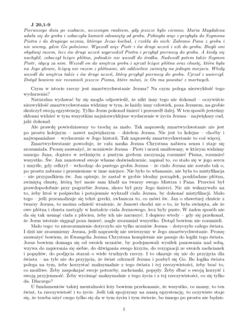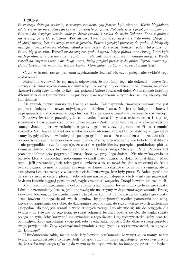 J 20,1-9 Pierwszego dnia po szabacie, wczesnym rankiem, gdy jeszcze było ciemno, Maria Magdalena udała się do grobu i zobaczyła kamień odsunięty od grobu. Pobiegła więc i przybyła do Szymona Piotra i do drugiego ucznia, którego Jezus kochał, i rzekła do nich: Zabrano Pana z grobu i nie wiemy, gdzie Go położono. Wyszedł więc Piotr i ów drugi uczeń i szli do grobu. Biegli oni obydwaj razem, lecz ów drugi uczeń wyprzedził Piotra i przybył pierwszy do grobu. A kiedy się nachylił, zobaczył leżące płótna, jednakże nie wszedł do środka. Nadszedł potem także Szymon Piotr, idący za nim. Wszedł on do wnętrza grobu i ujrzał leżące płótna oraz chustę, która była na Jego głowie, leżącą nie razem z płótnami, ale oddzielnie zwiniętą na jednym miejscu. Wtedy wszedł do wnętrza także i ów drugi uczeń, który przybył pierwszy do grobu. Ujrzał i uwierzył. Dotąd bowiem nie rozumieli jeszcze Pisma, które mówi, że On ma powstać z martwych. Czym w istocie rzeczy jest zmartwychwstanie Jezusa? Na czym polega niezwykłość tego wydarzenia? Naturalna wydawać by się mogła odpowiedź, że nikt inny tego nie dokonał – oczywiście niezwykłość zmartwychwstania widzimy w tym, że każdy inny człowiek, poza Jezusem, na grobie skończył swoją egzystencję. Tylko Jezus pokonał śmierć i przeszedł dalej. W ten sposób jesteśmy skłonni widzieć w tym wszystkim najniezwyklejsze wydarzenie w życiu Jezusa – największy cud, jaki dokonał. Ale prawdę powiedziawszy to trochę za mało. Tak naprawdę zmartwychwstanie nie jest po prostu kolejnym – nawet największym – dziełem Jezusa. Nie jest to kolejne – choćby i najwspanialsze – wydarzenie w Jego historii. Tak naprawdę zmartwychwstanie to coś więcej. Zmartwychwstanie powoduje, że cała nauka Jezusa Chrystusa nabiera sensu i staje się zrozumiała. Proszę zauważyć, że uczniowie Jezusa – Piotr i uczeń umiłowany, w którym widzimy samego Jana, dopiero w zetknięciu z pustym grobem zaczynają rozumieć Pisma, rozumieć wszystko. Św. Jan zanotował swoje własne doświadczenie, zapisał to, co stało się w jego sercu i umyśle, gdy odkrył – wchodząc do pustego grobu Jezusa – że ciało Jezusa nie zostało tak o, po prostu zabrane i przeniesione w inne miejsce. Nie było to włamanie, nie była to mistyfikacja – nie przypadkiem św. Jan opisuje, że zastał w grobie idealny porządek, poukładane płótna, zwiniętą chustę, którą być może sam kładł na twarzy swego Mistrza i Pana. Przecież był prawdopodobnie przy pogrzebie Jezusa, skoro był przy Jego śmierci. Nic nie wskazywało na to, żeby ktoś w pośpiechu i potajemnie wykradł ciało Jezusa, by dokonać mistyfikacji. Mało tego – jeśli przeanalizuje się tekst grecki, zwłaszcza to, co mówi św. Jan o sławetnej chuście z twarzy Jezusa, to można odnieść wrażenie, że Janowi chodzi nie o to, że była zwinięta, ale że owe płótna i chusta zastygły w kształcie ciała Jezusowego, lecz były puste. W żaden sposób nie da się tak usunąć ciała z płócien, żeby ich nie naruszyć. I dopiero wtedy – gdy się przekonał, że Jezus istotnie sięgnął poza śmierć, nagle zrozumiał wszystko. Dotąd bowiem nie rozumieli. Mało tego: to niezrozumienie dotyczyło nie tylko uczniów Jezusa – dotyczyło całego świata. I dziś nie zrozumiemy Jezusa, jeśli naprawdę nie uwierzymy w Jego zmartwychwstanie. Proszę zauważyć bowiem, że Ewangelia Jezusa Chrystusa kompletnie nie pasuje do logiki tego świata. Jezus bowiem domaga się od swoich uczniów, by podejmowali wysiłek panowania nad sobą, wzywa do zapierania się siebie, do dźwigania swego krzyża, do rezygnacji ze swoich zachcianek i popędów, do podjęcia starań o wiele trudnych rzeczy. I to okazuje się nie do przyjęcia dla świata – na tyle nie do przyjęcia, że świat odrzucił Jezusa i pozbył się Go. Bo logika świata polega na tym, żeby korzystać maksymalnie z tego świata i tej rzeczywistości, żeby brać to, co możliwe. Żeby zaspokajać swoje potrzeby, zachcianki, popędy. Żeby dbać o swoją korzyść i swoją przyjemność. Żeby wycisnąć maksymalnie z tego życia i z tej rzeczywistości, co się tylko da. Dlaczego? U fundamentów takiej mentalności leży bowiem przekonanie, że wszystko, co mamy, to ten świat, ta rzeczywistość i to życie. Jeśli tak spojrzymy na naszą egzystencję, to oczywiste staje się, że trzeba użyć czego tylko się da w tym życiu i tym świecie, bo innego po prostu nie będzie. 1 Na końcu jest grób i nic więcej. Więc nim człowiek trafi do grobu, nim nastąpi koniec, trzeba korzystać z czego tylko się da. A jak już się nie da korzystać, to najlepiej poprosić o eutanazję – bo po co się męczyć? I proszę zauważyć, że ludzie, którzy tak podchodzą do życia i rzeczywistości – że jest tylko to życie i ta rzeczywistość – faktycznie w ten sposób funkcjonują. Domagają się umożliwienia im zaspokajania wszelkich potrzeb i zachcianek za wszelką cenę – bo to jedyne, co człowiek może w sumie mieć. Tu mi się przypomina Leszek Kołakowski, który już w latach siedemdziesiątych ubiegłego wieku pisał, że jeżeli człowiek straci świadomość transcendencji, jeśli człowieka ograniczy się tylko do tej rzeczywistości i tego życia, to nie da się wtedy utrzymać żadnych norm, żadnej moralności. Bo jeśli wszystko kończy się na grobie i nie ma nic poza tym, co mogę mieć tutaj, to dlaczego miałbym się trzymać jakichkolwiek norm czy zasad? Wtedy właściwie wszystko jest dozwolone. Dlaczego miałbym nie kraść, nie oszukiwać, nie zabijać, nie kłamać? Dlaczego miałbym dotrzymywać słowa? Dlaczego miałbym nie zostawić żony i dzieci jeśli spodoba mi się inna? Dlaczego? Bo co? Liczy się wtedy tylko moja potrzeba i jej realizacja. Jeśli zaś istnieją jakiekolwiek normy, to są tylko umową. I tu kłania się Jan Jakub Rousseau