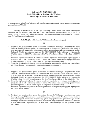 Uchwała Nr XXXIX/301/06 Rady Miejskiej w Radomyślu Wielkim z dnia 4 października 2006 roku w sprawie oceny aktualności miejscowych planów zagospodarowania przestrzennego miasta oraz gminy Radomyśl Wielki Działając na podstawie art. 18 ust. 2 pkt 15 ustawy z dnia 8 marca 1990 roku o samorządzie gminnym (Dz. U. Nr 142 z 2001 roku poz. 1591 z późniejszymi zmianami) oraz art. 32 ust. 2 i 3 ustawy z dnia 27 marca 2003 roku o planowaniu i zagospodarowaniu przestrzennym (Dz. U. Nr 80, poz. 717 z późniejszymi zmianami) Rada Miejska w Radomyślu Wielkim uchwala , co następuje : §1 1. Przyjmuje się przedstawione przez Burmistrza Radomyśla Wielkiego i zaopiniowane przez Gminną Komisję Urbanistyczno – Architektoniczną w Radomyślu Wielkim wyniki analiz i ocen dotyczących aktualności miejscowego planu zagospodarowania przestrzennego gminy Radomyśl Wielki uchwalonego uchwałą Nr XXVIII/192/97 Rady Miejskiej w Radomyślu Wielkim z dnia 11.12.1997r., ogłoszoną w Dz. Urz. Woj. Tarnowskiego Nr 2 z dnia 4.02.1998 r. 2. Stwierdza się brak aktualności 8 planów w zakresie zgodności z wymogami wynikającymi z przepisów art. 15 ust. 1 i 2 ustawy z dnia 27 marca 2003 roku o planowaniu i zagospodarowaniu przestrzennym(Dz. U. Nr 80 z 2003 r. poz. 717 z późniejszymi zmianami). 3. Stwierdza się aktualność planu w zakresie zgodności z wymogami wynikającymi z przepisów art. 16 ust. 1 ustawy o planowaniu i zagospodarowaniu przestrzennym. §2 1. Przyjmuje się przedstawione przez Burmistrza Radomyśla Wielkiego i zaopiniowane przez Gminną Komisję Urbanistyczno – Architektoniczną w Radomyślu Wielkim wyniki analiz i ocen dotyczących aktualności miejscowego planu zagospodarowania przestrzennego miasta Radomyśl Wielki uchwalonego uchwałą Nr XXVIII/193/97 Rady Miejskiej w Radomyślu Wielkim z dnia 11.12.1997r., ogłoszoną w Dz. Urz. Woj. Tarnowskiego Nr 2 z dnia 4.02.1998r. 2. Stwierdza się brak aktualności 8 planów w zakresie zgodności z wymogami wynikającymi z przepisów art. 15 ust. 1 i 2 ustawy z dnia 27 marca 2003 roku o planowaniu i zagospodarowaniu przestrzennym(Dz. U. Nr 80 z 2003 r. poz. 717 z późniejszymi zmianami). 3. Stwierdza się aktualność planu w zakresie zgodności z wymogami wynikającymi z przepisów art. 16 ust. 1 w/w ustawy. §3 1. Przyjmuje się przedstawione przez Burmistrza Radomyśla Wielkiego i zaopiniowane przez Gminną Komisję Urbanistyczno – Architektoniczną w Radomyślu Wielkim wyniki analiz i ocen dotyczących aktualności miejscowego planu zagospodarowania przestrzennego miasta Radomyśl Wielki uchwalonego uchwałą Nr XIII/112/99 Rady Miejskiej w Radomyślu Wielkim z dnia 30.12.1999r., ogłoszoną w Dz. Urz. Woj. Podkarpackiego Nr 14, poz.111 z dnia 3.03.2000r. 2. Stwierdza się brak aktualności 3 planów w zakresie zgodności z wymogami wynikającymi z przepisów art. 15 ust. 1 ustawy z dnia 27 marca 2003 r. o planowaniu i zagospodarowaniu przestrzennym (Dz. U. Nr 80 z 2003 r. poz. 717 z późniejszymi zmianami). 3. Stwierdza się aktualność planu w zakresie zgodności z wymogami wynikającymi z przepisów art. 15 ust. 2 i art. 16 ust 1 w/w ustawy. §4 1. Przyjmuje się przedstawione przez Burmistrza Radomyśla Wielkiego i zaopiniowane przez Gminną Komisję Urbanistyczno – Architektoniczną w Radomyślu Wielkim wyniki analiz i ocen dotyczących aktualności miejscowego planu zagospodarowania przestrzennego gminy Radomyśl Wielki uchwalony uchwałą Nr XIII/113/99 Rady Miejskiej w Radomyślu Wielkim z dnia 30.12.1999r., ogłoszoną w Dz. Urz. Woj. Podkarpackiego Nr 14, poz. 112 z dnia 3.03.2002r. 2. Stwierdza się brak aktualności 3 planów w zakresie zgodności z wymogami wynikającymi z przepisów art. 15 ust. 1 ustawy z dnia 27 marca 2003 r. o planowaniu i zagospodarowaniu przestrzennym (Dz. U. Nr 80 z 2003 r. poz. 717 z późniejszymi zmianami). 3. Stwierdza się aktualność planu w zakresie zgodności z wymogami wynikającymi z przepisów art. 15 ust. 2 i art. 16 ust 1 w/w ustawy. §5 1. Przyjmuje się przedstawione przez Burmistrza Radomyśla Wielkiego i zaopiniowane przez Gminną Komisję Urbanistyczno – Architektoniczną w Radomyślu Wielkim wyniki analiz i ocen dotyczących aktualności miejscowego planu zagospodarowania przestrzennego gminy Radomyśl Wielki uchwalony uchwałą Nr XXIV/293/2002 Rady Miejskiej w Radomyślu Wielkim z dnia 30.09.2002r., ogłoszoną w Dz. Urz. Woj. Podkarpackiego Nr 83, poz.1581 z dnia 10.12.2002r. 2. Stwierdza się brak aktualności 66 planów w zakresie zgodności z wymogami wynikającymi z przepisów art. 15 ust. 1 ustawy z dnia 27 marca 2003 roku o planowaniu i zagospodarowaniu przestrzennym (Dz. U. Nr 80 z 2003 r. poz. 717 z późniejszymi zmianami). 3. Stwierdza się aktualność planu w zakresie zgodności z wymogami wynikającymi z przepisów art. 15 ust. 2 i art. 16 ust. 1 w/w ustawy. §6 1. Przyjmuje się przedstawione przez Burmistrza Radomyśla Wielkiego i zaopiniowane przez Gminną Komisję Urbanistyczno – Architektoniczną w Radomyślu Wielkim wyniki analiz i ocen dotyczących aktualności miejscowego planu zagospodarowania przestrzennego miasta Radomyśl Wielki uchwalony uchwałą Nr XXIV/294/2002 Rady Miejskiej w Radomyślu Wielkim z dnia 30.09.2002r., ogłoszoną w Dz. Urz. Woj. Podkarpackiego Nr 83, poz.1585 z dnia 10.12.2002r. 2. Stwierdza się brak aktualności 11 planów w zakresie zgodności z wymogami wynikającymi z przepisów art. 15 ust. 1 ustawy z dnia 27 marca 2003 roku o planowaniu i zagospodarowaniu przestrzennym (Dz. U. Nr 80 z 2003 r. poz. 717 z późniejszymi zmianami). 3. Stwierdza się aktualność planu w zakresie zgodności z wymogami wynikającymi z przepisów art. 15 ust. 2 i art. 16 ust. 1 w/w ustawy. §7 1. Przyjmuje się przedstawione przez Burmistrza Radomyśla Wielkiego i zaopiniowane przez Gminną Komisję Urbanistyczno – Architektoniczną w Radomyślu Wielkim wyniki analiz i ocen dotyczących aktualności miejscowego planu zagospo