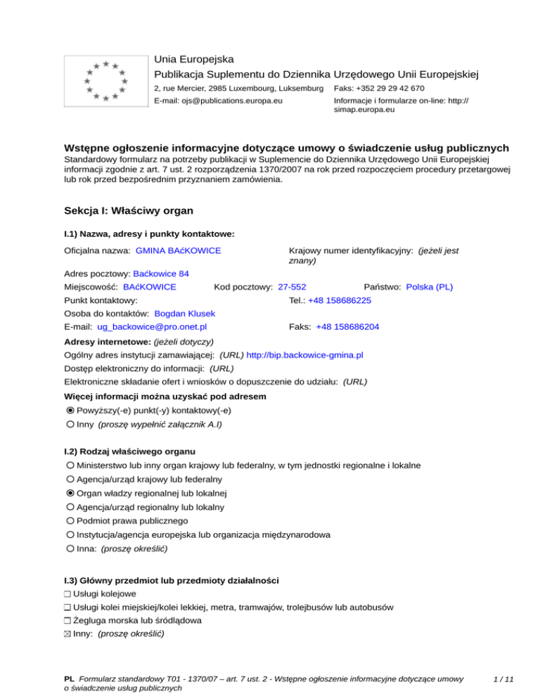Unia Europejska Publikacja Suplementu do Dziennika Urzędowego Unii Europejskiej 2, rue Mercier, 2985 Luxembourg, Luksemburg Faks: +352 29 29 42 670 E-mail: [email protected] Informacje i formularze on-line: http:// simap.europa.eu Wstępne ogłoszenie informacyjne dotyczące umowy o świadczenie usług publicznych Standardowy formularz na potrzeby publikacji w Suplemencie do Dziennika Urzędowego Unii Europejskiej informacji zgodnie z art. 7 ust. 2 rozporządzenia 1370/2007 na rok przed rozpoczęciem procedury przetargowej lub rok przed bezpośrednim przyznaniem zamówienia. Sekcja I: Właściwy organ I.1) Nazwa, adresy i punkty kontaktowe: Oficjalna nazwa: GMINA BAćKOWICE Krajowy numer identyfikacyjny: (jeżeli jest znany) _____ Adres pocztowy: Baćkowice 84 Miejscowość: BAćKOWICE Kod pocztowy: 27-552 Punkt kontaktowy: _____ Państwo: Polska (PL) Tel.: +48 158686225 Osoba do kontaktów: Bogdan Klusek E-mail: [email protected] Faks: +48 158686204 Adresy internetowe: (jeżeli dotyczy) Ogólny adres instytucji zamawiającej: (URL) http://bip.backowice-gmina.pl Dostęp elektroniczny do informacji: (URL) _____ Elektroniczne składanie ofert i wniosków o dopuszczenie do udziału: (URL) _____ Więcej informacji można uzyskać pod adresem Powyższy(-e) punkt(-y) kontaktowy(-e) Inny (proszę wypełnić załącznik A.I) I.2) Rodzaj właściwego organu Ministerstwo lub inny organ krajowy lub federalny, w tym jednostki regionalne i lokalne Agencja/urząd krajowy lub federalny Organ władzy regionalnej lub lokalnej Agencja/urząd regionalny lub lokalny Podmiot prawa publicznego Instytucja/agencja europejska lub organizacja międzynarodowa Inna: (proszę określić) I.3) Główny przedmiot lub przedmioty działalności Usługi kolejowe Usługi kolei miejskiej/kolei lekkiej, metra, tramwajów, trolejbusów lub autobusów Żegluga morska lub śródlądowa Inny: (proszę określić) PL Formularz standardowy T01 - 1370/07 – art. 7 ust. 2 - Wstępne ogłoszenie informacyjne dotyczące umowy o świadczenie usług publicznych 1 / 11 Administracja publiczna I.4) Udzielenie zamówienia w imieniu innych właściwych organów Właściwy organ dokonuje zakupu w imieniu innych właściwych organów: tak nie (jeżeli tak, więcej informacji o tych właściwych organach można podać w załączniku A.II) PL Formularz standardowy T01 - 1370/07 – art. 7 ust. 2 - Wstępne ogłoszenie informacyjne dotyczące umowy o świadczenie usług publicznych 2 / 11 Sekcja II: Przedmiot zamówienia II.1) Opis: II.1.1) Nazwa nadana zamówieniu: Wybór operatora publicznego transportu zbiorowego na terenie gminy Baćkowice II.1.2) Rodzaj zamówienia, dziedzina(-y), której(-ych) dotyczą usługi transportu publicznego: Kategoria usług: nr: T-05 (Zob. kategorie usług w załączniku B) Dziedziny, których dotyczą usługi transportu publicznego: Transport pasażerski Kod NUTS: PL332 II.1.3) Krótki opis zamówienia: Świadczenie usług w zakresie publicznego transportu zbiorowego na sieci komunikacyjnej na terenie gminy Baćkowice. Organizator dokona wyboru operatora w rtybie art. 22 ust. 1 pkt 1 ustawy z 16.12.2010 o publicznym transporcie zbiorowym (Dz.. U. z 2011 r., nr 5, poz.13 ze zm.). Umowa będzie miała formę koncesji na usługi. II.1.4) Wspólny Słownik Zamówień (CPV) Główny przedmiot Słownik główny 60112000 Słownik uzupełniający (jeżeli dotyczy) II.1.5) Informacje na temat podwykonawstwa Przewidywane jest zlecenie podwykonawstwa: tak nie (jeżeli tak) Wartość lub część zamówienia, które prawdopodobnie będzie zlecone stronom trzecim: minimalny procent: _____ (%), maksymalny procent: _____ (%) wartości zamówienia albo Nieznana Krótki opis wartości/części zamówienia, które będzie zlecone podwykonawcom: _____ II.2) Ilość i/lub wartość usług Opis: _____ km usług publicznych w zakresie transportu pasażerskiego: _____ Szacunkowy koszt bez VAT: (proszę podać wyłącznie dane liczbowe) _____ albo Zakres: między _____ i _____ Waluta: Waluta: II.3) Planowana data rozpoczęcia i czas trwania zamówienia lub termin realizacji Rozpoczęcie: 01/01/2017 (dd/mm/rrrr) Okres w miesiącach: 60 albo w dniach: _____ (od udzielenia zamówienia) PL Formularz standardowy T01 - 1370/07 – art. 7 ust. 2 - Wstępne ogłoszenie informacyjne dotyczące umowy o świadczenie usług publicznych 3 / 11 Sekcja III: Informacje o charakterze prawnym, ekonomicznym, finansowym i technicznym III.1) Warunki dotyczące zamówienia: III.1.1) Parametry kosztów w celu obliczenia rekompensaty: _____ III.1.2) Informacje o wyłącznych prawach: Przyznano wyłączne prawa tak nie (jeżeli tak) Wyszczególnienie przyznanych wyłącznych praw: _____ III.1.3) Podział przychodów ze sprzedaży biletów: Odsetek przydzielony podmiotowi świadczącemu usługi publiczne: _____ (%) (uznaje się, że pozostała część jest przyznawana właściwemu organowi) III.1.4) Standardy socjalne: (przejęcie personelu zgodnie z dyrektywą 2001/23/WE) Wykaz wymaganych standardów (w tym lista pracowników, których to dotyczy, szczegółowe informacje na temat umownych praw i zobowiązań pracowników oraz warunków, na jakich pracowników uznaje się za związanych ze świadczonymi usługami): _____ III.1.5) Zobowiązania do świadczenia usług publicznych: Wyszczególnienie: _____ III.1.6) Inne szczególne warunki: Wykonanie zamówienia podlega szczególnym warunkom (jeżeli tak) Opis szczególnych warunków: _____ tak nie III.2) Warunki udziału: III.2.1) Zdolność ekonomiczna i finansowa: Informacje i formalności konieczne do dokonania oceny Minimalny poziom ewentualnie wymaganych spełniania wymogów: standardów: _____ _____ III.2.2) Wymagania techniczne: Informacje i formalności konieczne do dokonania oceny Minimalny poziom ewentualnie wymaganych spełniania wymogów: standardów: _____ _____ III.3) Cele w zakresie jakości dla umów o usługi: Opis: _____ Informacje i bilety: _____ PL Formularz standardowy T01 - 1370/07 – 