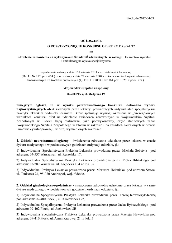Płock, dn.2012-04-24 OG ŁOSZENIE O ROZSTRZYGNIĘCIU KONKURSU OFERT KO.DKS/5-L/12 na udzielenie zamówienia na wykonywanie świadczeń zdrowotnych w rodzaju: lecznictwo szpitalne i ambulatoryjna opieka specjalistyczna na podstawie ustawy z dnia 15 kwietnia 2011 r. o działalności leczniczej (Dz. U. Nr 112, poz. 654 ) oraz ustawy z dnia 27 sierpnia 2004 r. o świadczeniach opieki zdrowotnej finansowanych ze środków publicznych (t.j. Dz.U. z 2008 r. Nr 164 poz. 1027, z późn. zm.) Wojewódzki Szpital Zespolony 09-400 Płock, ul. Medyczna 19 niniejszym ogłasza, iż w wyniku przeprowadzonego konkursu dokonano wyboru najkorzystniejszych ofert złożonych przez lekarzy prowadzących indywidualne specjalistyczne praktyki lekarskie/ podmioty lecznicze, które spełniając wymogi określone w „Szczegółowych warunkach konkursu ofert na udzielanie świadczeń zdrowotnych w Wojewódzkim Szpitalu Zespolonym w Płocku będą realizować, jako podwykonawcy, część statutowych zadań Wojewódzkiego Szpitala Zespolonego w Płocku w zakresie i na zasadach określonych w ofercie i umowie cywilnoprawnej, w niżej wymienionych zakresach: 1. Oddział neurotraumatologiczny - świadczenia zdrowotne udzielane przez lekarza w czasie dyżuru medycznego i w podstawowych godzinach ordynacji oddziału, tj.: 1) Indywidualna Specjalistyczna Praktyka Lekarska prowadzona przez Michała Sobstyla pod adresem: 04-537 Warszawa , ul. Reszelska 17, 2) Indywidualna Specjalistyczna Praktyka Lekarska prowadzona przez Piotra Bilińskiego pod adresem: 03-287 Warszawa, ul. Głębocka 104 nr lok. 32 3) Indywidualna Praktyka Lekarska prowadzona przez Mariusza Heleniaka pod adresem Stróża, ul. Tenisowa 24, 95-020 Andrespol, woj. łódzkie. 2. Oddział ginekologiczno-położniczy - świadczenia zdrowotne udzielane przez lekarza w czasie dyżuru medycznego i w podstawowych godzinach ordynacji oddziału, tj.: 1) Indywidualna Specjalistyczna Praktyka Lekarska prowadzona przez Teresę Kowalczyk-Korbę pod adresem: 09-400 Płock, , ul. Królewiecka 25, 2) Indywidualna Specjalistyczna Praktyka Lekarska prowadzona przez Jacka Rybczyńskiego pod adresem: 09-402 Płock, ul. Jachowicza 8B 3) Indywidualna Specjalistyczna Praktyka Lekarska prowadzona przez Macieja Hawryluka pod adresem: 09-410 Płock, ul. Armii Krajowej 21 nr lok. 5 3. I Oddział chirurgii ogólnej i onkologicznej - świadczenia zdrowotne udzielane przez lekarza w czasie dyżuru medycznego i w podstawowych godzinach ordynacji oddziału, tj.: 1) Indywidualna Praktyka Lekarska prowadzona przez Wiesława Wąsowskiego pod adresem: 09402 Płock, ul. Sadowa 30 3) Indywidualna Specjalistyczna Praktyka Lekarska prowadzona przez Jarosława Kapciucha pod adresem: 09-410 Płock, Nowe Golczewo, ul. Kmicica 49, 4) Indywidualna Specjalistyczna Praktyka Lekarska prowadzona przez Wiesława Sosnowskiego pod adresem: 09-402 Płock, ul. Północna 11/13, 5) Indywidualna Praktyka Lekarska prowadzona przez Marka Bromkę pod adresem: 09-409 Płock, ul. Armii Krajowej 78/37, 6) Indywidualna Specjalistyczna Praktyka Lekarska prowadzona przez Mariusza Macieja Motykę pod adresem: 09-409 Płock, ul. Wiśniewskiego 19a. 4. II Oddział chirurgii ogólnej i onkologicznej - świadczenia zdrowotne udzielane przez lekarza w czasie dyżuru medycznego i w podstawowych godzinach ordynacji oddziału, tj.: 1) Indywidualna Specjalistyczna Praktyka lekarska prowadzona przez Andrzeja Sobczaka pod adresem: 15-136 Białystok, ul. Błękitna 9 5. Szpitalny Oddział Ratunkowy - świadczenia zdrowotne udzielane przez lekarza w czasie dyżuru medycznego i w podstawowych godzinach ordynacji oddziału, tj.: 1) Indywidualna Specjalistyczna Praktyka Lekarska prowadzona przez Piotra Rykowskiego pod adresem: 09-410 Płock, , ul. Szarych Szeregów 25/26, 6. Oddział chirurgii dziecięcej - świadczenia zdrowotne udzielane przez lekarza w czasie dyżuru medycznego i w podstawowych godzinach ordynacji oddziału, tj.: 1) Indywidualna Specjalistyczna Praktyka Lekarska prowadzona przez Jacka Kołakowskiego pod adresem: 09-410 Płock, ul. Monte Cassino 2/20 , 2) Indywidualna Specjalistyczna Praktyka Lekarska prowadzona przez Witolda Majewskiego pod adresem: 87-822 Włocławek , ul. Borowska 36A 7. Oddział dziecięcy - świadczenia zdrowotne udzielane przez lekarza w czasie dyżuru medycznego i w podstawowych godzinach ordynacji oddziału, tj.: 1) Indywidualna Specjalistyczna Praktyka Lekarska prowadzona przez Joannę Sułkowską pod adresem: 09-410 Płock, ul. Sucharskiego 6/64 2) Indywidualna Specjalistyczna Praktyka Lekarska prowadzona przez Adama Ciepłuchę pod adresem: 93-479 Łódź, ul. Basenowa 6 8. Ambulatorium Chirurgii Urazowej Szpitalnego Oddziału Ratunkowego oraz Poradnia chirurgii urazowo-ortopedycznej - świadczenia zdrowotne udzielane przez lekarza w czasie dyżuru medycznego i w podstawowych godzinach ordynacji Poradni, tj.: 1) Indywidualna Praktyka Lekarska prowadzona przez Eugeniusza Klammera pod adresem: 09-402 Płock, ul. Mickiewicza 12 m.1. 2) Indywidualna Specjalistyczna Praktyka Lekarska prowadzona przez Romualda Stelmach pod adresem: 94-058 Łódź, ul. Batalionów Chłopskich 14 m. 132 oraz Ambulatorium Chirurgii Urazowej Szpitalnego Oddziału Ratunkowego -świadczenia zdrowotne udzielane przez lekarza w czasie dyżuru medycznego, tj.: 1) Indywidualna Specjalistyczna Praktyka Lekarska prowadzona przez Tadeusza Podolskiego pod adresem: 09-402 Płock, ul. Kochanowskiego 12 B 9. Świadczenia zdrowotne w zakresie konsultacji z neurologii dziecięcej, psychiatrii, tj.: 1) Indywidualna Specjalistyczna Praktyka Lekarska prowadzona przez Małgorzatę BaranowskąWideńską pod adresem: 09-400 Płock, ul. Leszczynowa 7A 2) Indywidualna Specjalistyczna Praktyka Lekarska prowadzona Wiktora Tołubińskiego pod adresem: 09-402 Płock, ul. Dworcowa 2 10. Świadczenia zdrowotne udzielane w Poradni Kardiologicznej, Poradni Neurologii dziecięcej w podstawowych godzinach ordynacji Poradni, tj.: 1) Indywidualna Specj