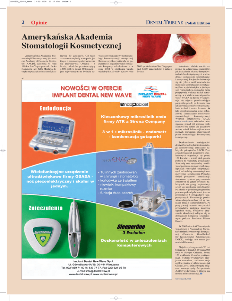 DTP0508_01-03_News 2 13.05.2008 11:17 Uhr Seite 2 DENTAL TRIBUNE Opinie Polish Edition Amerykańska Akademia Stomatologii Kosmetycznej Amerykańska Akademia Stomatologii Kosmetycznej (American Academy of Cosmetic Dentistry, AACD), założona w roku 1984 w Las Vegas przez dr. Jacka Kammera i dr. Jeffa Morleya, liczyła na początku działalności zaAD ledwie 60 członków. Od tego czasu rozwinęła się w stopniu, jakiego z pewnością nikt wówczas nie przewidywał. Obecnie – z liczbą członków przekraczającą 7.600 osób w ponad 60 krajach – jest największym na świecie to- warzystwem naukowym stomatologii kosmetycznej i estetycznej. Równie szybko zyskiwały na popularności organizowane corocznie kongresy szkoleniowe – w roku 1984 w spotkaniu wzięło udział tylko 20 osób, a już w roku 2006 spotkało się w San Diego ponad 4.000 uczestników z całego świata. Akademia kładzie nacisk zarówno na edukowanie pacjentów, jak i szkolenie lekarzy dentystów i techników dentystycznych w dziedzinie stomatologii kosmetycznej i estetycznej. Pacjentów informuje się nie tylko o możliwościach stomatologii kosmetycznej i estetycznej, lecz wyjaśnia się im, w jaki sposób rekonstrukcja uśmiechu może pozytywnie wpłynąć na ich samoocenę, a w efekcie na całą osobowość. W USA od dawna wykorzystuje się zdjęcia przedstawiające pacjentów przed i po leczeniu oraz ich doświadczenia w celu doskonalenia technik i metod leczenia. W taki sposób można też lepiej zobrazować fantastyczne możliwości stomatologii kosmetycznej. Witrynę internetową AACD (www.aacd.com) odwiedza miesięcznie ponad pół miliona osób. Stanowi ona zatem dla pacjentów ważny nośnik informacji na temat różnych rozwiązań oferowanych przez stomatologię kosmetyczną i estetyczną. Doskonalenie umiejętności dentystów w dziedzinie stomatologii kosmetycznej i estetycznej należy do priorytetów AACD. Podczas dorocznych kongresów szkoleniowych organizuje się ponad 150 kursów – wśród nich prawie połowa to warsztaty praktyczne. Stanowią one optymalną możliwość poznania najnowszych i najlepszych rozwiązań terapeutycznych z dziedziny stomatologii kosmetycznej i estetycznej. Ponadto, dzięki procesowi akredytacji, stworzono system przyznawania cenionych na całym świecie i należących do grupy najtrudniejszych do uzyskania certyfikatów. Po zdaniu 4-godzinnego egzaminu pisemnego kandydat musi jeszcze przedstawić 5 przypadków terapeutycznych. Prezentacje pozbawione danych osobowych są oceniane przez 5 egzaminatorów. Po pozytywnej ocenie wszystkich przypadków następuje końcowy egzamin ustny. Uroczyste przyznanie akredytacji odbywa się na dorocznym kongresie szkoleniowym podczas President Dinner Dance. W 2007 roku AACD nawiązała współpracę z Niemieckim Stowarzyszeniem Stomatologii Estetycznej (Deutsche Gesellschaft für Kosmetische Zahnmedizin, DGKZ), nadając mu status jednostki afiliowanej. Najbliższy kongres AACD odbędzie się w dniach 6-10 maja 2008 roku w Nowym Orleanie. Ponad 150 wykładów i kursów praktycznych, wybitni wykładowcy, przyjazna atmosfera, codzienne sesje ogólne z takimi wykładowcami, jak Geena Davis, a także bogaty program ramowy czynią z 24. spotkania AACD wydarzenie, w którym nie można nie uczestniczyć. DT www.aacd.com