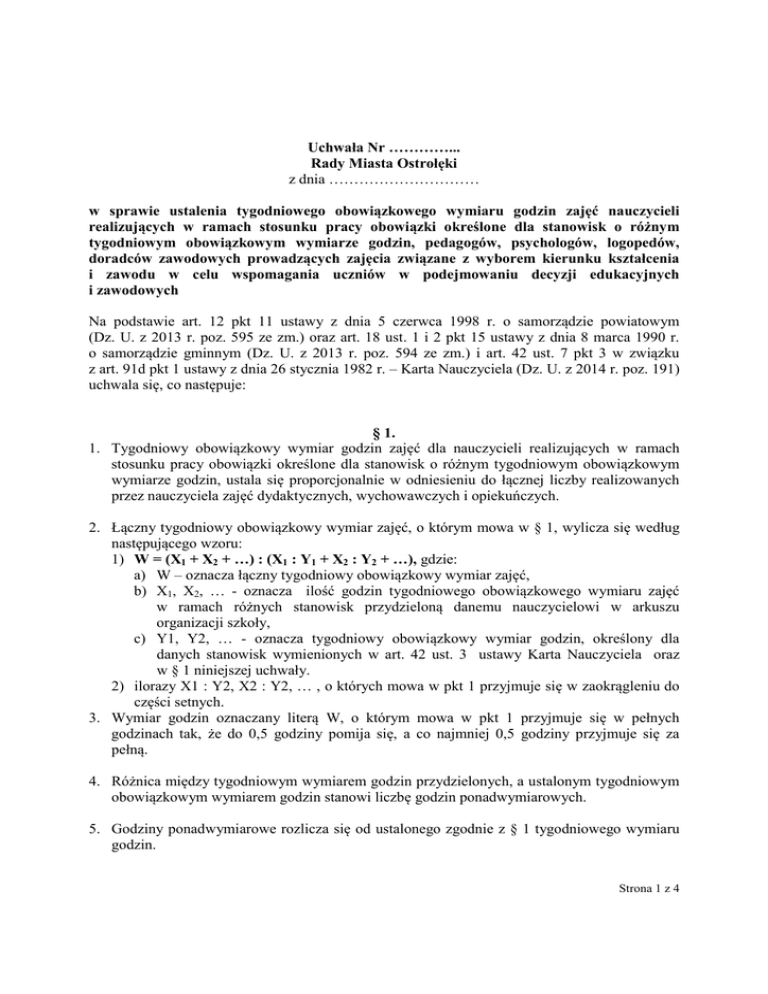 Uchwała Nr …………... Rady Miasta Ostrołęki z dnia ………………………… w sprawie ustalenia tygodniowego obowiązkowego wymiaru godzin zajęć nauczycieli realizujących w ramach stosunku pracy obowiązki określone dla stanowisk o różnym tygodniowym obowiązkowym wymiarze godzin, pedagogów, psychologów, logopedów, doradców zawodowych prowadzących zajęcia związane z wyborem kierunku kształcenia i zawodu w celu wspomagania uczniów w podejmowaniu decyzji edukacyjnych i zawodowych Na podstawie art. 12 pkt 11 ustawy z dnia 5 czerwca 1998 r. o samorządzie powiatowym (Dz. U. z 2013 r. poz. 595 ze zm.) oraz art. 18 ust. 1 i 2 pkt 15 ustawy z dnia 8 marca 1990 r. o samorządzie gminnym (Dz. U. z 2013 r. poz. 594 ze zm.) i art. 42 ust. 7 pkt 3 w związku z art. 91d pkt 1 ustawy z dnia 26 stycznia 1982 r. – Karta Nauczyciela (Dz. U. z 2014 r. poz. 191) uchwala się, co następuje: § 1. 1. Tygodniowy obowiązkowy wymiar godzin zajęć dla nauczycieli realizujących w ramach stosunku pracy obowiązki określone dla stanowisk o różnym tygodniowym obowiązkowym wymiarze godzin, ustala się proporcjonalnie w odniesieniu do łącznej liczby realizowanych przez nauczyciela zajęć dydaktycznych, wychowawczych i opiekuńczych. 2. Łączny tygodniowy obowiązkowy wymiar zajęć, o którym mowa w § 1, wylicza się według następującego wzoru: 1) W = (X1 + X2 + …) : (X1 : Y1 + X2 : Y2 + …), gdzie: a) W – oznacza łączny tygodniowy obowiązkowy wymiar zajęć, b) X1, X2, … - oznacza ilość godzin tygodniowego obowiązkowego wymiaru zajęć w ramach różnych stanowisk przydzieloną danemu nauczycielowi w arkuszu organizacji szkoły, c) Y1, Y2, … - oznacza tygodniowy obowiązkowy wymiar godzin, określony dla danych stanowisk wymienionych w art. 42 ust. 3 ustawy Karta Nauczyciela oraz w § 1 niniejszej uchwały. 2) ilorazy X1 : Y2, X2 : Y2, … , o których mowa w pkt 1 przyjmuje się w zaokrągleniu do części setnych. 3. Wymiar godzin oznaczany literą W, o którym mowa w pkt 1 przyjmuje się w pełnych godzinach tak, że do 0,5 godziny pomija się, a co najmniej 0,5 godziny przyjmuje się za pełną. 4. Różnica między tygodniowym wymiarem godzin przydzielonych, a ustalonym tygodniowym obowiązkowym wymiarem godzin stanowi liczbę godzin ponadwymiarowych. 5. Godziny ponadwymiarowe rozlicza się od ustalonego zgodnie z § 1 tygodniowego wymiaru godzin. Strona 1 z 4 6. Obowiązkowy, pełny wymiar godzin zajęć dydaktycznych, wychowawczych i opiekuńczych nauczycieli zobowiązanych do pracy w innej szkole w celu uzupełnienia obowiązkowego wymiaru zajęć dydaktycznych, ustala się wg zasad określonych w § 1. § 2. 1. Ustala się obowiązkowy tygodniowy wymiar godzin zajęć dla nauczycieli specjalistów pedagogów, psychologów, logopedów i doradców zawodowych prowadzących zajęcia związane z wyborem kierunku kształcenia i zawodu w celu wspomagania uczniów w podejmowaniu decyzji edukacyjnych i zawodowych, zatrudnionych w szkołach i przedszkolach prowadzonych przez Miasto Ostrołęka, w wymiarze 25 godzin. 2. Dla określenia tygodniowego obowiązkowego wymiaru zajęć nauczycieli specjalistów, wymienionych w ust. 1, przez godzinę należy rozumieć 60 minut. § 3. Wykonanie uchwały powierza się Prezydentowi Miasta Ostrołęki. § 4. Uchwała wchodzi w życie po upływie 14 dni od dnia ogłoszenia w Dzienniku Urzędowym Województwa Mazowieckiego. Strona 2 z 4 Uzasadnienie do projektu uchwały Rady Miasta Ostrołęki z dnia 3 lutego 2015 r. w sprawie ustalenia tygodniowego obowiązkowego wymiaru godzin zajęć nauczycieli realizujących w ramach stosunku pracy obowiązki określone dla stanowisk o różnym tygodniowym obowiązkowym wymiarze godzin, pedagogów, psychologów, logopedów, doradców zawodowych prowadzących zajęcia związane z wyborem kierunku kształcenia i zawodu w celu wspomagania uczniów w podejmowaniu decyzji edukacyjnych i zawodowych Projekt uchwały stanowi realizację delegacji ustawowej zawartej w artykule 42 ust. 7 pkt 3 ustawy Karta Nauczyciela (Dz. U. z 2014 r. poz. 191.). Zgodnie z brzmieniem wskazanego wyżej uregulowania ustawowego, organ prowadzący szkołę lub placówkę oświatową, określa zasady rozliczania tygodniowego obowiązkowego wymiaru godzin zajęć nauczycieli realizujących w ramach stosunku pracy obowiązki określone dla stanowisk o różnym tygodniowym obowiązkowym wymiarze godzin, oraz ustala tygodniowy obowiązkowy wymiar godzin zajęć niektórych nauczycieli zatrudnionych w szkołach i placówkach prowadzonych przez ten organ. Dla nauczycieli, którzy prowadzą zajęcia rozliczane według różnego tygodniowego pensum godzin, projekt uchwały określa tzw. uśrednione pensum. Projekt reguluje również tygodniowy obowiązkowy wymiar zajęć nauczycieli pedagogów, logopedów, psychologów oraz doradców zawodowych, ustalając wymiar zajęć dla tych grup pracowników - 25 godzin tygodniowo. Dotychczas wymiar ten wynosił 20 godzin tygodniowo i wynikał z przyjętej normy obowiązującej dla specjalistów poradni psychologicznopedagogicznych, których tygodniowy wymiar czasu pracy reguluje Karta Nauczyciela. Rozporządzenie Ministra Edukacji Narodowej z dnia 30 kwietnia 2013 r. w sprawie zasad udzielania i organizacji pomocy psychologiczno-pedagogicznej w publicznych przedszkolach, szkołach i placówkach (Dz. U. poz. 532) zobowiązuje dyrektorów szkół do zapewnienia uczniom Strona 3 z 4 pomocy psychologiczno-pedagogicznej odpowiednio do zdiagnozowanych potrzeb. Aktualnie w szkołach prowadzonych przez Miasto Ostrołęka są zatrudnieni nauczyciele o w/w specjalnościach na 46,4 etatach. Nie zaspakaja to potrzeb zgłaszanych przez dyrektorów szkół. Wiele samorządów podjęło już uchwały zwiększające tygodniowy wymiar godzin tych nauczycieli, ustalając ich wymiar powyżej 20 godzin tygodniowo, np. 25, 26, 30 i więcej. Zgodnie z art. 42 ust. 7 pkt 3 ustawy Karta Nauczyciela wymiar