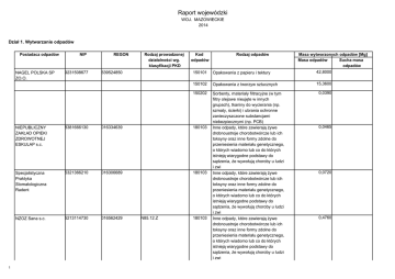 Raport wojewódzki WOJ. MAZOWIECKIE 2014 Dział 1. Wytwarzanie odpadów Posiadacz odpadów NAGEL POLSKA SP ZO.O. 1 NIP 9231508677 REGON Rodzaj prowadzonej działalności wg. klasyfikacji PKD 639524850 Kod odpadów Masa wytworzonych odpadów [Mg] Masa odpadów Sucha masa odpadów 150101 Opakowania z papieru i tektury 42,8000 150102 Opakowania z tworzyw sztucznych 15,3600 150202 Sorbenty, materiały filtracyjne (w tym filtry olejowe nieujęte w innych grupach), tkaniny do wycierania (np. szmaty, ścierki) i ubrania ochronne zanieczyszczone substancjami niebezpiecznymi (np. PCB) Inne odpady, które zawierają żywe drobnoustroje chorobotwórcze lub ich toksyny oraz inne formy zdolne do przeniesienia materiału genetycznego, o których wiadomo lub co do których istnieją wiarygodne podstawy do sądzenia, że wywołują choroby u ludzi i zwi Inne odpady, które zawierają żywe drobnoustroje chorobotwórcze lub ich toksyny oraz inne formy zdolne do przeniesienia materiału genetycznego, o których wiadomo lub co do których istnieją wiarygodne podstawy do sądzenia, że wywołują choroby u ludzi i zwi Inne odpady, które zawierają żywe drobnoustroje chorobotwórcze lub ich toksyny oraz inne formy zdolne do przeniesienia materiału genetycznego, o których wiadomo lub co do których istnieją wiarygodne podstawy do sądzenia, że wywołują choroby u ludzi i zwi NIEPUBLICZNY ZAKŁAD OPIEKI ZDROWOTNEJ ESKULAP s.c. 8381666130 016334639 180103 Specjalistyczna Praktyka Stomatologiczna Radent 5321366210 016306689 180103 NZOZ Sana s.c. 5213114730 016562429 N85.12.Z Rodzaj odpadów 180103 0,0390 0,0465 0,0720 0,4760 ZAKŁAD KOSMETYCZNY 8111265993 670160437 O93.02.Z Przychodnia Weterynaryjna Rafał Popis 8221957580 551192620 180202 GABINET LEKARSKI Hanna Olesińska 5341291142 014877726 180103 Prywatna Praktyka Stomatologiczna Malwina Burska 7991959551 145874531 180103 NZOZ CARITAS DIECEZJI PŁOCKIEJ 7740015249 040014057 O91.31.Z 180103 180103 180104 2 Inne odpady, które zawierają żywe drobnoustroje chorobotwórcze lub ich toksyny oraz inne formy zdolne do przeniesienia materiału genetycznego, o których wiadomo lub co do których istnieją wiarygodne podstawy do sądzenia, że wywołują choroby u ludzi i zwi Inne odpady, które zawierają żywe drobnoustroje chorobotwórcze lub ich toksyny oraz inne formy zdolne do przeniesienia materiału genetycznego, o których wiadomo lub co do których istnieją wiarygodne podstawy do sądzenia, że wywołują choroby u ludzi i zwi Inne odpady, które zawierają żywe drobnoustroje chorobotwórcze lub ich toksyny oraz inne formy zdolne do przeniesienia materiału genetycznego, o których wiadomo lub co do których istnieją wiarygodne podstawy do sądzenia, że wywołują choroby u ludzi i zwi Inne odpady, które zawierają żywe drobnoustroje chorobotwórcze lub ich toksyny oraz inne formy zdolne do przeniesienia materiału genetycznego, o których wiadomo lub co do których istnieją wiarygodne podstawy do sądzenia, że wywołują choroby u ludzi i zwi Inne odpady, które zawierają żywe drobnoustroje chorobotwórcze lub ich toksyny oraz inne formy zdolne do przeniesienia materiału genetycznego, o których wiadomo lub co do których istnieją wiarygodne podstawy do sądzenia, że wywołują choroby u ludzi i zwi Inne odpady niż wymienione w 18 01 03 0,0180 0,0412 0,0040 0,0431 0,0760 0,5750 WARSZAWSKIE ZAKŁADY SPRZĘTU ORTOPEDYCZNEGO S.A. 5250001055 000288053 DM35.43.Z 040108 Odpady skóry wygarbowanej zawierające chrom ( wióry, obcinki, pył ze szlifowania skór) 0,0900 120105 0,1770 190801 Odpady z toczenia i wygładzania tworzyw sztucznych Zużyte urządzenia zawierające niebezpieczne elementy inne niż wymienione w 16 02 09 do 16 02 12 Skratki 190802 Zawartość piaskowników 8,6000 190805 Ustabilizowane komunalne osady ściekowe Odpadowa tkanka zwierzęca 160213 001100347 ZAKŁAD GOSPODARKI KOMUNALNEJ I MIESZKANIOWEJ W MYSZYŃCU PPH DAREX 5361003525 013022655 020202 8,4000 74,0000 0,0100 0,0150 150101 Surowce i produkty nienadające się do spożycia i przetwórstwa Wytłoki, osady i inne odpady z przetwórstwa produktów roślinnych (z wyłączeniem 02 03 81) Nieprzydatne do wykorzystania tłuszcze spożywcze Odpadowy toner drukarski inny niż wymieniony w 08 03 17 Opakowania z papieru i tektury 150102 Opakowania z tworzyw sztucznych 0,2310 150103 Opakowania z drewna 0,0100 150104 Opakowania z metali 0,0100 150203 Sorbenty, materiały filtracyjne, tkaniny do wycierania (np. szmaty, ścierki) i ubrania ochronne inne niż wymienione w 15 02 02 Zużyte urządzenia zawierające niebezpieczne elementy inne niż wymienione w 16 02 09 do 16 02 12 Zużyte urządzenia inne niż wymienione w 16 02 09 do 16 02 13 0,0150 020203 020380 020680 080318 160213 160214 3 0,0600 0,2990 0,0100 0,0010 0,4310 0,0040 0,0050 11.10 160380 160604 Family Dental Care Centrum Stomatologii i Ortodoncji Anita Kowalska 9591623819 145921265 SPORT GRUPA Sp. z o.o. 9521514930 012747681 180103 DN36.40.Z 030105 080318 110108 120101 120102 120103 150103 150110 150202 150203 160213 4 Produkty spożywcze przeterminowane lub nieprzydatne do spożycia Baterie alkaliczne (z wyłączeniem 16 06 03) Inne odpady, które zawierają żywe drobnoustroje chorobotwórcze lub ich toksyny oraz inne formy zdolne do przeniesienia materiału genetycznego, o których wiadomo lub co do których istnieją wiarygodne podstawy do sądzenia, że wywołują choroby u ludzi i zwi Trociny, wióry, ścinki, drewno, płyta wiórowa i fornir inne niż wymienione w 03 01 04 Odpadowy toner drukarski inny niż wymieniony w 08 03 17 Osady i szlamy z fosforanowania 1,4700 Odpady z toczenia i piłowania żelaza oraz jego stopów Cząstki i pyły żelaza oraz jego stopów 16,4530 0,0010 0,0105 2,0000 0,0029 0,4000 1,0000 Odpady z toczenia i piłowania metali nieżelaznych Opakowania z drewna 0,3060 Opakowania zawierające pozostałości substancji niebezpiecznych lub nimi zanieczyszczone (np. środkami ochrony r