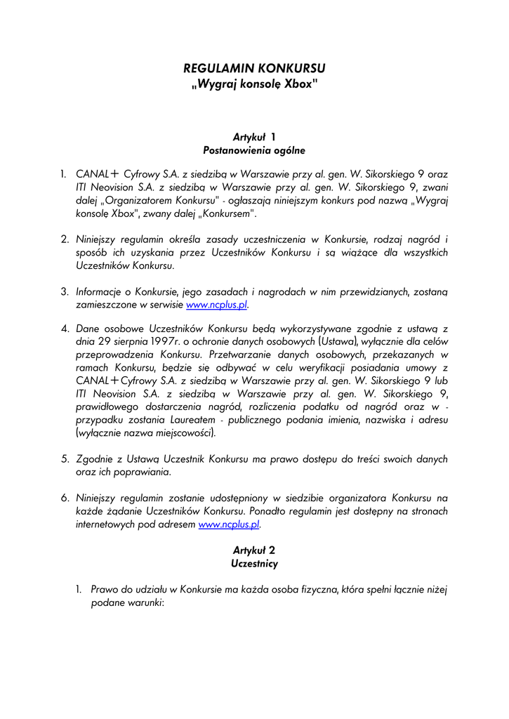 REGULAMIN KONKURSU „Wygraj konsolę Xbox” Artykuł 1 Postanowienia ogólne 1. CANAL+ Cyfrowy S.A. z siedzibą w Warszawie przy al. gen. W. Sikorskiego 9 oraz ITI Neovision S.A. z siedzibą w Warszawie przy al. gen. W. Sikorskiego 9, zwani dalej „Organizatorem Konkursu” - ogłaszają niniejszym konkurs pod nazwą „Wygraj konsolę Xbox”, zwany dalej „Konkursem”. 2. Niniejszy regulamin określa zasady uczestniczenia w Konkursie, rodzaj nagród i sposób ich uzyskania przez Uczestników Konkursu i są wiążące dla wszystkich Uczestników Konkursu. 3. Informacje o Konkursie, jego zasadach i nagrodach w nim przewidzianych, zostaną zamieszczone w serwisie www.ncplus.pl. 4. Dane osobowe Uczestników Konkursu będą wykorzystywane zgodnie z ustawą z dnia 29 sierpnia 1997r. o ochronie danych osobowych (Ustawa), wyłącznie dla celów przeprowadzenia Konkursu. Przetwarzanie danych osobowych, przekazanych w ramach Konkursu, będzie się odbywać w celu weryfikacji posiadania umowy z CANAL+Cyfrowy S.A. z siedzibą w Warszawie przy al. gen. W. Sikorskiego 9 lub ITI Neovision S.A. z siedzibą w Warszawie przy al. gen. W. Sikorskiego 9, prawidłowego dostarczenia nagród, rozliczenia podatku od nagród oraz w przypadku zostania Laureatem - publicznego podania imienia, nazwiska i adresu (wyłącznie nazwa miejscowości). 5. Zgodnie z Ustawą Uczestnik Konkursu ma prawo dostępu do treści swoich danych oraz ich poprawiania. 6. Niniejszy regulamin zostanie udostępniony w siedzibie organizatora Konkursu na każde żądanie Uczestników Konkursu. Ponadto regulamin jest dostępny na stronach internetowych pod adresem www.ncplus.pl. Artykuł 2 Uczestnicy 1. Prawo do udziału w Konkursie ma każda osoba fizyczna, która spełni łącznie niżej podane warunki: a) posiada, w okresie trwania Konkursu, umowę o abonament (świadczenie usług) zawartą z jednym z Organizatorów Konkursu1, b) nie złożyła pisemnego oświadczenia o wypowiedzeniu lub odstąpieniu od umowy o której mowa w pkt a) przed dniem rozpoczęcia Konkursu i w trakcie jego trwania, c) nie posiada zadłużenia z tytułu opłat przed dniem rozpoczęcia Konkursu i w trakcie jego trwania. 2. Konkurs nie dotyczy Abonentów CANAL+ Cyfrowy S.A. którzy uiszczają opłaty abonamentowe w formie pre-paid. Artykuł 3 Zasady Konkursu 1. Osoby chcące wziąć udział w Konkursie i spełniające warunki określone w art. 2, zwane dalej „Uczestnikami Konkursu” muszą w dniu 15 marca 2014r. przysłać na adres mailowy [email protected] e-mail z odpowiedzią na pytanie, które ukaże się na kanale CANAL+ Sport HD: a) w temacie maila należy wpisać hasło: Xbox b) w treści maila należy wpisać: — odpowiedź na pytanie zadane 15 marca 2014r. w trakcie audycji „Gorączka Piłkarskiej Soboty” nadawanej na kanale CANAL+ Sport HD — imię i nazwisko — numer PESEL podany na umowie z CANAL+ Cyfrowy S.A., w przypadku abonentów CANAL+ Cyfrowy S.A. — numer PESEL podany na umowie z ITI Neovision S.A., w przypadku abonentów ITI Neovision S.A. 2. Każdy Uczestnik Konkursu ma prawo do wzięcia udziału w Konkursie tylko jeden raz i masowe wpisy (czyli stosowanie jakiejkolwiek technologii umożliwiającej jednoczesne wpisy) nie będą dozwolone. 3. Z danego adresu email może być wysłana tylko jedna odpowiedź i tylko jednego Uczestnika Konkursu. 4. W Konkursie nie mogą brać udziału CANAL+Cyfrowy S.A. oraz ITI Neovision S.A. 1 pracownicy i współpracownicy Z wyłączeniem abonentów oferty wspólnej ITI Neovision i Cyfrowego Domu dla Klientów TP Artykuł 4 Nagrody 1. Spośród wszystkich Uczestników Konkursu, którzy prawidłowo odpowiedzieli na pytanie, zgodnie z procedurą określoną w art.3 ust.1 zostanie wyłoniony Laureat, którego mail zostanie zarejestrowany jako pierwszy. O kolejności zgłoszeń decyduje data i godzina zarejestrowania e-maila w systemie obsługującym Konkurs. 2. Laureat Konkursu otrzyma Nagrodę w postaci konsoli Xbox 360 250 GB, wraz z grą FIFA 14 o łącznej wartości 918,12 PLN brutto wraz z nagrodą pieniężną w wysokości 103 zł. 3. Wyniki Konkursu opublikowane zostaną do dnia 21.03.2014 na stronie internetowej www.ncplus.pl. 4. Laureat Konkursu zostanie poinformowany o wygranej i szczegółach za pomocą emaila, wysłanego na adres, z którego przysłał odpowiedź na pytanie zgodnie z art. 3 ust.1. 5. Z chwilą wydania Laureatowi Konkursu Nagrody Głównej, z zastrzeżeniem ust. 7 poniżej, Organizator potrąci z nagrody pieniężnej, stanowiącej część składową Nagrody Głównej, podatek od wartości całej Nagrody Głównej w wysokości 103 zł brutto. 6. Nagroda zostanie dostarczona Laureatowi Konkursu w terminie 30 dni od daty opublikowania wyników Konkursu na stronie www.ncplus.pl. 7. Nagroda nierozdana i nieodebrana przez Laureata przechodzi na rzecz Organizatora Konkursu. 8. Jedynie Laureat ma prawo do Nagrody. 9. Laureat Nagrody nie ma prawa do żądania wypłaty pieniężnego ekwiwalentu nagrody, ani zamiany jej na nagrodę innego rodzaju. 10. W przypadku braku możliwości doręczenia Nagrody z przyczyn, za które odpowiada Laureat, Organizator zastrzega możliwość przepadku Nagrody lub przyznania jej Uczestnikowi, którego mail został zarejestrowany jako następny w kolejności. Artykuł 5 Reklamacje 1. Reklamacje dotyczące spraw związanych z Konkursem należy składać do ITI Neovision S.A. w terminie 30 dni od daty ogłoszenia wyników, bezpośrednio do siedziby lub listownie (w tym przypadku decyduje data stempla pocztowego nadania). 2. Reklamacje przesłane po upływie powyższego terminu nie będą rozpatrywane. 3. Opisane wyżej reklamacje rozpatrywane będą przez Organizatora Konkursu w terminie 30 dni od daty ich otrzymania. Artykuł 6 Przechowywanie dokumentacji Dokumentacja związana z przeprowadzeniem konkursu przechowywana będzie przez organizatora Konkursu przez okres 1 roku od daty wyłonienia Laureatów Konkursu, poza dokumentacją, która zgodnie 