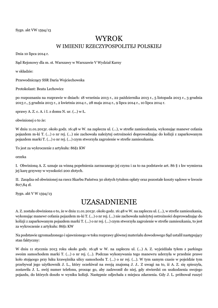 Sygn. akt VW 1594/13 WYROK W IMIENIU RZECZYPOSPOLITEJ POLSKIEJ Dnia 10 lipca 2014 r. Sąd Rejonowy dla m. st. Warszawy w Warszawie V Wydział Karny w składzie: Przewodniczący SSR Daria Wojciechowska Protokolant: Beata Lechowicz po rozpoznaniu na rozprawie w dniach: 18 września 2013 r., 22 października 2013 r., 5 listopada 2013 r., 3 grudnia 2013 r., 5 grudnia 2013 r., 2 kwietnia 2014 r., 28 maja 2014 r., 9 lipca 2014 r., 10 lipca 2014 r. sprawy A. Z. c. A. i I. z domu N. ur. (...) w Ł. obwinionej o to że: W dniu 11.01.2013r. około godz. 16:48 w W. na zapleczu ul. (...), w strefie zamieszkania, wykonując manewr cofania pojazdem m-ki T. (...) o nr rej. (...) nie zachowała należytej ostrożności doprowadzając do kolizji z zaparkowanym pojazdem marki T. (...) o nr rej. (...) czym stworzyła zagrożenie w strefie zamieszkania. To jest za wykroczenie z artykułu: 86§1 KW orzeka I. Obwinioną A. Z. uznaje za winną popełnienia zarzucanego jej czynu i za to na podstawie art. 86 § 1 kw wymierza jej karę grzywny w wysokości 200 złotych. II. Zasądza od obwinionej na rzecz Skarbu Państwa 30 złotych tytułem opłaty oraz pozostałe koszty sądowe w kwocie 807,84 zł. Sygn. akt V W 1594/13 UZASADNIENIE A. Z. została obwiniona o to, że w dniu 11.01.2013r. około godz. 16:48 w W. na zapleczu ul. (...), w strefie zamieszkania, wykonując manewr cofania pojazdem m-ki T. (...) o nr rej. (...) nie zachowała należytej ostrożności doprowadzając do kolizji z zaparkowanym pojazdem marki T. (...) o nr rej. (...) czym stworzyła zagrożenie w strefie zamieszkania, to jest za wykroczenie z artykułu: 86§1 KW Na podstawie zgromadzonego i ujawnionego w toku rozprawy głównej materiału dowodowego Sąd ustalił następujący stan faktyczny: W dniu 11 stycznia 2013 roku około godz. 16:48 w W. na zapleczu ul. (...) A. Z. wyjeżdżała tyłem z parkingu swoim samochodem marki T. (...) o nr rej. (...). Podczas wykonywania tego manewru uderzyła w przednie prawe koło stojącego przy łuku krawężnika ulicy samochodu T. (...) o nr rej. (...). W tym samym czasie w pojeździe tym przebywał jego użytkownik J. L., który oczekiwał na swoją znajomą J. J.. Z uwagi na to, iż A. Z. się spieszyła, zostawiła J. L. swój numer telefonu, prosząc go, aby zadzwonił do niej, gdy stwierdzi on uszkodzenia swojego pojazdu, do których doszło w wyniku kolizji. Następnie odjechała z miejsca zdarzenia. Gdy J. L. próbował ruszyć swoim pojazdem poczuł drgania oraz stukot przedniego zawieszenia. W dniu 16 stycznia 2013 roku udał się do warsztatu samochodowego (...), mieszczącego się przy ul. (...) w W., w którym stale serwisowany jest użytkowany przez niego samochód (poprzednia naprawa tego samochodu w tym samym warsztacie samochodowym miała miejsce w listopadzie 2012 roku). W warsztacie stwierdzono uszkodzenie prawego przedniego amortyzatora oraz zwrotnicy prawej przedniego zawieszenia. Obie te części wymieniono. Z uwagi na warunki gwarancji wymianie uległ również lewy przedni amortyzator. Koszt naprawy samochodu wyniósł 2.400 zł. J. L. telefonicznie poinformował A. Z. o przebiegu swojej wizyty w warsztacie samochodowym, prosząc ją o spotkanie w celu podpisania oświadczenia, iż jest ona sprawcą kolizji. Pomimo kilkukrotnie przekładanego terminu spotkania A. Z. nie spotkała się z J. L.. Przestała również odbierać od niego połączenia telefoniczne. Z uwagi na to J. L. poprosił o pomoc Policję. Biegły sądowy T. D. ustalił, iż podczas zdarzenia, jakie miało miejsce w dniu 11 stycznia 2013 roku około godz. 16:48 w samochodzie marki T. (...) o nr rej. (...) doszło jedynie do zgięcie prawego przedniego amortyzatora. Nie mogło dojść wówczas do uszkodzenia zwrotnicy prawej. Przy uwzględnieniu powyższego koszt naprawy samochodu T. (...) wyniósłby około 825 złotych. Powyższy stan faktyczny Sąd ustalił na podstawie: częściowych wyjaśnień obwinionej A. Z. /k. 20v, 59-60, 80/, zeznań oskarżyciela posiłkowego J. L. /k. 42-43, 7v/, zeznań świadka K. S. /k. 61/, zeznań świadka J. J. /k. 71-72/, zeznań świadka A. M. /k. 72-73/, zeznań świadka R. K. /k. 79-80/, opinii pisemnej oraz ustnej opinii uzupełniającej biegłego sądowego T. D. /k. 113-114, 104-108/, a także zawiadomienia o wykroczeniu /k. 6/, szkicu /k. 16/, protokołu oględzin /k. 3, 4, 14, 15/, dokumentacji fotograficznej /k. 70/, zestawienia i faktury k. 90-93/ oraz faktury /k. 10/ i wiadomości e-mail /k. 47/ . Obwiniona A. Z. nie przyznała się do popełnienia zarzucanego jej czynu. Wskazała, iż w dniu zdarzenia wyjeżdżała z miejsca parkingowego usytuowanego przy ulicy (...). Jej samochód zaparkowany był przodem. W samochodzie znajdowała się trójka dzieci. Zawsze w tym miejscu wyjeżdża ona w prawą stronę do tyłu, następnie jedzie do przodu, by potem skręcić w prawo w ul. (...), a następnie w ul. (...) i w ul. (...). Tego dnia padał śnieg i było ciemno, dlatego też wyjeżdżała bardzo powoli. Po wyjechaniu z miejsca parkingowego tyłem w stronę prawą zobaczyła, że pewien mężczyzna macha do niej ręką. Gdy uchyliła szybę mężczyzna ten podszedł do niej. Gdy spytała się go o powód jego reakcji, wskazał, iż uderzyła ona w jego samochód. A. Z. oświadczyła, iż nie poczuła uderzenia, dlatego jej zdaniem nie uderzyła ona w jego samochód. Gdy mężczyzna ten poprosił ją, aby podeszła do jego samochodu, wówczas swoim telefonem zaczął on podświetlać tylne koło swojego pojazdu. Z uwagi na to, iż nie znalazł śladów zdarzenia, wskazał, iż musiała ona uderzyć w oponę. Następnie zażądał on niej spisania oświadczenia. Nie podchodził wówczas do jej samochodu. Z uwagi na to, iż dwuletnia córka obwinionej zaczęła płakać, A. Z. podała mężczyźnie z grzeczności swój numer telefonu. Gdy po przyjeździe do domu wspólnie z mężem dokonali oględzin samochodu, nie stwierdzili żadnych uszkodzeń. Tydzień po zdarzenia J