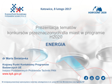 Katowice, 8 lutego 2017 Prezentacja tematów konkursów przeznaczonych dla miast w programie H2020 ENERGIA dr Maria Śmietanka Krajowy Punkt Kontaktowy Programów Badawczych UE Instytut Podstawowych Problemów Techniki PAN www.kpk.gov.pl W niniejszej prezentacji wykorzystano materiały udostępnione m.in. przez KE i/lub Ministerstwa oraz Agendy RP Industrial Leadership (Wiodąca pozycja w przemyśle) Excellent Science (Doskonała baza naukowa) • • • • Eu Rada ds. badań Naukowych (European Research Council (ERC) Infrastruktury badawcze Przyszłe i powstające technologie (Future and Emerging Technologies (FET) Granty Marii Skłodowskiej-Curie • • • Technologie wspomagające i przemysłowe , Wsparcie innowacji w MŚP, Finansowanie ryzyka – instrumenty kapitałowe i dłużne Upowszechnianie doskonałości i poszerzenie uczestnictwa (Science for and with Society)Nauka z udziałem i dla społeczeństwa Societal Challenges (Wyzwania społeczne) • • • • • • • Zdrowie, zmiany demograficzne i dobrostan Bezpieczeństwo żywnościowe, zrównoważone rolnictwo, badania morskie i gospodarka ekologiczna Bezpieczna, czysta i efektywna energia Inteligentny, ekologiczny i zintegrowany transport Działania w dziedzinie klimatu, efektywna gospodarka zasobami i surowcami Europa w zmieniającym się świecie Integracyjne, innowacyjne i refleksyjne społeczeństwa Bezpieczne społeczeństwa – ochrona wolności i bezpieczeństwa Europy i jej obywateli JRC EURATOM EIT Zamierzenia H2020 w obszarze ENERGII • Przyczynianie się do niezawodnego, trwałego i konkurencyjnego systemu energetycznego w warunkach zmniejszających się zasobów, zwiększenia zużycia energii i w kontekście zmian klimatycznych. • Odpowiedź na kryzys gospodarczy poprzez inwestowanie w przyszłe miejsca pracy i wzrost gospodarczego oraz wzmocnienie pozycji UE w świecie w zakresie badań, innowacji i technologii. 3 Energia? Co się w tym mieści? Odnawialn e źródła energii Systemy Technologi e nowej generacji Inteligentne sieci niskoemisyjn e Efektywnoś ć energetyczn a Inteligentne miasta Paliwa alternatywne Bezpieczeństw o dostaw Magazynowani e energii Biopaliwa 4 Podejście systemowe Rozwój nowych technologii Demonstracja w warunkach rzeczywistych Kontekst społeczny, ekonomiczny i prawny Integracja składników w inteligentny system Wsparcie wdrażania 5 Budżet obszaru Energia (mln euro) Konkursy 2014 2015 2016 2017 Efektywność energetyczna EE 97 98 93 101 Technologie niskoemisyjne LCE 359 372 352 367 Inteligentne miasta SCC 92 108 60 72 Instrument MŚP SME 34 37 46 50 Inne 75 61 108 79 6 SCC-1-2016-2017 Smart Cities and Communities lighthouse projects Wyzwanie: • Rozwój i testowanie zintegrowanych innowacyjnych rozwiązań w dużej skali – budynki, sieci energetyczne, transport, infrastruktura, gromadzenie energii, odnawialne źródła energii, przy wykorzystaniu najnowszych narzędzi ICT • Stworzenie miast-przykładów (lighthouse cities) dla regionów, danie szansy na powielenie rozwiązań Każdy projekt musi: • Być realizowany w 3 nowych lighthouse cities, które znajdują się w krajach UE bądź stowarzyszonych • Zaangażować minimum 3 follower cities które znajdują się w krajach UE bądź stowarzyszonych (innych niż kraje, w których znajdują się lighthouse cities danego projektu). Miasto 2 Miasto 1 Miasto 3 Miasto 1 Miasto 2 Miasto 3 Każde lighthouse city musi: Mieć plany działań na rzecz zrównoważonej energii (SEAP) zaakceptowane przez Porozumienie Burmistrzów. (należy załączyć dowód na to do wniosku projektowego) https://www.nfosigw.gov.pl/o-nfosigw/porozumienie-burmistrzow/plany-seap/ Każde lighthouse city powinno (czytaj – musi!): • • • • • • Znacząco poprawić efektywność energetyczną: innowacyjna integracja istniejących budynków z nowymi Włączyć odnawialne źródła energii bazujące na lokalnych zasobach (w tym ciepło odpadowe, magazynowanie energii). Aktywne uczestnictwo konsumentów! Integrować infrastrukturę ładowania elektrycznych pojazdów. Wprowadzić rozwiązania informatyczne poprawiające zarządzania, kontrolę i utrzymanie infrastruktury. Udowodnić współdziałanie modułów oprogramowania, aby umożliwić skuteczne zarządzanie i przepływ informacji. Otwarte platformy ICT, zwrócić uwagę na bezpieczeństwo, ochronę danych, poufność. Opracowanie innowacyjnych modeli biznesowych aby wykazać, że ryzyko techniczne, i finansowe są wystarczająco niskie dla inwestycji na dużą skalę we wszystkich miastach: dużych i małych, bogatych i biednych, i niezależnie od lokalizacji. Plany rozmieszczenia inwestycji dla lighthouse cities i szybkiej replikacji w follower cities (i potencjalnie w innych miastach) będą stanowić część oceny. Nie można sfinansować: • • • • • • Koszty budowy, Koszty modernizacji, Całkowity koszt zakupu pojazdów elektrycznych, Koszty nabycia standardowych narzędzi ICT, Montaż konwencjonalnych OZE, Izolacja ścian budynku, dobre okna; pompy ciepła i inne urządzenia. Można sfinansować: • • • • • • • • • Integracja magazynów energii z sieciami. Inteligentne zarządzanie budynkiem. Inteligentna integracja sieci elektrycznej z OZE, magazynami energii i magazynami ciepła na poziomie dzielnicy. Tylko innowacyjne elementy OZE (integracja np. modułów fotowoltaicznych czy turbin wiatrowych, połączenia z systemami zarządzania). Rozwój zintegrowanych strategii i testowanie modeli biznesowych. Inteligentna energia elektryczna, magazynowanie ciepła lub zimna i zarządzanie nim w celu maksymalizacji własnej konsumpcji. ICT: platformy bazujące na oprogramowaniu otwartym. Analizy ekonomiczne i rozwój modeli biznesowych w celu redukcji rachunków za energię obywateli. Szkolenia i edukacja (nawet w dodatkowych miastach). Oczekiwany efekt (Impact) Wprowadzenie w praktyce rozwiązań postawionych przez miasto wyzwań; Zwiększenie efektywnośc