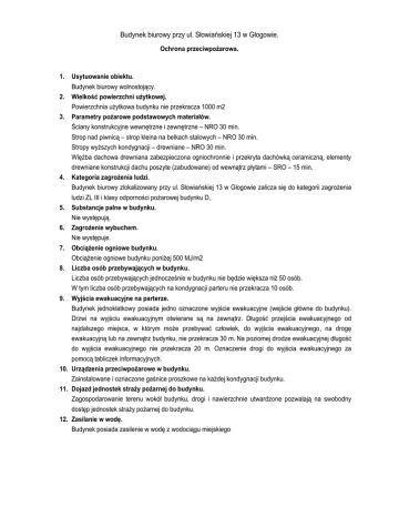 Budynek biurowy przy ul. Słowiańskiej 13 w Głogowie. Ochrona przeciwpożarowa. 1. Usytuowanie obiektu. Budynek biurowy wolnostojący. 2. Wielkość powierzchni użytkowej. Powierzchnia użytkowa budynku nie przekracza 1000 m2 3. Parametry pożarowe podstawowych materiałów. Ściany konstrukcyjne wewnętrzne i zewnętrzne – NRO 30 min. Strop nad piwnicą – strop kleina na belkach stalowych – NRO 30 min. Stropy wyższych kondygnacji – drewniane – NRO 30 min. Więźba dachowa drewniana zabezpieczona ogniochronnie i przekryta dachówką ceramiczną, elementy drewniane konstrukcji dachu poszyte (zabudowane) od wewnątrz płytami – SRO – 15 min. 4. Kategoria zagrożenia ludzi. Budynek biurowy zlokalizowany przy ul. Słowiańskiej 13 w Głogowie zalicza się do kategorii zagrożenia ludzi ZL III i klasy odporności pożarowej budynku D, 5. Substancje palne w budynku. Nie występują. 6. Zagrożenie wybuchem. Nie występuje. 7. Obciążenie ogniowe budynku. Obciążenie ogniowe budynku poniżej 500 MJ/m2 8. Liczba osób przebywających w budynku. Liczba osób przebywających jednocześnie w budynku nie będzie większa niż 50 osób. W tym liczba osób przebywających na kondygnacji parteru nie przekracza 10 osób. 9. Wyjścia ewakuacyjne na parterze. Budynek jednoklatkowy posiada jedno oznaczone wyjście ewakuacyjne (wejście główne do budynku). Drzwi na wyjściu ewakuacyjnym otwierane są na zewnątrz. Długość przejścia ewakuacyjnego od najdalszego miejsca, w którym może przebywać człowiek, do wyjścia ewakuacyjnego, na drogę ewakuacyjną lub na zewnątrz budynku, nie przekracza 30 m. Na poziomej drodze ewakuacyjnej długość do wyjścia ewakuacyjnego nie przekracza 20 m. Oznaczenie drogi do wyjścia ewakuacyjnego za pomocą tabliczek informacyjnych. 10. Urządzenia przeciwpożarowe w budynku. Zainstalowane i oznaczone gaśnice proszkowe na każdej kondygnacji budynku. 11. Dojazd jednostek straży pożarnej do budynku. Zagospodarowanie terenu wokół budynku, drogi i nawierzchnie utwardzone pozwalają na swobodny dostęp jednostek straży pożarnej do budynku. 12. Zasilanie w wodę. Budynek posiada zasilenie w wodę z wodociągu miejskiego
