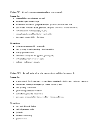 Poziom A1/I - dla osób rozpoczynających naukę od zera, semestr I. Gramatyka: nauka alfabetu koreańskiego hangeul składnia języka koreańskiego sufiksy rzeczownikowe (partykuły miejsca, podmiotu, mianownika, etc) czasowniki: tworzenie pytań, przeczeń, finitywna końcówka –mnida/-seumnida. wybrane zaimki wskazujące (i, geu, jeo) najczęściej używane klasyfikatory liczebników przeczenia czasowników – forma an- Słownictwo: podstawowe czasowniki, rzeczowniki dwa systemy liczenia (rodzimy i sino-koreański) zwroty grzecznościowe określenia czasu (lata, dni tygodnia, godziny, etc) wybrane kraje/ narodowości/ języki rodzina – podstawowe pojęcia Poziom A1/II - dla osób mających za sobą pierwsze kroki nauki języka, semestr II. Gramatyka: wprowadzenie drugiego tematu czasownika na przykładzie niefinitywnej końcówki –oso/-aso czasowniki: niefinitywna spójki –go, -nikka, -myeon, ji man, czas przeszły czasownika grupy nieregularne czasowników sufiks formy przyszłej czasownika przeczenia przymiotników i czasowników – forma analityczna Słownictwo: przyimki, kierunki świata meble i pomieszczenia jedzenie zakupy, w restauracji podróżowanie Poziom A2/I - dla osób z solidnymi podstawami języka koreańskiego, semestr III. Gramatyka: kategoria honoryfikatywności: wprowadzenie problemu honoryfikatywności/ nadawca - temat wypowiedzi – odbiorca/ infiks honoryfikatywny -si przymiotniki i czasowniki: forma przydawkowa końcówki czasowników -l kkayo?, -psida, forma wyrażająca konieczność, formy przyszłości cząstki mot, Słownictwo: zawody ubiór kolory Poziom A2/II - kontynuacja kursu na poziomie A2/I, semestr IV. Gramatyka: formy niefinitywne czasowników formy finitywne czasowników formy dokonane czasowników strona bierna czasownika Słownictwo: podróżowanie choroby, u lekarza przymiotniki określające wygląd i cechy charakteru człowieka