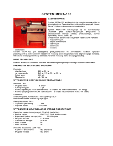 SYSTEM MERA-100 ZASTOSOWANIE System MERA-100 jest konstrukcją zaprojektowaną w biurze konstrukcyjnym Zakładów Mechaniczno Precyzyjnych „MeraBłonie” i był produkowany w tych zakładach. System MERA-100 wykorzystuje się do automatyzacji wszelkich prac biurowo-księgowych związanych z prowadzeniem małego zakładu produkcyjnego, punktu sprzedaży, hotelu, banku itp. Umożliwia on zakładanie na dyskach elastycznych kartotek: - magazynowych, - części zamiennych, - kadrowych, - płacowych, - klientów, - dostawców. System MERA-100 jest szczególnie predysponowany do prowadzenia kartotek spływów produkcyjnych z jednoczesnym śledzeniem realizacji planu i sygnalizowania zagrożeń jego realizacji. Umożliwia on edycję informacji zbiorczej na temat realizacji planu bieżącej produkcji. DANE TECHNICZNE Budowa modułowa umożliwia dobranie odpowiedniej konfiguracji do danego obszaru zastosowań. PARAMETRY TECHNICZNE MODUŁÓW Zasilanie: standardowe na zamówienie Pobór mocy Masa netto 220 V, 50 Hz 240 V, 115 V, 50 Hz, 60 Hz 600 VA ok. 100 kg WYPOSAŻENIE KONFIGURACJI PODSTAWOWEJ Procesor CPU: - Długość słowa 8 bitów - Cykl operacyjny 2 µs - Pamięć operacyjna RAM: standardowo - 8 kbajtów na zamówienie maks. - 64 kbajty - Pamięć podprogramów ROM: standardowo 2 kbajty, na zamówienie maks. 64 kbajty Klawiatura: Alfanumeryczna, numeryczna i funkcyjna wg ASCII Położenie i zestaw znaków wg wymagań. Pamięć kasetowa PK- 1 : - Zapis/odczyt metodą - Gęstość zapisu PM 32 bity/mm WYPOSAŻENIE UZUPEŁNIAJĄCE WERSJĘ PODSTAWOWĄ Pamięć na dyskach elastycznych PL- 45 D (podwójna): - Format zapisu IBM 3 74 0 (dysk jednostronny) - Pojemność jednej strony dysku 25 0 kbajtów - Długość sektora 12 8 bitów - Średni czas dostępu 30 0 ms - Ilość ścieżek 76 - Ilość sektorów 26 Drukarka mozaikowa DZM- 18 0 : - Szybkość drukowania 18 0 znaków/s - Długość wiersza 13 2 znaki - Gęstość znaków standardowo 10 znaków/cal, na zamówienie maks. 12 znaków/cal - Szerokość papieru 4 - 1 7 cali - Zestaw znaków standardowo – 6 4, na zamówienie - 96 Możliwość dołączenia drugiego transportu papieru. Monitor ekranowy firmy Burroughs gazowo-plazmowy: - Budowa znaków matryc 5x 7 - Ilość znaków w wierszu 40 - Ilość wierszy 12 Monitor ekranowy CRT- 1 9 20 : - Budowa znaków matryc 5x 7 - Ilość znaków w wierszu 80 - Ilość wierszy 22 Adapter komunikacyjny szeregowy asynchroniczno-synchroniczny wg standardu CCIT V- 2 4/V- 2 8 Pamięć taśmowa PT- 3 05 1/ 2 - Gęstość - Standard zapisu - Ilość ścieżek cal: 80 0 /1 6 00 znaków/cal NRZI/PE 9