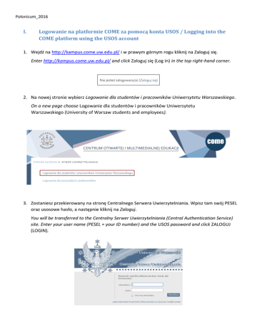 Polonicum_2016 I. Logowanie na platformie COME za pomocą konta USOS / Logging into the COME platform using the USOS account 1. Wejdź na http://kampus.come.uw.edu.pl/ i w prawym górnym rogu kliknij na Zaloguj się. Enter http://kampus.come.uw.edu.pl/ and click Zaloguj się (Log in) in the top right-hand corner. 2. Na nowej stronie wybierz Logowanie dla studentów i pracowników Uniwersytetu Warszawskiego. On a new page choose Logowanie dla studentów i pracowników Uniwersytetu Warszawskiego (University of Warsaw students and employees). 3. Zostaniesz przekierowany na stronę Centralnego Serwera Uwierzytelniania. Wpisz tam swój PESEL oraz usosowe hasło, a następnie kliknij na Zaloguj. You will be transferred to the Centralny Serwer Uwierzytelniania (Central Authentication Service) site. Enter your user name (PESEL = your ID number) and the USOS password and click ZALOGUJ (LOGIN). Polonicum_2016 4. Zostaniesz automatycznie przekierowany na stronę http://kampus.come.uw.edu.pl/. W prawym górnym rogu pojawi się Twoje imię i nazwisko, co oznacza, że jesteś już zalogowany na platformie. UWAGA: Aby móc zalogować się na platformie, musisz mieć wpisany w USOS adres email. You will be automatically transferred to the COME platform http://kampus.come.uw.edu.pl/. Your name will appear in the top right-hand corner meaning you are logged in. CAUTION: To log in the platform, it is indispensable for you to have your e-mail address contained in your USOS user account. 5. Korzystając z wyszukiwarki na stronie głównej platformy, wyszukaj kurs Test poziomujący / Placement test. Use the search engine (“Search courses”) on the main page of the platform to find the Placement test. 6. Po wyszukaniu kliknij na tytuł kursu. UWAGA: Podczas pierwszego logowania musisz wpisać jednorazowy klucz dostępu: polon2016, a następnie kliknąć na Zapisz mnie. Once you found the Placement test, choose it by clicking its name. Please note: During the first visit you will be asked for the one time password. The password is: polon2016 After filling in the password, click Enrol me. Polonicum_2016 II. Logowanie na platformie COME za pomocą „zwykłego” konta / Logging into the COME platform using a non-USOS account 1. Jeśli nie byłeś nigdy wcześniej na platformie, w pierwszej kolejności musisz założyć sobie na niej konto. Wejdź na http://kampus.come.uw.edu.pl/ If you have never logged into the platform before, create a new account. Enter the website: http://kampus.come.uw.edu.pl/ 2. W prawym górnym rogu kliknij na Zaloguj się. Zostaniesz przekierowany na kolejną stronę. Wybierz na niej opcję Logowanie dla pozostałych użytkowników. In the top right-hand corner click Log in. You will be redirected to the next page where you should choose Other users. 3. Kliknij na Zacznij teraz od utworzenia nowego konta i wypełnij formularz tworzenia konta. Click Create new account and fill in the form. Polonicum_2016 4. Po wypełnieniu formularza kliknij na Utwórz moje nowe konto. Na Twój adres e-mail zostanie przesłany link aktywacyjny. Klikając na niego potwierdzasz utworzenie konta. Od tej chwili możesz logować się na platformie. Once you have filled in the form, confirm by clicking Create my new account. An activating link will be sent to your e-mail. Clicking the link will activate your account and you will be able to log in on the platform. 5. Wejdź na stronę http://kampus.come.uw.edu.pl/ i w prawym górnym rogu kliknij na Zaloguj się. Na kolejnej stronie wybierz opcję Logowanie dla pozostałych użytkowników. Enter the website: http://kampus.come.uw.edu.pl/ and in the top right-hand corner click Log in. You will be redirected to the next page where you should choose Other users. 6. Wpisz login I hasło, a następnie kliknij na Zaloguj się. Fill in your login and password. Click Log in. Polonicum_2016 7. Po zalogowaniu zostaniesz przeniesiony na stronę główną platformy. Za pomocą wyszukiwarki kursów znajdź kurs Test poziomujący / Placement test. Once you have logged in, you will be redirected to the main page of the platform. Use the search engine (Search courses) to find Placement test. 8. Po wyszukaniu kliknij na tytuł kursu. UWAGA: Podczas pierwszego logowania musisz wpisać jednorazowy klucz dostępu: polon2016, a następnie kliknąć na Zapisz mnie. Once you found the Placement test, choose it by clicking its name. Please note: During the first visit you will be asked for the one time password. The password is: polon2016 After filling in the password, click Enrol me.