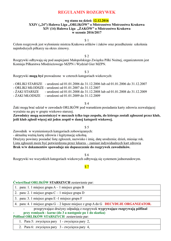 REGULAMIN ROZGRYWEK wg stanu na dzień: 12.12.2016 XXIV („24”) Halowa Liga „ORLIKÓW” o Mistrzostwo Mistrzostwa Krakowa XIV (14) Halowa Liga „ŻAKÓW” o Mistrzostwo Krakowa w sezonie 2016/2017 $1 Celem rozgrywek jest wyłonienie mistrza Krakowa orlików i żaków oraz przedłużenie szkolenia najmłodszych piłkarzy na okres zimowy. $2 Rozgrywki odbywają się pod auspicjami Małopolskiego Związku Piłki Nożnej, organizatorem jest Komisja Piłkarstwa Młodzieżowego MZPN i Wydział Gier MZPN. $3 Rozgrywki mogą być prowadzone w czterech kategoriach wiekowych: - ORLIKI STARSZE - urodzeni od 01.01.2006 do 31.12.2006 lub od 01.01.2006 do 31.12.2007 - ORLIKI MŁODSZE - urodzeni od 01.01.2007 do 31.12.2007 - ŻAKI STARSZE - urodzeni od 01.01.2008 do 31.12.2008 lub od 01.01.2008 do 31.12.2009 - ŻAKI MŁODSZE - urodzeni od 01.01.2009 do 31.12.2009 $4 Żaki mogą brać udział w zawodach ORLIKÓW pod warunkiem posiadania karty zdrowia zezwalającej wyraźnie na grę w grupie wiekowo starszej. Zawodnicy mogą uczestniczyć w meczach tylko tego zespołu, do którego zostali zgłoszeni przez klub, jeśli klub zgłosił więcej niż jeden zespół w danej kategorii wiekowej. $5 Zawodnik w wymienionych kategoriach zobowiązanych: - aktualną ważną kartę zdrowia i legitymację szkolną. Drużyny powinny posiadać listę zgłoszeń, nazwisko i imię, datę urodzenia; dzień, miesiąc rok. Lista zgłoszeń może być potwierdzona przez lekarza – zamiast indywidualnych kart zdrowia Brak w/w dokumentów spowoduje nie dopuszczenie do rozgrywek zawodników. $6 Rozgrywki we wszystkich kategoriach wiekowych odbywają się systemem jednorundowym. $7 Ćwierćfinał ORLIKÓW STARSZYCH zestawienie par: 1. para: 1. 1 miejsce grupa A – 1 miejsce grupa B 2. para: 2. 1 miejsce grupa C – 1 miejsce grupa D 3. para: 3. 1 miejsce grupa E -1 miejsce grupa F 4. para: 4. 1 miejsce grupa G – 2 lepsze miejsce z grup A do G DECYDUJE ORGANIZATOR. przegrywające drużyny odpadają z rozgrywek wygrywające rozgrywają półfinał przy remisach - karne (do 3 a następnie po 1 do skutku) Półfinał ORLIKÓW STARSZYCH zestawienie par: 1. Para 5: zwycięzca pary 1 - zwycięzca pary 2, 2. Para 6: zwycięzca pary 3 - zwycięzca pary 4, przegrywające drużyny odpadają z rozgrywek wygrywające rozgrywają finał przy remisach - karne (do 3 a następnie po 1 do skutku) Finał ORLIKÓW STARSZYCH 1. pokonany pary 5 z pokonanym pary 6 o 3 miejsce 2. zwycięzca pary 5 ze zwycięzcą pary 6 o 1 miejsce Półfinał ORLIKÓW MŁODSZYCH zestawienie par: 1. para: 1. grupa AOM 1 miejsce - 2 miejsce grupa COM 2. para: 2. grupa BOM 1 miejsce - 2 miejsce grupa BOM - 3. para: 3. grupa COM 1 miejsce - 2 miejsce grupa AOM przegrywające drużyny odpadają z rozgrywek wygrywające rozgrywają finał przy remisach - karne (do 3 a następnie po 1 do skutku) Finał ORLIKÓW MŁODSZYCH 1. zwycięzca pary 1 - zwycięzca pary 2 , 2. zwycięzca pary 2 - zwycięzca pary 3, 3. zwycięzca pary 3 - zwycięzca pary 1, Ćwierćfinał Ż A K Ó W STARSZYCH zestawienie par: 1. para: 1. grupa ASZ 1 miejsce - 2 miejsce grupa BSZ 2. para: 2. grupa BSZ 1 miejsce - 2 miejsce grupa CSZ 3. para: 3. grupa CSZ 1 miejsce - 2 miejsce grupa DSZ 4. para: 4. grupa DSZ 1 miejsce - 2 miejsce grupa ESZ 5. para: 5. grupa ESZ 1 miejsce - 2 miejsce grupa FSZ 6. para: 6. grupa FSZ 1 miejsce - 2 miejsce grupa ASZ - przegrywające drużyny odpadają z rozgrywek wygrywające rozgrywają półfinał przy remisach - karne (do 3 a następnie po 1 do skutku) Półfinał Ż A K Ó W STARSZYCH zestawienie par: 1. para 7: zwycięzca pary 1 - zwycięzca pary 2 , 2. para 8: zwycięzca pary 3 - zwycięzca pary 4, - 3. para 9: zwycięzca pary 5 - zwycięzca pary 6. przegrywające drużyny odpadają z rozgrywek wygrywające rozgrywają półfinał przy remisach - karne (do 3 a następnie po 1 do skutku) Finał Ż A K Ó W STARSZYCH zwycięzca pary 7 - zwycięzca pary 8 , zwycięzca pary 8 - zwycięzca pary 9, zwycięzca pary 9 - zwycięzca pary 7, Półfinał Ż A K Ó W MŁODSZYCH zestawienie par: para: 1. grupa AZM 1 miejsce - 2 miejsce grupa CZM para: 2. grupa BZM 1 miejsce - 2 miejsce grupa BZM para: 3. grupa CZM 1 miejsce - 2 miejsce grupa AZM przegrywające drużyny odpadają z rozgrywek wygrywające rozgrywają finał przy remisach - karne (do 3 a następnie po 1 do skutku) Finał Ż A K Ó W MŁODSZYCH 1. zwycięzca pary 1 - zwycięzca pary 2 , 2. zwycięzca pary 2 - zwycięzca pary 3, 3. zwycięzca pary 3 - zwycięzca pary 1, SKRZATY rozgrywają 4 turnieje po 6 lub 5 zespołów w grupie. Każdy turniej to inny zestaw par w danej grupie A,B,C i D. W zestawie 4 turniejów mogą się powtórzyć zestawy tych samych par. Po rozegraniu 4-go turnieju zespoły, które po 4 turniejach zajmą pierwsze i drugie miejsce w grupach A; B; C; D: rozgrywają rozgrywkę finałową wg poniższego klucza: Ćwierćfinał SKRZATÓW zestawienie par: para: 1. 1 miejsce grupa A – 2 miejsce grupa B para: 2. 1 miejsce grupa B – 2 miejsce grupa C para: 3. 1 miejsce grupa C – 2 miejsce grupa D para: 4. 1 miejsce grupa D – 2 miejsce grupa A przegrywające drużyny odpadają z rozgrywek wygrywające rozgrywają półfinał przy remisach - karne (do 3 a następnie po 1 do skutku) Półfinał SKRZATÓW zestawienie par: Para 5: zwycięzca pary 1 - zwycięzca pary 2, Para 6: zwycięzca pary 3 - zwycięzca pary 4, przy remisach - karne (do 3 a następnie po 1 do skutku) Finał SKRZATÓW zestawienie par: 1. pokonany pary 5 z pokonanym pary 6 o 3 miejsce 2. zwycięzca pary 5 ze zwycięzcą pary 6 o 1 miejsce $8 Dowód wpłaty,listy zgłoszeń wraz z kartami zdrowia należy dostarczyć najpóźniej przed pierwszym meczem organizatorom – obsłudze poszczególnych hal rozgrywek mistrzowskich. $9 Gry mistrzowskie w hali punktuje się następująco: - za zwycięstwo drużyna otrzymuje 3 pkt. - za remis drużyna otrzymuje 1 pkt. - za porażkę drużyna otrzymuje 0 pkt. $ 10 Kolejność zespołów ta