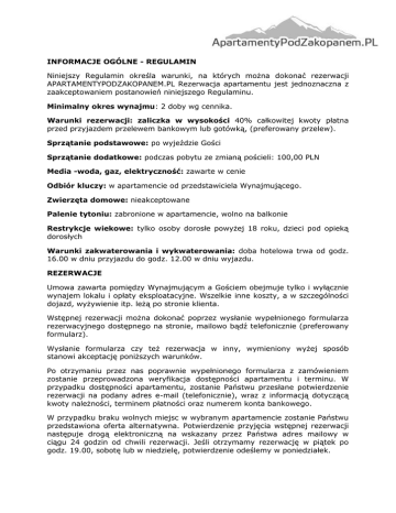 INFORMACJE OGÓLNE - REGULAMIN Niniejszy Regulamin określa warunki, na których można dokonać rezerwacji APARTAMENTYPODZAKOPANEM.PL Rezerwacja apartamentu jest jednoznaczna z zaakceptowaniem postanowień niniejszego Regulaminu. Minimalny okres wynajmu: 2 doby wg cennika. Warunki rezerwacji: zaliczka w wysokości 40% całkowitej kwoty płatna przed przyjazdem przelewem bankowym lub gotówką, (preferowany przelew). Sprzątanie podstawowe: po wyjeździe Gości Sprzątanie dodatkowe: podczas pobytu ze zmianą pościeli: 100,00 PLN Media -woda, gaz, elektryczność: zawarte w cenie Odbiór kluczy: w apartamencie od przedstawiciela Wynajmującego. Zwierzęta domowe: nieakceptowane Palenie tytoniu: zabronione w apartamencie, wolno na balkonie Restrykcje wiekowe: tylko osoby dorosłe powyżej 18 roku, dzieci pod opieką dorosłych Warunki zakwaterowania i wykwaterowania: doba hotelowa trwa od godz. 16.00 w dniu przyjazdu do godz. 12.00 w dniu wyjazdu. REZERWACJE Umowa zawarta pomiędzy Wynajmującym a Gościem obejmuje tylko i wyłącznie wynajem lokalu i opłaty eksploatacyjne. Wszelkie inne koszty, a w szczególności dojazd, wyżywienie itp. leżą po stronie klienta. Wstępnej rezerwacji można dokonać poprzez wysłanie wypełnionego formularza rezerwacyjnego dostępnego na stronie, mailowo bądź telefonicznie (preferowany formularz). Wysłanie formularza czy też rezerwacja w inny, wymieniony wyżej sposób stanowi akceptację poniższych warunków. Po otrzymaniu przez nas poprawnie wypełnionego formularza z zamówieniem zostanie przeprowadzona weryfikacja dostępności apartamentu i terminu. W przypadku dostępności apartamentu, zostanie Państwu przesłane potwierdzenie rezerwacji na podany adres e-mail (telefonicznie), wraz z informacją dotyczącą kwoty należności, terminem płatności oraz numerem konta bankowego. W przypadku braku wolnych miejsc w wybranym apartamencie zostanie Państwu przedstawiona oferta alternatywna. Potwierdzenie przyjęcia wstępnej rezerwacji następuje drogą elektroniczną na wskazany przez Państwa adres mailowy w ciągu 24 godzin od chwili rezerwacji. Jeśli otrzymamy rezerwację w piątek po godz. 19.00, sobotę lub w niedzielę, potwierdzenie odeślemy w poniedziałek. Jeśli potwierdzenie rezerwacji jest bezwzględnie konieczne w czasie weekendu prosimy o kontakt telefoniczny na numer telefonu +48 600 07 66 88.Wstępna rezerwacja jest ważna przez 72 godziny od chwili dokonania rezerwacji. W celu potwierdzenia rezerwacji wymagana jest wpłata zaliczki stanowiącej 40% całej należności na rachunek wskazany w potwierdzeniu rezerwacji. Brak wpłaty zaliczki we wskazanym terminie skutkuje anulowaniem rezerwacji. Goście dokonujący rezerwacji w terminie krótszym niż 5 dni od planowanego terminu przyjazdu zobowiązani są do niezwłocznej wpłaty zaliczki. OSTATECZNE POTWIERDZENIE REZERWACJI Ostateczne potwierdzenie rezerwacji otrzymają Państwo e-mailem lub telefonicznie w ciągu 24 godzin od wpłynięcia zaliczki na konto Wynajmującego. ZAKWATEROWANIE I WYKWATEROWANIE Zakwaterowanie Gościa następuje we wskazanym dniu przyjazdu wynajmowanym apartamencie w obecności przedstawiciela Wynajmującego. w Zakwaterowanie następuje poprzez: -uregulowanie należności, -wypełnieniu formularza na podstawie dowodu osobistego lub paszportu, -prezentację apartamentu oraz zapoznanie Gościa z jego wyposażeniem, m.in. poprzez sprawdzenie stanu zastanego ze spisem inwentarza, -przekazanie kluczy i kodów wejściowych. Wykwaterowanie następuje w apartamencie, w dniu opuszczenia apartamentu przez Gościa w obecności przedstawiciela Wynajmującego, klucze odbierane są bezpośrednio z apartamentu. Gość zobowiązany jest do poinformowania osoby odpowiedzialnej za przekazanie i odebranie kluczy najpóźniej dzień przed przyjazdem do apartamentu o planowanej godzinie odbioru kluczy. W przypadku braku możliwości dotarcia na umówioną wcześniej godzinę Gość zobowiązany jest do powiadomienia telefonicznie osoby odpowiedzialnej za przekazanie kluczy. Gość zobowiązany jest do zapłaty kwoty widniejącej na potwierdzeniu rezerwacji nawet jeśli, z przyczyn niezależnych od Wynajmującego, przyjazd lub pobyt ulegnie opóźnieniu lub skróceniu. ANULOWANIE, ZMIANA, SKRÓCENIE, PRZEDŁUŻENIE OKRESU POBYTU Rezerwację można anulować wyłącznie pisemnie - mailem. W przypadku anulowania rezerwacji na minimum 21 dni przed przyjazdem, zaliczka zostanie zwrócona. W przypadku anulowania rezerwacji w terminie krótszym niż 21 dni przed przyjazdem zaliczka nie podlega zwrotowi. Jeżeli rezerwacja nie zostanie odwołana, klient jest zobowiązany do wpłaty całości zobowiązania za zarezerwowany termin w apartamencie. Zmiana rezerwacji jest możliwa wyłącznie po akceptacji przez Wynajmującego. W przypadku skrócenia okresu pobytu przez klienta, kwota za nie wykorzystany okres nie jest zwracana. Życzenie przedłużenia pobytu poza okres wskazany w dniu przybycia, Gość powinien zgłosić przedstawicielowi Wynajmującego w dniu poprzedzającym dzień opuszczenia apartamentu. Życzenia przedłużenia pobytu uwzględnione zostaną w miarę posiadanych możliwości. PRZENIESIENIE REZERWACJI NA INNĄ OSOBĘ W każdej chwili Gość może przenieść na inną osobę wszystkie przysługujące mu z tytułu umowy rezerwacji uprawnienia, jeżeli jednocześnie osoba ta zgadza się na to i przejmuje wszystkie wynikające z tej rezerwacji obowiązki. W takiej sytuacji należy niezwłocznie powiadomić Wynajmującego o zmianie rezerwującego, podając dane personalne osoby - imię i nazwisko, telefon kontaktowy, e-mail. ZASADY OBOWIĄZUJĄCE W TRAKCIE POBYTU Wynajmujący ma obowiązek zapewnić warunki pełnego i nieskrępowanego pobytu Gościa w apartamencie. Nie ponosi odpowiedzialność za utratę lub uszkodzenie rzeczy na terenie apartamentu przez osoby użytkujące apartament. Odpowiedzialność z tytułu utraty lub uszkodzenia pieniędzy, papierów wartośc