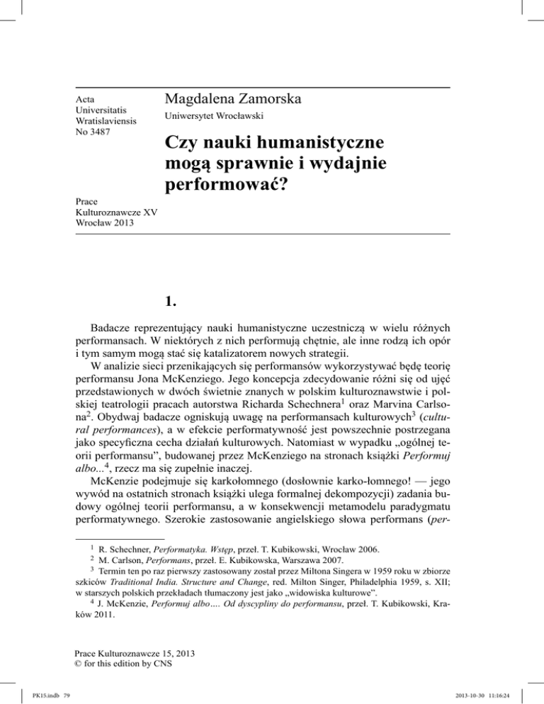 Acta Universitatis Wratislaviensis No 3487 Magdalena Zamorska Uniwersytet Wrocławski Czy nauki humanistyczne mogą sprawnie i wydajnie performować? Prace Kulturoznawcze XV Wrocław 2013 1. Badacze reprezentujący nauki humanistyczne uczestniczą w wielu różnych performansach. W niektórych z nich performują chętnie, ale inne rodzą ich opór i tym samym mogą stać się katalizatorem nowych strategii. W analizie sieci przenikających się performansów wykorzystywać będę teorię performansu Jona McKenziego. Jego koncepcja zdecydowanie różni się od ujęć przedstawionych w dwóch świetnie znanych w polskim kulturoznawstwie i polskiej teatrologii pracach autorstwa Richarda Schechnera1 oraz Marvina Carlsona2. Obydwaj badacze ogniskują uwagę na performansach kulturowych3 (cultural performances), a w efekcie performatywność jest powszechnie postrzegana jako specyficzna cecha działań kulturowych. Natomiast w wypadku „ogólnej teorii performansu”, budowanej przez McKenziego na stronach książki Performuj albo...4, rzecz ma się zupełnie inaczej. McKenzie podejmuje się karkołomnego (dosłownie karko-łomnego! — jego wywód na ostatnich stronach książki ulega formalnej dekompozycji) zadania budowy ogólnej teorii performansu, a w konsekwencji metamodelu paradygmatu performatywnego. Szerokie zastosowanie angielskiego słowa performans (per1 R. Schechner, Performatyka. Wstęp, przeł. T. Kubikowski, Wrocław 2006. M. Carlson, Performans, przeł. E. Kubikowska, Warszawa 2007. 3 Termin ten po raz pierwszy zastosowany został przez Miltona Singera w 1959 roku w zbiorze szkiców Traditional India. Structure and Change, red. Milton Singer, Philadelphia 1959, s. XII; w starszych polskich przekładach tłumaczony jest jako „widowiska kulturowe”. 4 J. McKenzie, Performuj albo…. Od dyscypliny do performansu, przeł. T. Kubikowski, Kraków 2011. 2 Prace Kulturoznawcze 15, 2013 © for this edition by CNS PK15.indb 79 2013-10-30 11:16:24 80 Magdalena Zamorska formance) jest punktem wyjścia dociekań autora, który na trzystu pięćdziesięciu stronach plecie sieć wzajemnych zależności między oddzielnymi — jak mogłoby się wydawać — performansami. W ten sposób zakreśla szerokie pole badawcze i docelowo eksponuje wagę paradygmatu performatywnego jako badawczego metamodelu sposobu funkcjonowania współczesnego świata. McKenzie rozwija swój wywód wokół performansów funkcjonujących na trzech polach ludzkiej (i nie-ludzkiej) aktywności: kultury, organizacji i technologii. Performans kulturowy, badany w ramach performatyki, jest tylko jedną z osi, a raczej jednym z centrów, węzłów5 czy zagęszczeń sieci performansu. Inne zagęszczenia, czy też używając terminologii McKenziego „pokłady performansu”, to performansy organizacyjny i technologiczny, przy czym należy dodać, że autor podkreśla arbitralność własnego wyboru tych, a nie innych pokładów. Istotą performansu kulturowego jest skuteczność (efficacy), a jego paradygmatem badawczym — performatyka; celem performansu organizacyjnego jest wydajność (efficiency), a paradygmatem operacyjnym zarządzanie performatywne; sednem performansu technologicznego jest sprawność (effectiveness) osiągana przez procedury wypracowane w ramach paradygmatu technoperformansu. McKenzie śledzi rozwój paradygmatu performatywnego na każdym z tych pól, dostrzegając wszechobecną tendencję do stopniowego uogólniania znaczenia terminu „performans”. W swojej analizie posługuje się trzema podstawowymi kategoriami: mutacyjności, normatywności i sprzężenia zwrotnego. Ze względu na cel performans można określić jako 1) mutacyjny (umożliwiający wprowadzenie pożądanych zmian) lub 2) normatywny (stojący na straży status quo). Cechą charakterystyczną każdego performansu jest występowanie pętli sprzężenia zwrotnego ( feedback loop). McKenzie odnajduje ją w transgresyjnych i w stabilizacyjnych performansach kulturowych, w procedurach performatywnego zarządzania, a także w projektowaniu i pomiarach sprawności/„osiągów” ( performance) rozmaitych maszyn i układów. Nie należy jednak sądzić, że mutacyjność i normatywność są sztywno wpisane w poszczególne pola performansu. Owszem, śledząc rozwój performatyki (czyli paradygmatu badawczego performansów kulturowych), McKenzie zauważa jej pierwotną predylekcję do postrzegania performansu kulturowego jako liminalnego, mutacyjnego, transgresyjnego i nastawionego na powodowanie zmiany. Jednak tendencję tę uznaje za pochodną sytuacji kulturowej lat 50. i 60., kiedy to kształtowała się performatyka, i podkreśla, że w latach 80. i 90. pod wpływem intensywnie rozwijającej się szeroko rozumianej teorii krytycznej (critical theory)6 5 Por. M. Castells, Społeczeństwo sieci, przeł. M. Marody et al., Warszawa 2007; idem, Siła tożsamości, przeł. S. Szymański, Warszawa 2008; idem, Koniec tysiąclecia, przeł. J. Skawiński, S. Szymański, Warszawa 2009. 6 Critical theory, [hasło w:] Stanford Encyclopedia of Philosophy, http://plato.stanford.edu/entries/critical-theory/. Prace Kulturoznawcze 15, 2013 © for this edition by CNS PK15.indb 80 2013-10-30 11:16:24 Czy nauki humanistyczne mogą sprawnie i wydajnie performować? 81 badacze performansów kulturowych (na przykład Judith Butler) zaczęli zwracać szczególną uwagę na ich moc normatywizującą. Z kolei performans organizacyjny, rozwijając się od stricte normatywizującej naukowej teorii zarządzania (tak zwany tayloryzm początków XX wieku), przez teorię stosunków międzyludzkich (HR, human relations), teorię otwartych systemów, zarządzanie pod hasłami przetwarzania informacji i decyzyjności (IPDM, Information Processing and Decision Making) i rozwoju organizacyjnego (OD, Organizational Developement), zyskuje w latach 90. XX wieku miano „sztuki zarządzania” i określenie jako „transformacyjne wyzwanie rzucone racjonalistycznym normo