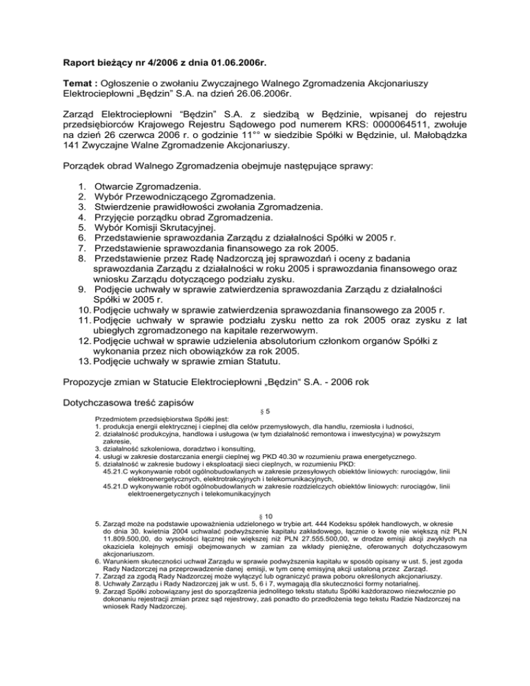 Raport bieżący nr 4/2006 z dnia 01.06.2006r. Temat : Ogłoszenie o zwołaniu Zwyczajnego Walnego Zgromadzenia Akcjonariuszy Elektrociepłowni „Będzin” S.A. na dzień 26.06.2006r. Zarząd Elektrociepłowni “Będzin” S.A. z siedzibą w Będzinie, wpisanej do rejestru przedsiębiorców Krajowego Rejestru Sądowego pod numerem KRS: 0000064511, zwołuje na dzień 26 czerwca 2006 r. o godzinie 11°° w siedzibie Spółki w Będzinie, ul. Małobądzka 141 Zwyczajne Walne Zgromadzenie Akcjonariuszy. Porządek obrad Walnego Zgromadzenia obejmuje następujące sprawy: 1. 2. 3. 4. 5. 6. 7. 8. Otwarcie Zgromadzenia. Wybór Przewodniczącego Zgromadzenia. Stwierdzenie prawidłowości zwołania Zgromadzenia. Przyjęcie porządku obrad Zgromadzenia. Wybór Komisji Skrutacyjnej. Przedstawienie sprawozdania Zarządu z działalności Spółki w 2005 r. Przedstawienie sprawozdania finansowego za rok 2005. Przedstawienie przez Radę Nadzorczą jej sprawozdań i oceny z badania sprawozdania Zarządu z działalności w roku 2005 i sprawozdania finansowego oraz wniosku Zarządu dotyczącego podziału zysku. 9. Podjęcie uchwały w sprawie zatwierdzenia sprawozdania Zarządu z działalności Spółki w 2005 r. 10. Podjęcie uchwały w sprawie zatwierdzenia sprawozdania finansowego za 2005 r. 11. Podjęcie uchwały w sprawie podziału zysku netto za rok 2005 oraz zysku z lat ubiegłych zgromadzonego na kapitale rezerwowym. 12. Podjęcie uchwał w sprawie udzielenia absolutorium członkom organów Spółki z wykonania przez nich obowiązków za rok 2005. 13. Podjęcie uchwały w sprawie zmian Statutu. Propozycje zmian w Statucie Elektrociepłowni „Będzin“ S.A. - 2006 rok Dotychczasowa treść zapisów §5 Przedmiotem przedsiębiorstwa Spółki jest: 1. produkcja energii elektrycznej i cieplnej dla celów przemysłowych, dla handlu, rzemiosła i ludności, 2. działalność produkcyjna, handlowa i usługowa (w tym działalność remontowa i inwestycyjna) w powyższym zakresie, 3. działalność szkoleniowa, doradztwo i konsulting, 4. usługi w zakresie dostarczania energii cieplnej wg PKD 40.30 w rozumieniu prawa energetycznego. 5. działalność w zakresie budowy i eksploatacji sieci cieplnych, w rozumieniu PKD: 45.21.C wykonywanie robót ogólnobudowlanych w zakresie przesyłowych obiektów liniowych: rurociągów, linii elektroenergetycznych, elektrotrakcyjnych i telekomunikacyjnych, 45.21.D wykonywanie robót ogólnobudowlanych w zakresie rozdzielczych obiektów liniowych: rurociągów, linii elektroenergetycznych i telekomunikacyjnych § 10 5. Zarząd może na podstawie upoważnienia udzielonego w trybie art. 444 Kodeksu spółek handlowych, w okresie do dnia 30. kwietnia 2004 uchwalać podwyższenie kapitału zakładowego, łącznie o kwotę nie większą niż PLN 11.809.500,00, do wysokości łącznej nie większej niż PLN 27.555.500,00, w drodze emisji akcji zwykłych na okaziciela kolejnych emisji obejmowanych w zamian za wkłady pieniężne, oferowanych dotychczasowym akcjonariuszom. 6. Warunkiem skuteczności uchwał Zarządu w sprawie podwyższenia kapitału w sposób opisany w ust. 5, jest zgoda Rady Nadzorczej na przeprowadzenie danej emisji, w tym cenę emisyjną akcji ustaloną przez Zarząd. 7. Zarząd za zgodą Rady Nadzorczej może wyłączyć lub ograniczyć prawa poboru określonych akcjonariuszy. 8. Uchwały Zarządu i Rady Nadzorczej jak w ust. 5, 6 i 7, wymagają dla skuteczności formy notarialnej. 9. Zarząd Spółki zobowiązany jest do sporządzenia jednolitego tekstu statutu Spółki każdorazowo niezwłocznie po dokonaniu rejestracji zmian przez sąd rejestrowy, zaś ponadto do przedłożenia tego tekstu Radzie Nadzorczej na wniosek Rady Nadzorczej. § 13 1. Rada Nadzorcza składa się z 6 członków, w tym z 4 członków Rady Nadzorczej reprezentujących akcjonariuszy i 2 członków Rady Nadzorczej reprezentujących pracowników. 4. W przypadku zmniejszenia się składu Rady Nadzorczej o członków innych niż wybierani przez pracowników spółki Walne Zgromadzenie w terminie miesiąca od chwili uzyskania informacji o zaistniałej okoliczności uzupełni skład Rady w obowiązującym trybie, określonym w ust.3. 6. Na pisemny wniosek co najmniej 15% ogółu pracowników spółki przeprowadza się głosowanie o odwołanie członka Rady Nadzorczej wybranego przez pracowników Spółki. Zasady przeprowadzania głosowania określa regulamin wyboru i odwołania członków Rady Nadzorczej, wybieranych przez pracowników określony w ust.7 § 17 2. Do zakresu kompetencji Rady Nadzorczej należy w szczególności: 11).zezwolenie na zawieranie, zmiany lub zakończenie umów między Spółką a osobami trzecimi, jeśli umowy te mają duże znaczenie dla Spółki. Za umowy o dużym znaczeniu dla Spółki uznaje się, ale nie wyłącznie, umowy, których okres obowiązywania przekracza pięć lat lub które oznaczają dla Spółki zobowiązania finansowe przekraczające 700.000,00 PLN. Inwestycje należy zawsze zatwierdzać o ile każdorazowe przedsięwzięcie prowadzi do zobowiązań wyższych niż 700.000,00 PLN. Zdania pierwszego nie stosuje się do umów rocznych zawieranych przez Spółkę na zakup surowców do produkcji ciepła i energii elektrycznej jak również do umów rocznych zawieranych przez Spółkę na sprzedaż ciepła i energii elektrycznej; w tym zakresie Rada Nadzorcza może wymagać przedstawienia informacji. § 18 1. Członkowie Rady Nadzorczej wykonują swoje prawa i obowiązki osobiście. Proponowana treść zapisów §5 Przedmiotem przedsiębiorstwa Spółki jest: 1. produkcja ciepła (pary wodnej i gorącej wody) wg PKD 40.30.A, 2. dystrybucja ciepła (pary wodnej i gorącej wody) wg PKD 40.30.B 3 .działalność szkoleniowa, doradztwo i konsulting, 4. wytwarzanie energii elektrycznej wg PKD 40.11.Z, 5. przesyłanie energii elektrycznej wg PKD 40.12.Z, 6. dystrybucja i sprzedaż energii elektrycznej wg PKD 40.13.Z 7. działalność w zakresie budowy i 