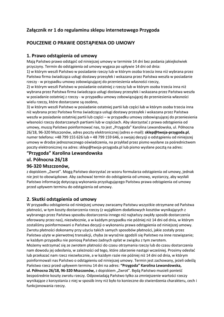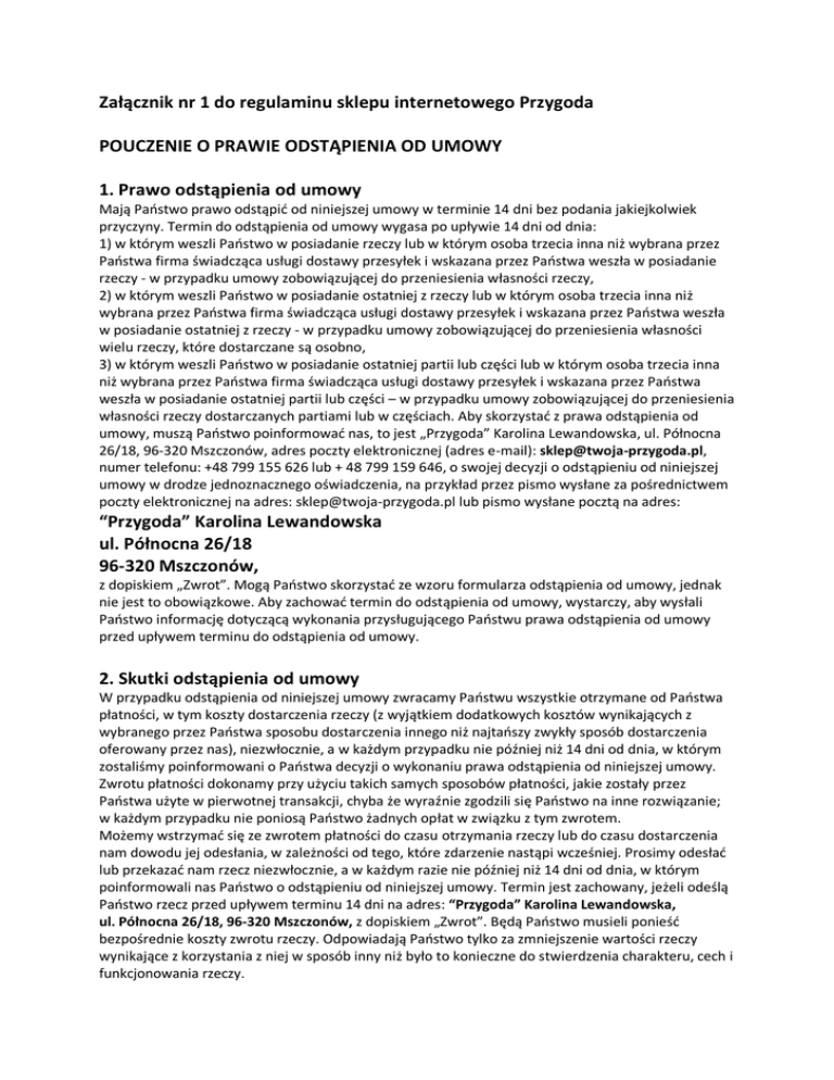 Załącznik nr 1 do regulaminu sklepu internetowego Przygoda POUCZENIE O PRAWIE ODSTĄPIENIA OD UMOWY 1. Prawo odstąpienia od umowy Mają Państwo prawo odstąpić od niniejszej umowy w terminie 14 dni bez podania jakiejkolwiek przyczyny. Termin do odstąpienia od umowy wygasa po upływie 14 dni od dnia: 1) w którym weszli Państwo w posiadanie rzeczy lub w którym osoba trzecia inna niż wybrana przez Państwa firma świadcząca usługi dostawy przesyłek i wskazana przez Państwa weszła w posiadanie rzeczy - w przypadku umowy zobowiązującej do przeniesienia własności rzeczy, 2) w którym weszli Państwo w posiadanie ostatniej z rzeczy lub w którym osoba trzecia inna niż wybrana przez Państwa firma świadcząca usługi dostawy przesyłek i wskazana przez Państwa weszła w posiadanie ostatniej z rzeczy - w przypadku umowy zobowiązującej do przeniesienia własności wielu rzeczy, które dostarczane są osobno, 3) w którym weszli Państwo w posiadanie ostatniej partii lub części lub w którym osoba trzecia inna niż wybrana przez Państwa firma świadcząca usługi dostawy przesyłek i wskazana przez Państwa weszła w posiadanie ostatniej partii lub części – w przypadku umowy zobowiązującej do przeniesienia własności rzeczy dostarczanych partiami lub w częściach. Aby skorzystać z prawa odstąpienia od umowy, muszą Państwo poinformować nas, to jest „Przygoda” Karolina Lewandowska, ul. Północna 26/18, 96-320 Mszczonów, adres poczty elektronicznej (adres e-mail): [email protected], numer telefonu: +48 799 155 626 lub + 48 799 159 646, o swojej decyzji o odstąpieniu od niniejszej umowy w drodze jednoznacznego oświadczenia, na przykład przez pismo wysłane za pośrednictwem poczty elektronicznej na adres: [email protected] lub pismo wysłane pocztą na adres: “Przygoda” Karolina Lewandowska ul. Północna 26/18 96-320 Mszczonów, z dopiskiem „Zwrot”. Mogą Państwo skorzystać ze wzoru formularza odstąpienia od umowy, jednak nie jest to obowiązkowe. Aby zachować termin do odstąpienia od umowy, wystarczy, aby wysłali Państwo informację dotyczącą wykonania przysługującego Państwu prawa odstąpienia od umowy przed upływem terminu do odstąpienia od umowy. 2. Skutki odstąpienia od umowy W przypadku odstąpienia od niniejszej umowy zwracamy Państwu wszystkie otrzymane od Państwa płatności, w tym koszty dostarczenia rzeczy (z wyjątkiem dodatkowych kosztów wynikających z wybranego przez Państwa sposobu dostarczenia innego niż najtańszy zwykły sposób dostarczenia oferowany przez nas), niezwłocznie, a w każdym przypadku nie później niż 14 dni od dnia, w którym zostaliśmy poinformowani o Państwa decyzji o wykonaniu prawa odstąpienia od niniejszej umowy. Zwrotu płatności dokonamy przy użyciu takich samych sposobów płatności, jakie zostały przez Państwa użyte w pierwotnej transakcji, chyba że wyraźnie zgodzili się Państwo na inne rozwiązanie; w każdym przypadku nie poniosą Państwo żadnych opłat w związku z tym zwrotem. Możemy wstrzymać się ze zwrotem płatności do czasu otrzymania rzeczy lub do czasu dostarczenia nam dowodu jej odesłania, w zależności od tego, które zdarzenie nastąpi wcześniej. Prosimy odesłać lub przekazać nam rzecz niezwłocznie, a w każdym razie nie później niż 14 dni od dnia, w którym poinformowali nas Państwo o odstąpieniu od niniejszej umowy. Termin jest zachowany, jeżeli odeślą Państwo rzecz przed upływem terminu 14 dni na adres: “Przygoda” Karolina Lewandowska, ul. Północna 26/18, 96-320 Mszczonów, z dopiskiem „Zwrot”. Będą Państwo musieli ponieść bezpośrednie koszty zwrotu rzeczy. Odpowiadają Państwo tylko za zmniejszenie wartości rzeczy wynikające z korzystania z niej w sposób inny niż było to konieczne do stwierdzenia charakteru, cech i funkcjonowania rzeczy.