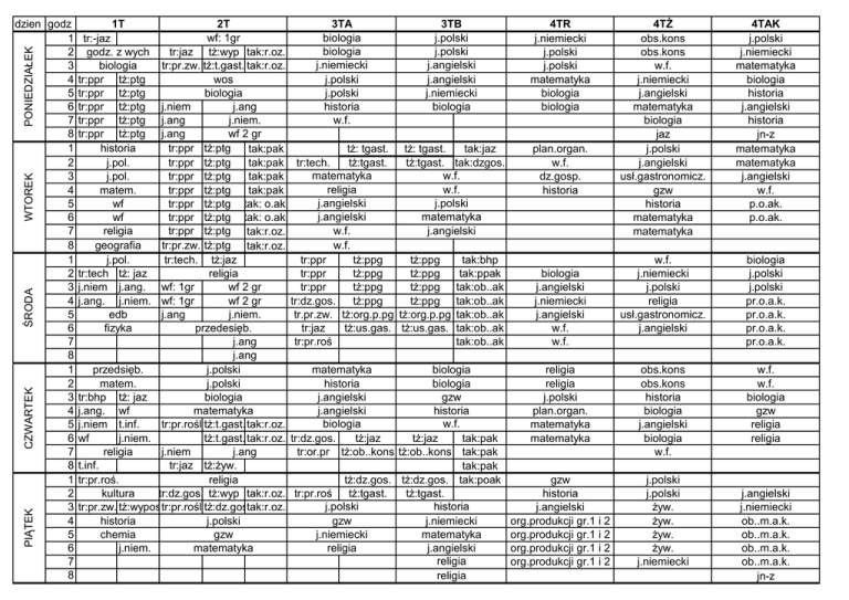 PIĄTEK CZWARTEK ŚRODA WTOREK PONIEDZIAŁEK dzien godz 1 2 3 4 5 6 7 8 1 2 3 4 5 6 7 8 1 2 3 4 5 6 7 8 1 2 3 4 5 6 7 8 1 2 3 4 5 6 7 8 1T 2T 3TA wf: 1gr biologia tr:-jaz biologia godz. z wych tr:jaz tż:wyp tak:r.oz. j.niemiecki biologia tr:pr.zw. tż:t.gast. tak:r.oz. tr:ppr tż:ptg wos j.polski tr:ppr tż:ptg biologia j.polski tr:ppr tż:ptg j.niem j.ang historia tr:ppr tż:ptg j.ang j.niem. w.f. tr:ppr tż:ptg j.ang wf 2 gr historia tr:ppr tż:ptg tak:pak tż: tgast. j.pol. tr:ppr tż:ptg tak:pak tr:tech. tż:tgast. matematyka j.pol. tr:ppr tż:ptg tak:pak religia matem. tr:ppr tż:ptg tak:pak j.angielski wf tr:ppr tż:ptg tak: o.ak. j.angielski wf tr:ppr tż:ptg tak: o.ak. tr:ppr tż:ptg tak:r.oz. w.f. religia tr:pr.zw. tż:ptg tak:r.oz. w.f. geografia j.pol. tr:tech. tż:jaz tr:ppr tż:ppg tr:tech tż: jaz religia tr:ppr tż:ppg j.niem j.ang. wf: 1gr wf 2 gr tr:ppr tż:ppg j.ang. j.niem. wf: 1gr wf 2 gr tr:dz.gos. tż:ppg edb j.ang j.niem. tr.pr.zw. tż:org.p.pg fizyka przedesięb. tr:jaz tż:us.gas. j.ang tr:pr.roś j.ang przedsięb. j.polski matematyka matem. j.polski historia tr:bhp tż: jaz biologia j.angielski j.ang. wf matematyka j.angielski biologia j.niem t.inf. tr:pr.rośl.tż:t.gast. tak:r.oz. wf j.niem. tż:t.gast. tak:r.oz. tr:dz.gos. tż:jaz religia j.niem j.ang tr:or.pr tż:ob..kons t.inf. tr:jaz tż:żyw. tr:pr.roś. religia tż:dz.gos. kultura tr:dz.gos. tż:wyp tak:r.oz. tr:pr.roś tż:tgast. j.polski tr:pr.zw. tż:wypos.tr:pr.rośl.tż:dz.gos.tak:r.oz. historia j.polski gzw chemia gzw j.niemiecki j.niem. matematyka religia 3TB j.polski j.polski j.angielski j.angielski j.niemiecki biologia tż: tgast. tak:jaz tż:tgast. tak:dzgos. w.f. w.f. j.polski matematyka j.angielski tż:ppg tż:ppg tż:ppg tż:ppg tż:org.p.pg tż:us.gas. tak:bhp tak:ppak tak:ob..ak tak:ob..ak tak:ob..ak tak:ob..ak tak:ob..ak biologia biologia gzw historia w.f. tż:jaz tak:pak tż:ob..kons tak:pak tak:pak tż:dz.gos. tak:poak tż:tgast. historia j.niemiecki matematyka j.angielski religia religia 4TŻ obs.kons obs.kons w.f. j.niemiecki j.angielski matematyka biologia jaz j.polski j.angielski usł.gastronomicz. gzw historia matematyka matematyka 4TAK j.polski j.niemiecki matematyka biologia historia j.angielski historia jn-z matematyka matematyka j.angielski w.f. p.o.ak. p.o.ak. w.f. j.niemiecki j.polski religia usł.gastronomicz. j.angielski biologia j.polski j.polski pr.o.a.k. pr.o.a.k. pr.o.a.k. pr.o.a.k. religia religia j.polski plan.organ. matematyka matematyka obs.kons obs.kons historia biologia j.angielski biologia w.f. w.f. w.f. biologia gzw religia religia gzw historia j.angielski org.produkcji gr.1 i 2 org.produkcji gr.1 i 2 org.produkcji gr.1 i 2 org.produkcji gr.1 i 2 j.polski j.polski żyw. żyw. żyw. żyw. j.niemiecki 4TR j.niemiecki j.polski j.polski matematyka biologia biologia plan.organ. w.f. dz.gosp. historia biologia j.angielski j.niemiecki j.angielski w.f. w.f. j.angielski j.niemiecki ob..m.a.k. ob..m.a.k. ob..m.a.k. ob..m.a.k. jn-z 1 ZSZ praktyka praktyka praktyka praktyka praktyka praktyka praktyka praktyka praktyka praktyka praktyka praktyka praktyka praktyka praktyka praktyka religia edb religia j.polski fizyka j.angielski inf.historia przedsięb. matematyka chemia w.f. biologia -inf. gzw geografia j.polski w.f. w.f. przedsięb. matematyka 2 ZSZ gzw wf j.ang. j.polski j.ang. wf j.ang. wf j.polski matematyka matematyka j.ang. wf wf j.ang. wf j.ang. j.polski religia w.o.s. historia religia k:dz.gosp w:praktyka k:jaz w:praktyka k:t.gast. w:praktyka k:t.gast. w:praktyka w:praktyka w:praktyka w:praktyka w:praktyka k:gas.pr. w:praktyka k:gas.pr. w:praktyka k:gas.pr. w:praktyka k:gas.pr. w:praktyka k:gas.pr. w:praktyka k:wyp.z.g. w:praktyka k:wyp.z.g. w:praktyka w:praktyka k:ppg w:praktyka k:ppg w:praktyka k:ppg w:praktyka k:ppg w:praktyka w:praktyka w:praktyka w:praktyka w:praktyka 3 ZSZ A gastr.w pr. gastr.w pr. gastr.w pr. gastr.w pr. gastr.w pr. t.gastr. t.gastr. gastr.w pr. gastr.w pr. gastr.w pr. gastr.w pr. gastr.w pr. t.gastr. t.gastr. dz.gosp.w gast. j.a.z. dz.gosp.w gast. pr.prod.gast. pr.prod.gast. pr.prod.gast. pr.prod.gast. dz.gosp.w gast. w.f. w.f. w.f. religia religia gzw t.gastr. 3 ZSZ B praktyka praktyka praktyka praktyka praktyka praktyka praktyka praktyka praktyka praktyka praktyka praktyka praktyka praktyka praktyka praktyka praktyka praktyka praktyka praktyka praktyka praktyka praktyka praktyka praktyka praktyka praktyka praktyka praktyka praktyka praktyka praktyka wdż religia religia wf wf wf gzw -----