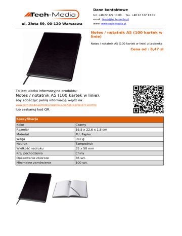 Dane kontaktowe tel. +48 22 122 13 00 , fax. +48 22 122 13 01 email: [email protected] ul. Złota 59, 00-120 Warszawa www: www.tech-media.pl Notes / notatnik A5 (100 kartek w linie) Notes / notatnik A5 (100 kartek w linie) z tasiemką Cena od : 8,47 zł To jest ulotka informacyjna produktu: Notes / notatnik A5 (100 kartek w linie) , aby zobaczyć pełną informację wejdź na: www.tech-media.pl/notes,notatnik,a,kartek,w,linie,07718.html lub zeskanuj kod QR. Specyfikacja Kolor Czarny Rozmiar 16,5 x 22,6 x 1,8 cm Materiał PU, Papier Waga 392 g Nadruk Tampodruk Wielkość nadruku 35 x 50 mm Kraj pochodzenia Chiny Opakowanie zbiorcze 36 szt. Minimalne zamówienie 100 szt.