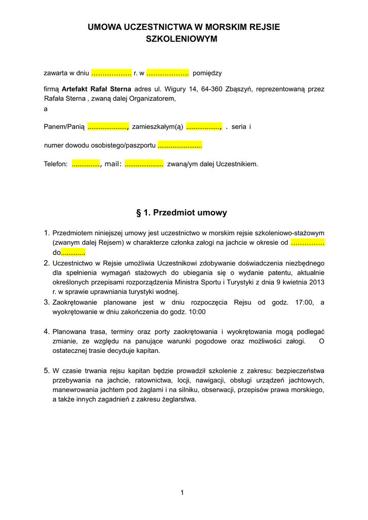 UMOWA UCZESTNICTWA W MORSKIM REJSIE SZKOLENIOWYM zawarta w dniu ……………… r. w ………………. pomiędzy firmą Artefakt Rafał Sterna adres ul. Wigury 14, 64-360 Zbąszyń, reprezentowaną przez Rafała Sterna , zwaną dalej Organizatorem, a Panem/Panią …………………, zamieszkałym(ą) ………………, . seria i numer dowodu osobistego/paszportu …………………… Telefon: ……………, mail: ………………… zwaną/ym dalej Uczestnikiem. § 1. Przedmiot umowy 1. Przedmiotem niniejszej umowy jest uczestnictwo w morskim rejsie szkoleniowo-stażowym (zwanym dalej Rejsem) w charakterze członka załogi na jachcie w okresie od …………… do…………. 2. Uczestnictwo w Rejsie umożliwia Uczestnikowi zdobywanie doświadczenia niezbędnego dla spełnienia wymagań stażowych do ubiegania się o wydanie patentu, aktualnie określonych przepisami rozporządzenia Ministra Sportu i Turystyki z dnia 9 kwietnia 2013 r. w sprawie uprawniania turystyki wodnej. 3. Zaokrętowanie planowane jest w dniu rozpoczęcia Rejsu od godz. 17:00, a wyokrętowanie w dniu zakończenia do godz. 10:00 4. Planowana trasa, terminy oraz porty zaokrętowania i wyokrętowania mogą podlegać zmianie, ze względu na panujące warunki pogodowe oraz możliwości załogi. ostatecznej trasie decyduje kapitan. O 5. W czasie trwania rejsu kapitan będzie prowadził szkolenie z zakresu: bezpieczeństwa przebywania na jachcie, ratownictwa, locji, nawigacji, obsługi urządzeń jachtowych, manewrowania jachtem pod żaglami i na silniku, obserwacji, przepisów prawa morskiego, a także innych zagadnień z zakresu żeglarstwa. 1 § 2. Warunki płatności 1. Z tytułu uczestnictwa w Rejsie Uczestnik zobowiązany jest zapłacić Organizatorowi wynagrodzenie w kwocie ………………….. 2. Kwota wynagrodzenia wskazanego w ust. 1 obejmuje: - opiekę kapitana i szkolenie w zakresie określonym w § 1 ust. 5, - miejsce do spania na jachcie. 3. Wynagrodzenie, o którym mowa w ust. 1, nie zawiera: a) składki Uczestnika do kasy jachtowej na poczet prowiantu na czas trwania rejsu; b) Uczestnik zobowiązuje się do zapłaty wynagrodzenia wskazanego w ust. 1 na rachunek Organizatora Numer: 13 1140 2004 0000 3502 3710 0282 do dnia: …………………… Wpłaty będą dokonywane z oznaczeniem danych Uczestnika oraz tytułu wpłaty: „opłata za rejs szkoleniowy, imię i nazwisko uczestnika”. 4. Wynagrodzenie i składniki opłat, o których mowa w ust. 1-4, nie obejmują kosztów ubezpieczenia zdrowotnego Uczestnika, kosztów jego przejazdu na miejsce zaokrętowania i powrotu z miejsca wyokrętowania ani wydatków na wyżywienie lub atrakcje turystyczne w miejscach postoju jachtu. Wskazane świadczenia każdy Uczestnik zapewnia dla siebie samodzielnie, a także koszty i wydatki z nimi związane każdy Uczestnik ponosi we własnym zakresie § 3. Prawa i obowiązki Uczestnika 1. Uczestnik zobowiązuje się do przestrzegania na jachcie zasad bezpieczeństwa, zapisów niniejszej umowy i innych obowiązujących przepisów oraz dobrej praktyki morskiej, a także wykonywania wszelkich poleceń kapitana jachtu. 2. Uczestnik ma prawo do czynnego uczestnictwa we wszelkich pracach i obowiązkach związanych z pobytem/żeglowaniem na jachcie – w zakresie i terminach wyznaczonych przez kapitana jachtu, w tym do: a) brania czynnego udziału w wachtach nawigacyjnych oraz w obsłudze jachtu, b) prac zapewniających utrzymanie porządku na jachcie, c) udziału w przygotowywaniu posiłków, d) końcowym sprzątaniu jachtu, e) innych wskazywanych w miarę potrzeb przez kapitana jachtu. 3. Uczestnik ponosi odpowiedzialność za szkody wyrządzone z winy Uczestnika w substancji jachtu lub innemu członkowi załogi i zobowiązany jest do zapłaty odszkodowania z tego tytułu w pełnym zakresie wyrządzonej szkody. 2 4. Uczestnik oświadcza, iż posiada umiejętność pływania wpław / nie posiada umiejętności pływania wpław. W przypadku braku umiejętności pływania, Uczestnik zobowiązany jest do poinformowania o tym fakcie kapitana jachtu w dniu rozpoczęcia Rejsu. Uczestnik oświadcza ponadto, że stan jego zdrowia umożliwia uprawianie żeglarstwa morskiego. 5. Uczestnik jest zobowiązany do powiadomienia kapitana jachtu o przewlekłych dolegliwościach i lekach które bierze (np. epilepsja, cukrzyca, itp.) 6. Uczestnik zobowiązuje się do stosowania zakazu picia napojów alkoholowych oraz używania substancji odurzających oraz palenia tytoniu podczas żeglowania. Naruszenie tego zakazu upoważnia kapitana jachtu do złożenia w imieniu Organizatora oświadczenia woli o rozwiązaniu Umowy ze skutkiem natychmiastowym oraz do wyokrętowania Uczestnika w najbliższym porcie. W takim przypadku Uczestnikowi nie służy roszczenie o zwrot jakiejkolwiek części opłaty za Rejs. 7. Uczestnik oświadcza, iż posiada aktualnie obowiązujące dokumenty pozwalające przekroczyć granice wszystkich krajów, przez które będzie przemieszczał się jacht w trakcie Rejsu. Uczestnik zobowiązuje się do wykupienia indywidualnego ubezpieczenia od kosztów leczenia z granicą na czas trwania Rejsu lub – w przypadku rejsu wyłącznie na wodach Państwa Członkowskiego UE – do posiadania karty Europejskiego Ubezpieczenia Zdrowotnego z NFZ. 8. Uczestnik ma prawo do rezygnacji z udziału w rejsie na zasadach określonych w § 5 niniejszej Umowy. 9. Uczestnikowi przysługuje zwrot wpłaconych określonym w § 4 ust. 3 niniejszej Umowy. kwot pieniężnych w przypadku § 4. Prawa i obowiązki Organizatora 1. Organizator zobowiązuje się do zapewnienia opieki kapitana, który posiada odpowiednie uprawnienia, wymagane przez przepisy kraju, pod którego banderą jacht został zarejestrowany, a także do zapewnienia Uczestnikowi szkoleń, o których mowa w § 1 ust. 5. 2. Organizator zobowiązuje się zapewnić wystawienie po Rejsie każdemu zainteresowanemu Uczestnikowi przez kapitana jachtu „opinii z rejsu”, która 