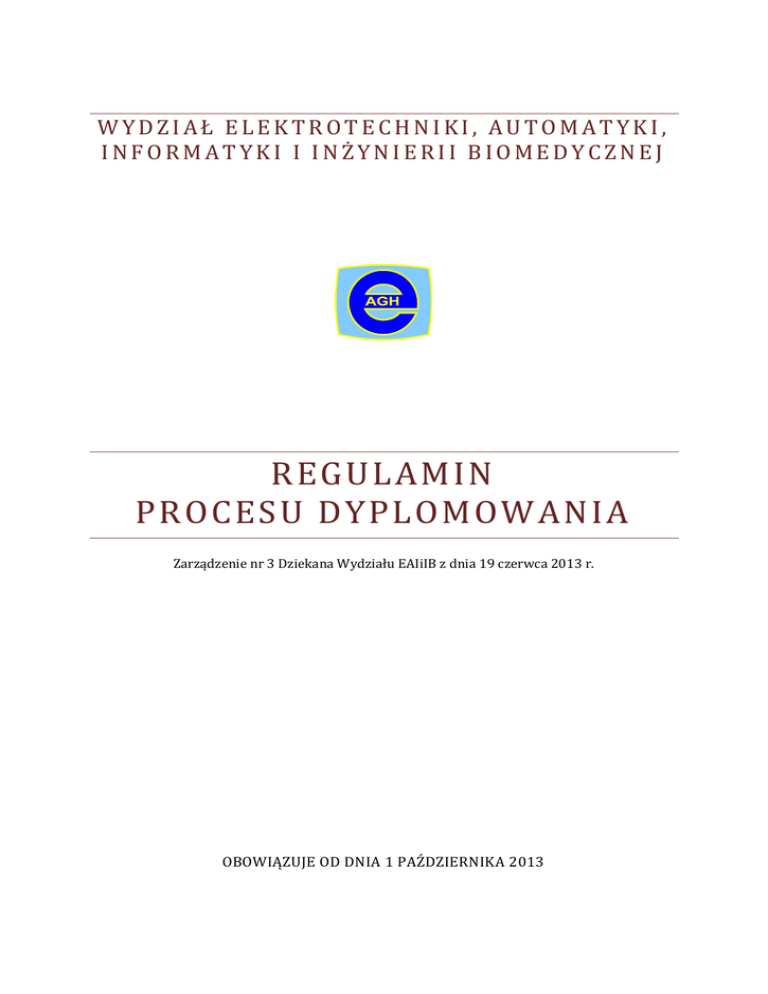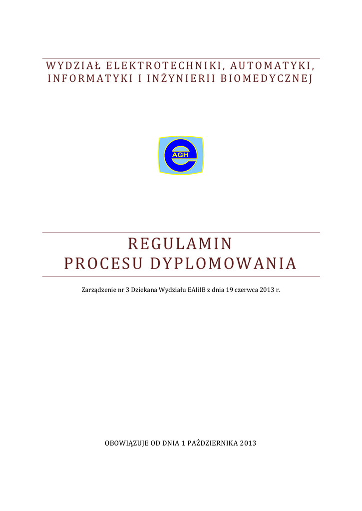 WYDZIAŁ ELEKTROTECHNIKI, AUTOMATYKI, INFORMATYKI I INŻYNIERII BIOMEDYCZNEJ REGULAMIN PROCESU DYPLOMOWANIA Zarządzenie nr 3 Dziekana Wydziału EAIiIB z dnia 19 czerwca 2013 r. OBOWIĄZUJE OD DNIA 1 PAŹDZIERNIKA 2013 SPIS TREŚCI: 1. WSTĘP 2. PODSTAWA PRAWNA 3. WYMOGI FORMALNE DLA PRAC DYPLOMOWYCH 4. ZATWIERDZANIE TEMATÓW PRAC DYPLOMOWYCH 5. WYBÓR TEMATU PRACY DYPLOMOWEJ 6. ZMIANA TEMATU / OPIEKUNA PRACY DYPLOMOWEJ 7. OCENA PRACY DYPLOMOWEJ 8. FORMY EGZAMINU DYPLOMOWEGO 9. REAKTYWACJA NA STUDIA W CELU ZŁOŻENIA PRACY DYPLOMOWEJ 10. PROCES SKŁADANIA PRAC DYPLOMOWYCH 11. CHARAKTER I FORMA PRACY DYPLOMOWEJ 12. ZAŁOŻENIA EDYTORSKIE I OBJĘTOŚĆ PRACY 13. ZAŁĄCZNIKI 2 I. WSTĘP 1. Regulamin Prac Dyplomowych realizowanych na Wydziale Elektrotechniki, Automatyki, Informatyki i Inżynierii Biomedycznej, zwany dalej Regulaminem, jest dokumentem scalającym poszczególne zapisy i postanowienia dotyczące procesu dyplomowania wskazane w podstawie prawnej. Regulamin określa także wymogi formalne oraz kwestie edycyjne dotyczące prac dyplomowych. 2. Ilekroć w niniejszym Regulaminie jest mowa o Dziekanie – w praktyce sprawy z tym związane proceduje Prodziekan odpowiedzialny za kształcenie na danym kierunku studiów. 3. Obsługa procesu dyplomowania w obszarze zgłaszania, opiniowania, zatwierdzania i wydawania tematów prac dyplomowych jest realizowana poprzez elektroniczny Wydziałowy System Prac Dyplomowych – WSPD (dostępny na stronie internetowej: http://pracedyplomowe.eaiib.agh.edu.pl). Dostęp do WSPD mają wszyscy pracownicy Wydziału EAIiIB uprawnieni do prowadzenia prac dyplomowych. Logowanie się do WSPD jest możliwe za pomocą tego samego loginu i hasła jaki daje dostęp do serwera pocztowego AGH. Dane pracowników (stopień/tytuł naukowy, imię i nazwisko, katedra) są pobierane ze Systemu Informacyjnego AGH (SkOs). Pracownicy innych wydziałów mogą uzyskać dostęp do systemu kontaktując się e-mailem ([email protected]) z administratorem systemu. II. PODSTAWA PRAWNA 1. Sprawy związane z procesem dyplomowania oraz realizacją prac dyplomowych regulują następujące akty prawne: a) Uchwała nr 57/2013 Senatu AGH z dnia 24 kwietnia 2013 r. w sprawie zmiany Regulaminu Studiów AGH uchwalonego przez Senat AGH uchwałą Nr 72/2012 z dnia 25 kwietnia 2012 r., b) Uchwała nr 82/2013 w sprawie zmiany uchwały nr 67/2010 Senatu AGH z dnia 26 maja 2010 r. w sprawie ustalenia pensum dla nauczycieli akademickich zatrudnionych w Akademii Górniczo-Hutniczej na poszczególnych stanowiskach oraz warunków jego obniżania i zasad obliczania godzin dydaktycznych, zmienionej uchwałą Nr 93/2012 z dnia 30 maja 2012 r., c) Uchwała nr 91/2009 Rady Wydziału EAIiE z dnia 17.12.2009 w sprawie powołania kierunkowych Komisji Dyplomowania studentów po I stopniu studiów stacjonarnych. d) Uchwała nr 25/rw/2012 Rady Wydziału EAIiIB z dnia 25 października 2012 r. w sprawie powołania Komisji Dyplomowania Studentów na studiach pierwszego stopnia na kadencję 2012-2016, e) Uchwała nr 26/rw/2012 Rady Wydziału EAIiIB z dnia 25 października 2012 r. w sprawie opiekunów prac dyplomowych będących doktorami lub specjalistami spoza uczelni, f) Uchwała nr 28/rw/2012 Rady Wydziału EAIiIB z dnia 25 października 2012 r. w sprawie zatwierdzania tematów prac dyplomowych, g) Uchwała nr 35/rw/2012 Rady Wydziału EAIiIB z dnia 29 listopada 2012 r. w sprawie zasad powoływania recenzentów prac dyplomowych, h) Uchwała nr 37/rw/2012 Rady Wydziału EAIiIB z dnia 13 grudnia 2012 r. w sprawie: formy egzaminu dyplomowego i wag ocen składowych przy ustalaniu wyniku ukończenia studiów. i) Uchwała nr 38/rw/2013 Rady Wydziału EAIiIB z dnia 26 września 2013 r. w sprawie zasad rozliczania godzin zajęć dydaktycznych zrealizowanych w roku akademickim 2013/2014. 3 III. WYMOGI FORMALNE DLA PRAC DYPLOMOWYCH 1. Wymaganie formalne dotyczące prac dyplomowych (odpowiednio inżynierskich i magisterskich) określa §24 Regulaminu Studiów AGH obowiązujący od 1 października 2013 r.. Zgodnie z Regulaminem Studiów AGH oraz Uchwałami Rady Wydziału EAIiIB wymienionymi w pkt. II niniejszego Regulaminu: Praca dyplomowa jest opracowaniem określonego tematu w formie pisemnej. Tematy prac dyplomowych (dostępne na stronie internetowej wydziału) muszą być podjęte przez studentów: o studiów I stopnia na jeden semestr przed planowanym terminem ukończeniem studiów, o studiów II stopnia na jeden rok przed planowanym ukończeniem studiów, Praca musi być wykonana osobiście i samodzielnie przez studenta pod kierunkiem uprawnionego do tego nauczyciela akademickiego (opiekuna pracy), Opiekunem pracy dyplomowej na Wydziale EAIiIB może być profesor, doktor habilitowany lub doktor. Praca podlega ocenie dokonanej niezależnie przez opiekuna pracy oraz recenzenta. Praca dyplomowa może być napisana w jednym z języków kongresowych, za zgodą opiekuna pracy w uzgodnieniu z Prodziekanem Wydziału, właściwym dla danego kierunku studiów. 2. Nie dopuszcza się realizacji prac zespołowych. W przypadku wspólnych badań lub projektu naukowego będących elementem pracy dyplomowej każdy z dyplomantów składa indywidualną pracę dyplomową. 3. Tematy prac dyplomowych wieloosobowych zatwierdzone przed 1 października 2013 r. są realizowane na dotychczasowych zasadach. Ocena pracy musi wskazywać indywidualny wkład w pracę każdego z dyplomantów. IV. ZATWIERDZANIE TEMATÓW PRAC DYPLOMOWYCH 1. Zgodnie z Uchwałą nr 28/rw/2012 Rady Wydziału EAIiIB z dnia 25 października 2012 r. tematy prac inżynierskich (w tym również projektów inżynierskich) zgłoszonych przez opiekunów, opiniują i zatwierdzają Komisje Dyplomowania właściwe dla danego kierunku studiów, informując pisemnie Dziekana o zatwierdzonych tematach prac, tematy prac magisterskich zatwierdza Dziekan po zaopiniowaniu ich przez Wydziałowy Zespół ds. Jakości Kształcenia, 2. Tematy prac dyplomowych są ważne przez okres 2 lat od m