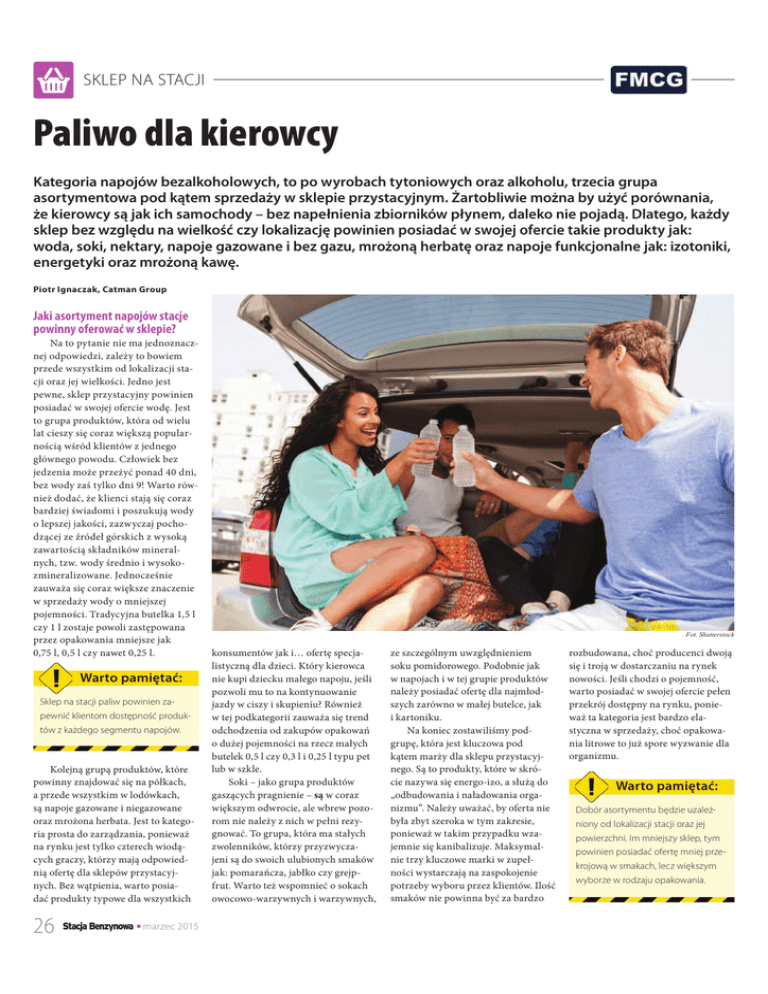 SKLEP NA STACJI Paliwo dla kierowcy Kategoria napojów bezalkoholowych, to po wyrobach tytoniowych oraz alkoholu, trzecia grupa asortymentowa pod kątem sprzedaży w sklepie przystacyjnym. Żartobliwie można by użyć porównania, że kierowcy są jak ich samochody – bez napełnienia zbiorników płynem, daleko nie pojadą. Dlatego, każdy sklep bez względu na wielkość czy lokalizację powinien posiadać w swojej ofercie takie produkty jak: woda, soki, nektary, napoje gazowane i bez gazu, mrożoną herbatę oraz napoje funkcjonalne jak: izotoniki, energetyki oraz mrożoną kawę. Piotr Ignaczak, Catman Group Jaki asortyment napojów stacje powinny oferować w sklepie? Na to pytanie nie ma jednoznacznej odpowiedzi, zależy to bowiem przede wszystkim od lokalizacji stacji oraz jej wielkości. Jedno jest pewne, sklep przystacyjny powinien posiadać w swojej ofercie wodę. Jest to grupa produktów, która od wielu lat cieszy się coraz większą popularnością wśród klientów z jednego głównego powodu. Człowiek bez jedzenia może przeżyć ponad 40 dni, bez wody zaś tylko dni 9! Warto również dodać, że klienci stają się coraz bardziej świadomi i poszukują wody o lepszej jakości, zazwyczaj pochodzącej ze źródeł górskich z wysoką zawartością składników mineralnych, tzw. wody średnio i wysokozmineralizowane. Jednocześnie zauważa się coraz większe znaczenie w sprzedaży wody o mniejszej pojemności. Tradycyjna butelka 1,5 l czy 1 l zostaje powoli zastępowana przez opakowania mniejsze jak 0,75 l, 0,5 l czy nawet 0,25 l. Warto pamiętać: Sklep na stacji paliw powinien zapewnić klientom dostępność produktów z każdego segmentu napojów. Kolejną grupą produktów, które powinny znajdować się na półkach, a przede wszystkim w lodówkach, są napoje gazowane i niegazowane oraz mrożona herbata. Jest to kategoria prosta do zarządzania, ponieważ na rynku jest tylko czterech wiodących graczy, którzy mają odpowiednią ofertę dla sklepów przystacyjnych. Bez wątpienia, warto posiadać produkty typowe dla wszystkich 26 Stacja Benzynowa marzec 2015 Fot. Shutterstock konsumentów jak i… ofertę specjalistyczną dla dzieci. Który kierowca nie kupi dziecku małego napoju, jeśli pozwoli mu to na kontynuowanie jazdy w ciszy i skupieniu? Również w tej podkategorii zauważa się trend odchodzenia od zakupów opakowań o dużej pojemności na rzecz małych butelek 0,5 l czy 0,3 l i 0,25 l typu pet lub w szkle. Soki – jako grupa produktów gaszących pragnienie – są w coraz większym odwrocie, ale wbrew pozorom nie należy z nich w pełni rezygnować. To grupa, która ma stałych zwolenników, którzy przyzwyczajeni są do swoich ulubionych smaków jak: pomarańcza, jabłko czy grejpfrut. Warto też wspomnieć o sokach owocowo-warzywnych i warzywnych, ze szczególnym uwzględnieniem soku pomidorowego. Podobnie jak w napojach i w tej grupie produktów należy posiadać ofertę dla najmłodszych zarówno w małej butelce, jak i kartoniku. Na koniec zostawiliśmy podgrupę, która jest kluczowa pod kątem marży dla sklepu przystacyjnego. Są to produkty, które w skrócie nazywa się energo-izo, a służą do „odbudowania i naładowania organizmu”. Należy uważać, by oferta nie była zbyt szeroka w tym zakresie, ponieważ w takim przypadku wzajemnie się kanibalizuje. Maksymalnie trzy kluczowe marki w zupełności wystarczają na zaspokojenie potrzeby wyboru przez klientów. Ilość smaków nie powinna być za bardzo rozbudowana, choć producenci dwoją się i troją w dostarczaniu na rynek nowości. Jeśli chodzi o pojemność, warto posiadać w swojej ofercie pełen przekrój dostępny na rynku, ponieważ ta kategoria jest bardzo elastyczna w sprzedaży, choć opakowania litrowe to już spore wyzwanie dla organizmu. Warto pamiętać: Dobór asortymentu będzie uzależniony od lokalizacji stacji oraz jej powierzchni. Im mniejszy sklep, tym powinien posiadać ofertę mniej przekrojową w smakach, lecz większym wyborze w rodzaju opakowania. SKLEP NA STACJI W jakiej lokalizacji powinny znaleźć się napoje bezalkoholowe? Jednym z kluczowych czynników lokalizacji tej kategorii jest fakt, czy sklep przystacyjny posiada alkohol. Jeśli tak jest, ekspozycja napojów powinna być w bezpośredniej bliskości lady kasowej, by klient kupujący alkohol, widział również napoje bezalkoholowe. Bliskość słonych przekąsek będzie dodatkowym atutem lokalizacyjnym, choć należy pamiętać, że to napoje są ważniejszą dla klienta kategorią. Ze względu na Warto pamiętać: Jedną z podstawowych ról kategorii napoje bezalkoholowe jest generowanie i sterowanie ruchem w sklepie przystacyjnym. Dlatego jej lokalizacja powinna być umiejscowiona możliwie jak najdalej od wejścia. wielkość (objętość) i wartość tej kategorii, odchodzi się od umiejscowienia jej na sali sprzedaży w regale typu gondola, na rzecz wysokich regałów przyściennych oraz oczywiście lodówek. W jaki sposób eksponować produkty z kategorii napoje bezalkoholowe? Ponieważ wiosna śmiało wkracza w progi przystacyjnego sklepu, warto już myśleć o rozbudowie ekspozycji napojów. Lodówkę i półkę, które wystarczały w sezonie zimowym, należy wzmocnić poprzez uruchomienie drugich pozycji sprzedaży w postaci półpalety, czy producenckiego standu. Na półkach w regałach przyściennych czy gondolach na sali należy przestrzegać kilku podstawowych zasad: Należy wyraźnie oddzielić od siebie poszczególne podkategorie produktów w podziale na soki, napoje, wodę i izo-energo. Żeby podejmować szybkie decyzje zakupowe, klienci potrzebują przejrzystej półki. Produkty w opakowaniach zróżnicowanych pod kątem materiału (karton, szkło, puszka oraz PET), powinny być eksponowane niezależnie od siebie. Nic tak nie zniechęca klientów do zakupów jak „bałagan logiczny” na półce. Należy pamiętać o tym, że produkty cięższe powinny być ustawione niżej,