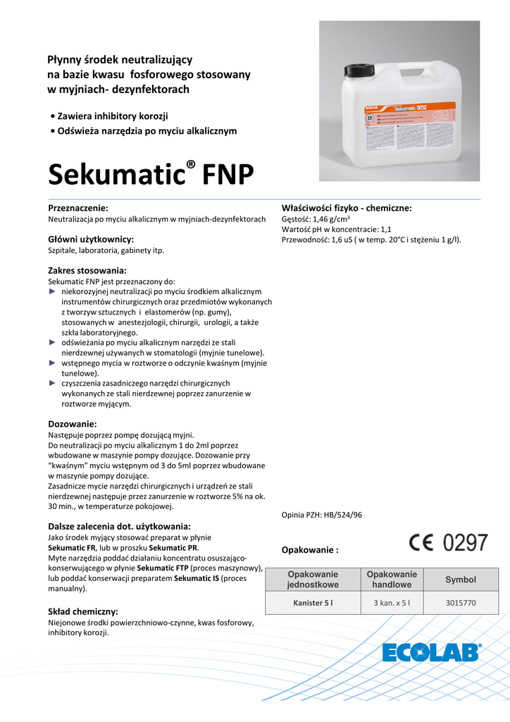 Płynny środek neutralizujący na bazie kwasu fosforowego stosowany w myjniach- dezynfektorach • Zawiera inhibitory korozji • Odświeża narzędzia po myciu alkalicznym Sekumatic® FNP Przeznaczenie: Właściwości fizyko - chemiczne: Neutralizacja po myciu alkalicznym w myjniach-dezynfektorach Gęstość: 1,46 g/cm3 Wartość pH w koncentracie: 1,1 Przewodność: 1,6 uS ( w temp. 20°C i stężeniu 1 g/l). Główni użytkownicy: Szpitale, laboratoria, gabinety itp. Zakres stosowania: Sekumatic FNP jest przeznaczony do: ► niekorozyjnej neutralizacji po myciu środkiem alkalicznym instrumentów chirurgicznych oraz przedmiotów wykonanych z tworzyw sztucznych i elastomerów (np. gumy), stosowanych w anestezjologii, chirurgii, urologii, a także szkła laboratoryjnego. ► odświeżania po myciu alkalicznym narzędzi ze stali nierdzewnej używanych w stomatologii (myjnie tunelowe). ► wstępnego mycia w roztworze o odczynie kwaśnym (myjnie tunelowe). ► czyszczenia zasadniczego narzędzi chirurgicznych wykonanych ze stali nierdzewnej poprzez zanurzenie w roztworze myjącym. Dozowanie: Następuje poprzez pompę dozującą myjni. Do neutralizacji po myciu alkalicznym 1 do 2ml poprzez wbudowane w maszynie pompy dozujące. Dozowanie przy “kwaśnym” myciu wstępnym od 3 do 5ml poprzez wbudowane w maszynie pompy dozujące. Zasadnicze mycie narzędzi chirurgicznych i urządzeń ze stali nierdzewnej następuje przez zanurzenie w roztworze 5% na ok. 30 min., w temperaturze pokojowej. Opinia PZH: HB/524/96 Dalsze zalecenia dot. użytkowania: Jako środek myjący stosować preparat w płynie Sekumatic FR, lub w proszku Sekumatic PR. Myte narzędzia poddać działaniu koncentratu osuszającokonserwującego w płynie Sekumatic FTP (proces maszynowy), lub poddać konserwacji preparatem Sekumatic IS (proces manualny). Skład chemiczny: Niejonowe środki powierzchniowo-czynne, kwas fosforowy, inhibitory korozji. Opakowanie : Opakowanie jednostkowe Opakowanie handlowe Symbol Kanister 5 l 3 kan. x 5 l 3015770