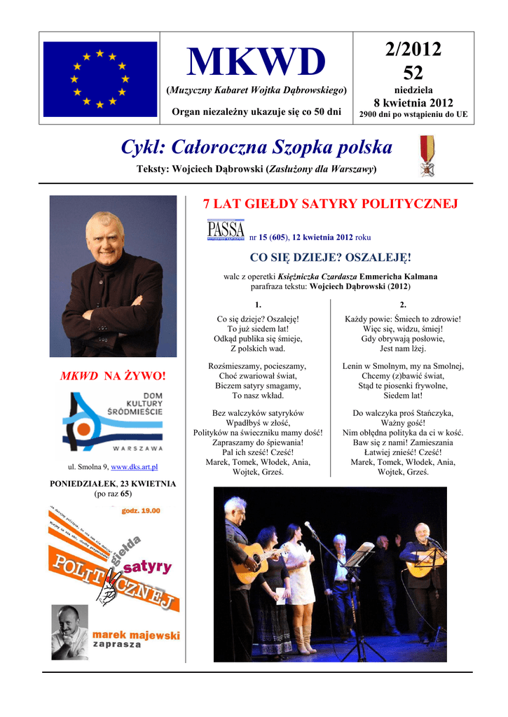 MKWD 2/2012 52 (Muzyczny Kabaret Wojtka Dąbrowskiego) niedziela Organ niezależny ukazuje się co 50 dni 2900 dni po wstąpieniu do UE 8 kwietnia 2012 Cykl: Całoroczna Szopka polska Teksty: Wojciech Dąbrowski (Zasłużony dla Warszawy) 7 LAT GIEŁDY SATYRY POLITYCZNEJ nr 15 (605), 12 kwietnia 2012 roku CO SIĘ DZIEJE? OSZALEJĘ! walc z operetki Księżniczka Czardasza Emmericha Kalmana parafraza tekstu: Wojciech Dąbrowski (2012) MKWD NA ŻYWO! ul. Smolna 9, www.dks.art.pl PONIEDZIAŁEK, 23 KWIETNIA (po raz 65) 1. 2. Co się dzieje? Oszaleję! To już siedem lat! Odkąd publika się śmieje, Z polskich wad. Każdy powie: Śmiech to zdrowie! Więc się, widzu, śmiej! Gdy obrywają posłowie, Jest nam lżej. Rozśmieszamy, pocieszamy, Choć zwariował świat, Biczem satyry smagamy, To nasz wkład. Lenin w Smolnym, my na Smolnej, Chcemy (z)bawić świat, Stąd te piosenki frywolne, Siedem lat! Bez walczyków satyryków Wpadłbyś w złość, Polityków na świeczniku mamy dość! Zapraszamy do śpiewania! Pal ich sześć! Cześć! Marek, Tomek, Włodek, Ania, Wojtek, Grześ. Do walczyka proś Stańczyka, Ważny gość! Nim obłędna polityka da ci w kość. Baw się z nami! Zamieszania Łatwiej znieść! Cześć! Marek, Tomek, Włodek, Ania, Wojtek, Grześ. str. 2 MKWD, nr 2 (52) /2012, Warszawa, niedziela, 8 kwietnia 2012 roku (2900 dni po wstąpieniu do UE) MKWD GOŚCINNIE W PIWNICY POD BARANAMI nr 14 (604), 5 kwietnia 2012 roku MIETKOWI ŚWIĘCICKIEMU Z OKAZJI URODZIN na melodię Błękitnej Chusteczki Jerzego Petersburskiego Kiedyś w Weimarze żył Goethe, Więc zapytano poetę: - Był Pan w Krakowie? - Byłem – odpowie. Tam mieszka… Święcicki Mietek! Pytacie mnie: Co jest grane? Że każdy Mietka jest fanem. Każdą kobietę Święcicki Mietek Zniewala Jęczmiennym Łanem. Chodziłem tam do Piwnicki, Gdzie śpiewał Mietek Święcicki. Dobrze pamiętam: Wszystkie dziewczęta, Uwodził, łapiąc za cycki. Mietkowi, przyznacie sami, Do twarzy jest z kobitkami, Zwłaszcza w tym roku Na Five o’clocku W Piwnicy pod Baranami. 8 marca ukazał się nr 600 tygodnika PASSA nr 11 (601), 15 marca 2012 roku SZEJSET czyli DWA RAZY CZYSTA! Jakby tu uczcić wasz jubileusz? Ubrałem smoking, modny kapelusz, Myślałem: przyjdę, zrobię owację, Przygotowałem sobie orację. Powiem wytwornie, nic nie zrozumio, Więc się przyłanczam, do tych co szumio, Co tak wołajo i głośno krzyczo, I po nowemu dobrze wam życzo. Bardzo starannie dobrałem słowa. Dostojna mowa była gotowa. Chciałem tekst wysłać, siadam do kompa, Taka okazja! Niech będzie pompa! Tak czymać, Miszczu! Już po czynastej. Czeba się napić! Nie czeba ciastek. Choć językowe straszo potworki, Niech od szampana szczelajo korki! Siedzę na fejsie, pacze i pacze, Że dziś się mówi całkiem inaczej. Kto by dziś słuchał starego zrzędy? Czeba nadążać, czeba być trendy. Na zdrowie! Życzeń jest długa lista! Szejset numerów! Dwa razy czysta! Za dobrą passę! Tak świętowałem! Jeszcze raz czysta! Aśnaebaem! str. 3 MKWD, nr 2 (52) /2012, Warszawa, niedziela, 8 kwietnia 2012 roku (2900 dni po wstąpieniu do UE) nr 9 (599), 1 marca 2012 WE MNIE JEST SPORTU NADZIEJA na melodię Niebieskiej chusteczki muzyka: Jerzy Petersburski Był cyrk z obsadą resortów, Przygnało muchę do tortu! Rzekł Tusk: Masz szorty? Wiesz co to korty? Bierz fuchę Ministra Sportu. W konkursie na zacny suchar Wygrała Ministra Mucha, Ginąc w domysłach, Dlaczego Wisła Gra z Legią o Superpuchar? Tak się zaczęła kariera, Dobrej znajomej fryzjera. By Narodowy Stadion mieć z głowy, Zrobiła zeń menadżera. Po meczu Ministra Mucha, Spytała: Kto mnie… wysłucha? Po pierwszym słowie, Każdy sportowiec Śmiał się od ucha do ucha. A Mucha: Ja wam pokażę! Chociaż wszystkiego nie jarzę. Czemu kolega Z wami nie biega? Leni się? - Nie! Jest bramkarzem. Na sporcie nie znam się wcale, Lecz się ze wstydu nie spalę. Tusk wierzy w cuda, Że mnie się uda I Polska zagra w finale. We mnie jest sportu nadzieja! Kto sport uzdrowi jak nie ja? Trudne zadania Do wykonania! W tym… trzecia liga hokeja. Jestem nadzieją milionów! Wszystkich ustawię do pionu! Mucha nie siada! Jak się nie nadam, Pobiegam wokół stadionu. nr 13 (603), 29 marca 2012 roku PARANOIK, PARANOIK na melodię piosenki Parasolki, Parasolki z repertuaru Marii Koterbskiej muzyka: Piotr Hertel, parafraza tekstu Janusza Słowikowskiego z Kabaretu Pstrąg (1956) 1. W pewnym kraju, gdzie zawisło jakieś fatum, I rządzący dają światu do wiwatu, Ten pojawił się wśród innych postulatów, Żeby rząd utworzyć z samych psychopatów. Ustalono kto powinien rządzić krajem, Opozycja wysunęła kandydata, Bo najbardziej do rządzenia się nadaje Pełen fobii i kompleksów psychopata. Paranoik, paranoik, trudnych wyzwań się nie boi, Paranoik, paranoik, dawno sobie to uroił, Paranoik, paranoik, wszystkim mózgu zrobi pranie, Paranoik, paranoik… Wybrać go, panowie, panie? 2. On załatwi w mgnieniu oka wszystkie sprawy, Emerytów i karmiących dzieci matek, On wprowadzi nowoczesność do Warszawy, I zapewni nam dostatek, wielki strateg. On jedyny może sprostać tym zadaniom, Żądny władzy, aż przebiera wciąż nóżkami, Choć cytując między nami jedną panią, Co najwyżej wszystkich skłóci z sąsiadami. Paranoik, paranoik, ciągle dwoi się i troi, Paranoik, paranoik, on każdego zaspokoi, Paranoik, paranoik, zawsze znajdzie rozwiązanie, Paranoik, paranoik… Wybrać go, panowie, panie? 3. Choć ostatnio głos zabiera coraz rzadziej, Wokół siebie przydupasów ma bez liku, Może z nimi w doborowym rządzić składzie, Bo ów skład to wyjątkowe panoptikum. Nawiedzony rzecznik, kawał oszołoma, Spec od spisków i katastrof i tak dalej… I jak stwierdza pewna bliska mi znajoma, Jeszcze kilku ma kolegów na oddziale. Paranoik, paranoik, dookoła sami swoi, Paranoik, paranoik, jego stan mnie niepokoi. Paranoik, paranoik, jak nabroi, co się stanie? Paran