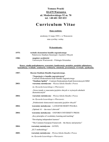 Tomasz Pracki 02-679 Warszawa ul. Modzelewskiego 52 m. 70 tel. +48 601 303 033 Curriculum Vitae Dane osobiste: urodzony:12 maja 1955 r. w Warszawie stan cywilny: wolny Wykształcenie: 1975: technik ekonomista handlu zagranicznego Państwowe Studium Stenotypii i Języków Obcych 1980: magister arabistyki Uniwersytet Warszawski - Filologia Orientalna Kursy, studia podyplomowe, warsztaty, konferencje, projekty, projekty pilotażowe, konsultacje, wykłady, seminaria, webinaria, szkolenia, prezentacje, wywiady, spotkania: 1987: 2003: Roczne Studium Handlu Zagranicznego, “Negocjacje w handlu zagranicznym” Centrum Doskonalenia Kadr Handlu Zagranicznego “Studium Spółek” - Centrum Doskonalenia Kadr Kierowniczych MHZ warsztaty metodyczne – Wyższa Szkoła Handlu i Prawa im. Ryszarda Łazarskiego w Warszawie: „Nowe trendy w nauczaniu języków obcych w wyższych szkołach ekonomicznych” 2004: warsztaty metodyczne – Wyższa Szkoła Handlu i Prawa im. Ryszarda Łazarskiego w Warszawie: „Podniesienie skuteczności nauczania języków obcych” 2004: warsztaty metodyczne – LANGENSCHEIDT POLSKA „Optimal A1 – das neue Lehrwerk” 2004: warsztaty metodyczne – OXFORD UNIVERSITY PRESS „Key principles of vocabulary learning and teaching“ “Developing independent learners” “The Common European Framework – the theory and practice” 2004: warsztaty metodyczne – IATEFL „ELT methodology” 2005: warsztaty metodyczne – Wyższa Szkoła Handlu i Prawa im. Ryszarda Łazarskiego w Warszawie: „Poprawa jakości i efektywności nauczania języków obcych wobec zmieniających się metod i treści nauczania” 2005: warsztaty metodyczne – MACMILLAN POLSKA konferencja metodyczna Marta Rosińska, Barbara Ściborowska, Ray Norris 2005: konsultacje metodyczne – MACMILLAN POLSKA prezentacja nowoczesnych materiałów dydaktycznych 2005: warsztat metodyczny – PEARSON EDUCATION POLSKA SP. z o.o. / LONGMANN Tonya Trappe, Graham Tullis Intelligent Business English Teacher 2006: seminarium naukowe – Wyższa Szkoła Handlu i Prawa im. Ryszarda Łazarskiego w Warszawie: „Wybrane problemy andragogiki w świetle CEFR” 2006: konferencja metodyczna – MACMILLAN POLSKA Philip Prowse, Grzegorz Śpiewak „Learning in style!” “Teaching because or despite the New Matura?” 2006: warsztat metodyczny – PEARSON LONGMAN ENGLISH LANGUAGE TEACHING Tonya Trappe “Intelligent Business English Teachers Teach Career Skills” 2006: konferencja – ETS EUROPE ODDZIAŁ ETS GLOBAL BV W POLSCE ETS & EGIS TOEIC® and TOEFL® conference 2006: wykład – EGIS / BRITISH COUNCIL Grzegorz Szpila “Od słownika do mówienia. Ćwiczenia leksykalne w ujęciu komunikacyjnym” 2007: warsztaty metodyczne – Wyższa Szkoła Handlu i Prawa im. Ryszarda Łazarskiego w Warszawie: „Wprowadzenie do zagadnień z emisji głosu” 2007: konferencja – BRITISH COUNCIL / UNIVERSITY OF CAMBRIDGE INTERNATIONAL CERTIFICATE IN FINANCIAL ENGLISH (ICFE) 2007: warsztaty metodyczne – LANGENSCHEIDT POLSKA „Die neue Mittelstufenprüfung” 2007: seminarium metodyczne – BRITISH COUNCIL / ELT THE TEACHER / TRINITY COLLEGE LONDON / TELC LANGUAGE TESTS / WSHiP „New issues, New topics and Where to Find Them” 12th DOS-TTS teacher development conference 2008: konferencja metodyczna – PEARSON LONGMAN TEACHER TRAINING „Motivating Adult Learners” 2008: kurs mikrofonowy POLSKIE RADIO oraz AKADEMIA PEDAGOGIKI SPECJALNEJ 2008: konferencja - ESEE 2008 „Przyszłosć szkół językowych w kontekście zmian zachodzących na rynku usług szkoleniowych” 2008: szkolenie - Wyższa Szkoła Handlu i Prawa im. Ryszarda Łazarskiego w Warszawie: „Excel podstawowy” 2009: warsztaty metodyczne – LANGENSCHEIDT POLSKA „Prezentacja oferty wydawniczej Marshall Cavendish” 2009: konferencja - OXFORD UNIVERSITY PRESS „Teaching – testing – tracking progress” 2009: intensywne warsztaty dla nauczycieli w ramach projektu DOS Teacher Training Solutions - część I Wyższa Szkoła Handlu i Prawa im. Ryszarda Łazarskiego w Warszawie: „Uczę po ludzku” 2009: seminarium z cyklu - „Moja firma” przeprowadzone przeze mnie dla uczniów Gimnazjum nr 142 z Oddziałami Dwujęzycznymi im. Roberta Schumana w Warszawie 2009: intensywne warsztaty dla nauczycieli w ramach projektu DOS Teacher Training Solutions - część II Wyższa Szkoła Handlu i Prawa im. Ryszarda Łazarskiego w Warszawie: „MASTERS IN ACTION: Skills work!” with Paul Seligson 2009-2010: kurs na pilota wycieczek zagranicznych B.T. ORION w Warszawie URZĄD MARSZAŁKOWSKI WOJEWÓDZTWA MAZOWIECKIEGO 2010: seminarium – BRITISH COUNCIL „International Certificate in Financial English” (ICFE) 2010: konferencja metodyczna - DOS Teacher Training Solutions Luke Prodromou „MASTERS IN ACTION: Mixed ability works!” Uczelnia Łazarskiego w Warszawie 2010: konferencja metodyczna - DOS Teacher Training Solutions Scott Thornbury „MASTERS IN ACTION: From grammar to words and back again a fresh look on teaching grammar and lexis” Uczelnia Łazarskiego w Warszawie 2011: prezentacja - OXFORD UNIVERSITY PRESS Iwona Krzemińska „E-learning and Oxford English On-line” 2011: konferencja metodyczna - DOS Teacher Training Solutions Russell Stannard „CONNECTED CLASSROOM” Uczelnia Łazarskiego w Warszawie 2011: prezentacja - MACMILLAN POLSKA Aneta Pawłowska nowości wydawnicze Uczelnia Łazarskiego w Warszawie 2011: konferencja – INSTITUTE FOR THE STUDY OF THE MIDDLE EAST, GULF & AFRICA „Poland – Saudi Arabia: New Opening” Uczelnia Łazarskiego w Warszawie 2011: konferencja metodyczna - DOS Teacher Training Solutions Paul Seligson „Fluency and Accuracy at Play” Uczelnia Łazarskiego w Warszawie 2011: prezentacja - OXFORD UNIVERSITY PRESS Iwona Krzemińska „Zawartość i zalety Oxford Advanced Learner’s Dictionary w wersji online” 2012: szkolenie - OXFORD UNIVERSITY PRESS Adrian Chróścicki „Market Leader e-learning platform“ 2012: pr