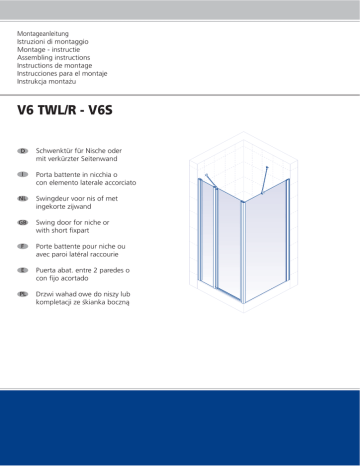 Montageanleitung Istruzioni di montaggio Montage - instructie Assembling instructions Instructions de montage Instrucciones para el montaje Instrukcja monta˝u V6 TWL/R - V6S D Schwenktür für Nische oder mit verkürzter Seitenwand I Porta battente in nicchia o con elemento laterale accorciato NL Swingdeur voor nis of met ingekorte zijwand GB Swing door for niche or with short fixpart F Porte battente pour niche ou avec paroi latéral raccourie E Puerta abat. entre 2 paredes o con fijo acortado PL Drzwi wahad owe do niszy lub kompletacji ze Êkianka bocznà 1 2 2 3,9 x 38 6 mm 1 12 mm 3 4 2 aussen buitenkant outside extérieur esterno m m 3 oben boven up haut alto 2 1 5 15 mm 6 40 mm 3,5 x 9,5 3 mm 40 mm 7 40 mm 40 mm 3,5 x 9,5 3 mm 3,5 x 9,5 1 3 mm 1 40 mm 40 mm 2 8 3,9 x 38 6 3 4 3 mm 2 6 mm 5 1 9 10 1 11 1 2 12 3 1 A B B A 13 1 2 14 1 2 3 4 4 4 15 16 24 h 17 IDEAL 12 mm IDEAL 10 mm 18 2 2 3,9 x 38 3,9 x 38 6 mm 1 6 mm 1 19 20 3,5 x 13 1 2 IDEAL 12 mm 3 21 aussen buitenkant outside extérieur esterno oben boven up haut alto 4 2 40 mm 1 3,5 x 9,5 3 40 mm 2 3 mm 22 0 50 m m m m 23 3 1 6 mm 4 3,9 x 38 5 2 3,5 x 13 24 3 1 4 5 15 mm 2 25 40 mm 3,5 x 9,5 3 mm 40 mm 26 40 mm 3,5 x 9,5 40 mm 3 mm 1 2 40 mm 3 mm 3 3,5 x 9,5 27 3 4 6 mm 5 3 mm 2 3,9 x 38 6 28 1 29 1 2 2 30 1 2 31 3 1 A B 2 B A 32 1 2 33 1 2 3 4 4 4 34 35 24 h PRH24794 PRHE351 PRHE353 PL MD39 A10-C10 SRAKFS3595 SRAKV3513 SRAKFB3938 KLE001 BGRE388 PRBE408 PLE349 PLE348 PLE372 PLF044 KLEE407 BGRE393 SRAM410KZ SRAKV3513 SRAKV3938 SRAM413KFS KLE001 KLE 007 PLF 121 PLF 122 KLEL016 1 2 3 4 5 6 7 8 9 10 10.1 10.2 10.3 10.4 10.5 10.6 10.7 10.8 10.9 10.10 10.11 10.12 11 12 12.1 13 Pos. Art. V6 S 13 12 Montageset 12.1 11 10.12 10.4 10 10.2 10.6 10.5 10.8 9 9 1 4 8 8 4 4 10.1 8 6 6 6 2 10.6 10.2 10.8 10.7 5 10.4 10.11 10.5 10.5 10.9 10.3 7 7 7 3 Farbe / colore / kleur / colour / couleur / color / kolor: Glas / vetro / glaspaneel / Glas-type / verre / vidrio / element szklany: Breite / larghezza / breedte / width / largeur / anchura / szerokoÊç: Höhe / altezza / hoogte / hight / hauteur / altura / WysokoÊç: Bei Ersatzteillieferungen sind folgende Angaben erforderlich: • Per ordini di pezzi di ricambio sono necessari i seguenti dati: • Bij onderdeelbestellingen zijn de volgende gegevens gewenst: Spare parts need the following specification: • Pour toute commande de pièces détachées,il est nècessaire de fournir • Para pedir los repuestos, necesitamos de los siguientes datos: W przypadku dostaw cz´Êci zamiennych wymagane sà nast´pujàce dane: 10.3 10.10 10.5 10.11 9 VERMONV6TWL/R-V6S 23.11.2007 PRH E339 PRH E343 PRH E344 PRH E340 PRH E340 PRH E341 PRH E342 PRB E356 PLE 402 PLE 326 PLE 327 PLE 328 PLE 338 PLE 332 PL MD39 PLE 405 GUM E371 GUM F074 GUM G025 A10-C10 KLE E040 KLE 018 SRAKF3516 SRAM410KF SRAKFS3595 SRAKFB3938 KLE 001 BGRE387 PRB E408 PLE 349 PLE 348 PLE 372 PLF 044 KLE E407 SRAM410KZ SRAKV3513 SRAKV3938 SRAM413KFS KLE 001 PLF 159 PLF 121 PLF 122 KLE 007 KLEL016 VERMONTWR/L 1 2 3 4 4.1 5 6 7 8 9 10 11 12 13 14 15 16 17 18 19 20 21 22 23 24 25 26 27 27.1 27.2 27.3 27.4 27.5 27.6 27.7 27.8 27.9 27.10 27.11 28 29 29.1 30 31 32 Pos. Art. V6 TWL 29 31 Mo n t a g e a n le i 32 28 Montageset 29.1 30 27.11 26 26 1 26 27.5 24 2 24 14 25 25 14 25 14 24 27.6 27.1 19 3 24 8 23 22 21 14 24 14 4 20 15 27.10 15 27.3 27.8 24 27.2 2214 23 27.6 20 21 8 27.7 16 9 13 11 5 11 19 7 17 6 12 24 14 24 14 24 14 25 25 4.1 25 26 26 1 26 Farbe / colore / kleur / colour / couleur / color / kolor: Glas / vetro / glaspaneel / Glas-type / verre / vidrio / element szklany: Breite / larghezza / breedte / width / largeur / anchura / szerokoÊç: Höhe / altezza / hoogte / hight / hauteur / altura / WysokoÊç: Bei Ersatzteillieferungen sind folgende Angaben erforderlich: • Per ordini di pezzi di ricambio sono necessari i seguenti dati: • Bij onderdeelbestellingen zijn de volgende gegevens gewenst: Spare parts need the following specification: • Pour toute commande de pièces détachées,il est nècessaire de fournir • Para pedir los repuestos, necesitamos de los siguientes datos: W przypadku dostaw cz´Êci zamiennych wymagane sà nast´pujàce dane: 27.4 27.2 27.10 27.9 27.5 27.7 27.3 27 27.5 27.5 10 12 18 VERMONV6TWL/R-V6S 23.11.2007 PRH E339 PRH E343 PRH E344 PRH E340 PRH E340 PRH E341 PRH E342 PRB E356 PLE 402 PLE 326 PLE 327 PLE 328 PLE 338 PLE 332 PL MD39 PLE 405 GUM E371 GUM F074 GUM G025 A10-C10 KLE E040 KLE 018 SRAKF3516 SRAM410KF SRAKFS3595 SRAKFB3938 KLE 001 BGRE387 PRB E408 PLE 349 PLE 348 PLE 372 PLF 044 KLE E407 SRAM410KZ SRAKV3513 SRAKV3938 SRAM413KFS KLE 001 PLF 159 PLF 121 PLF 122 KLE 007 KLEL016 VERMONTWR/L 1 2 3 4 4.1 5 6 7 8 9 10 11 12 13 14 15 16 17 18 19 20 21 22 23 24 25 26 27 27.1 27.2 27.3 27.4 .27.5 27.6 27.7 27.8 27.9 27.10 27.11 28 29 29.1 30 31 32 Pos. Art. V6 TWR 31 29 Mo n t a g e a n le i 32 28 Montageset 29.1 30 25 25 4.1 25 24 14 24 14 24 12 18 6 12 7 17 19 13 10 11 5 11 9 16 20 15 27.7 14 4 8 23 8 21 22 24 14 24 21 3 24 27.8 14 27.2 23 22 27.6 27.10 27.3 20 15 27.5 27.5 19 27.1 27 25 14 24 25 14 24 2 25 14 24 26 26 1 26 27.5 27.6 27.2 27.10 27.4 27.5 27.9 27.7 27.3 27.11 Farbe / colore / kleur / colour / couleur / color / kolor: Glas / vetro / glaspaneel / Glas-type / verre / vidrio / element szklany: Breite / larghezza / breedte / width / largeur / anchura / szerokoÊç: Höhe / altezza / hoogte / hight / hauteur / altura / wysokoÊç: Bei Ersatzteillieferungen sind folgende Angaben erforderlich: • Per ordini di pezzi di ricambio sono necessari i seguenti dati: • Bij onderdeelbestellingen zijn de volgende gegevens gewenst: Spare parts need the following specification: • Pour toute commande de pièces détachées,il est nècessaire de fournir • Para pedir los repuestos, necesitamos de los siguientes datos: W przypadku dostaw cz´Êci zamiennych wymagane sà nast´pujàce dane: 26 26 1 26 14 VERMONV6TWL/R-V6S 23.10.2007 de ducha. Para esto llenar el canal inferior con silicón y ponerlo sobre el pla