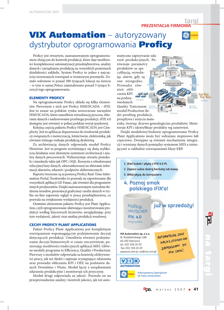 AUTOMATICON 2007 targi PREZENTACJA FIRMOWA VIX Automation – autoryzowany dystrybutor oprogramowania Proficy Proficy jest otwartym, zaawansowanym oprogramowaniem służącym do kontroli produkcji, które daje możliwości kompleksowej automatyzacji przedsiębiorstwa, analizy danych i zarządzania produkcją na wszystkich poziomach działalności zakładu. System Proficy to jedno z najczęściej stosowanych rozwiązań w światowym przemyśle. Zostało wdrożone w ponad 300 tysiącach lokacji na świecie – w tym w samej Polsce zainstalowano ponad 3 tysiące licencji tego oprogramowania. ELEMENTY PROFICY Na oprogramowanie Proficy składa się kilka elementów. Pierwszym z nich jest Proficy HMI/SCADA – iFIX. Jest to znane na polskim rynku nowoczesne narzędzie HMI/SCADA, które umożliwia wizualizację procesu, zbieranie danych i nadzorowanie przebiegu produkcji. iFIX 4.0 dostępny jest również w pełnej polskiej wersji językowej. Kolejną częścią pakietu Proficy HMI/SCADA jest Cimplicity. Jest to aplikacja dopasowana do środowisk produkcji związanych z motoryzacją, lotnictwem, elektroniką, jak również różnego rodzaju produkcją dyskretną. Za archiwizację danych odpowiada moduł Proficy Historian. Jest to program wyróżniający się dużą szybkością działania oraz złożonym systemem archiwizacji i analizy danych procesowych. Wykorzystuje otwarte protokoły i standardy takie jak OPC i SQL. Korzysta z wbudowanej relacyjnej bazy danych, ukierunkowanej na zbieranie informacji alarmów, zdarzeń i podpisów elektronicznych. Raporty tworzone są za pomocą Proficy Real-Time Information Portal. Środowisko to pozwala na raportowanie dla wszystkich aplikacji GE Fanuc, jak również dla programów innych producentów. Dzięki zaawansowanym metodom śledzenia trendów, prezentacji graficznej i analiz danych w trybie on-line zapewnia wgląd w pracę przedsiębiorstwa, co pozwala na zwiększenie wydajności produkcji. Ostatnim elementem pakietu Proficy jest Plant Application, czyli oprogramowanie ułatwiające monitorowanie produkcji według kluczowych kryteriów, uwzględniając przy tym wydajność, jakość oraz analizę produkcji wsadowej. matyczne zapisywanie zdarzeń produkcyjnych. Porównuje parametry produktów ze specyfikacją, wywołując alarm, gdy są one niezgodne. Prowadzi również obliczenia KPI na podstawie danych Quality. Tymczasem moduł Production śledzi przebieg produkcji, przepływu i zużycia materiału, tworząc drzewo genealogiczne produktów. Monitoruje KPI i identyfikuje produkty wg zamówień. Dzięki modułowej budowie oprogramowanie Proficy Plant Applications może być wdrażane stopniowo lub częściowo. Dostępne są również mechanizmy integracji i wymiany danych pomiędzy systemem MES a istniejącymi w zakładzie rozwiązaniami klasy ERP. na targi CECHY PROFICY PLANT APPLICATIONS Pakiet Proficy Plant Applications jest kompletnym rozwiązaniem wspomagającym podejmowanie decyzji dotyczących produkcji. Umożliwia również podejmowanie decyzji biznesowych w czasie rzeczywistym, poszerzając możliwości tradycyjnych aplikacji MES. Główne moduły programu to Efficiency, Quality i Production. Pierwszy z modułów odpowiada za kontrolę efektywności pracy, jak też śledzi i zapisuje występujące zdarzenia oraz prowadzi obliczenia KPI i OEE na podstawie danych Downtime i Waste. Moduł łączy z urządzeniami zdarzenia produkcyjne i monitoruje ich przyczyny. Moduł drugi odpowiada za jakość. Pozwala on na przeprowadzenie analizy i kontroli jakości, jak też automa r z e c 2 0 07 41